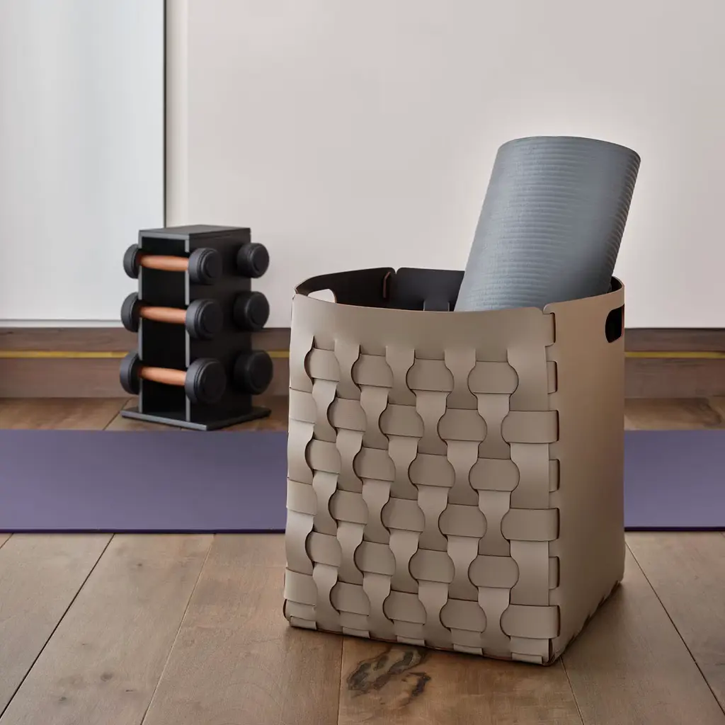 A masterpiece of design and functionality, this elegant basket in rich chocolate features a chunky wave, wicker-inspired pattern of rectangles and squares. The intricate weave ensures both flexibility and durability, while its generous size makes it perfect for storing linen, slippers, blankets, toys, or sports equipment. Crafted by designer Ekaterina Borovkova, this piece blends practical elegance with a modern touch, embodying artisan craftsmanship at its finest.