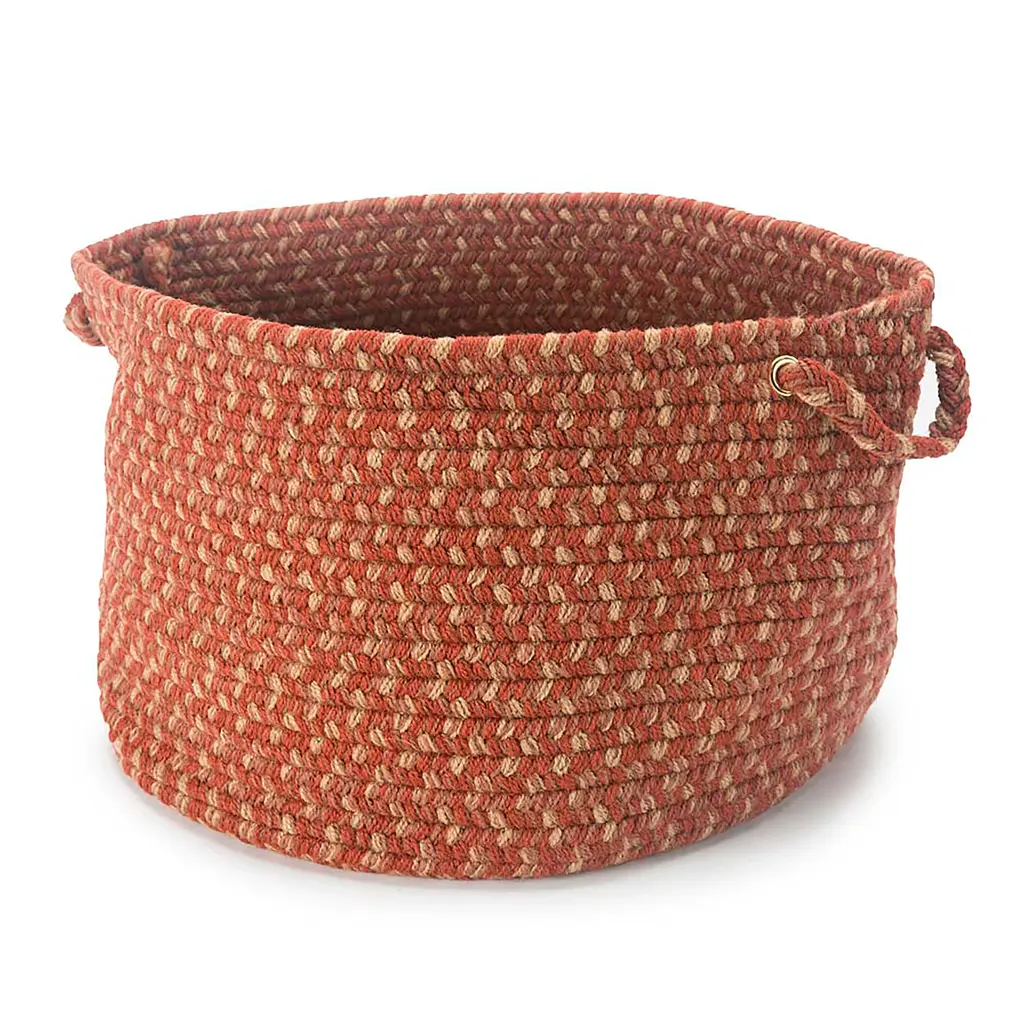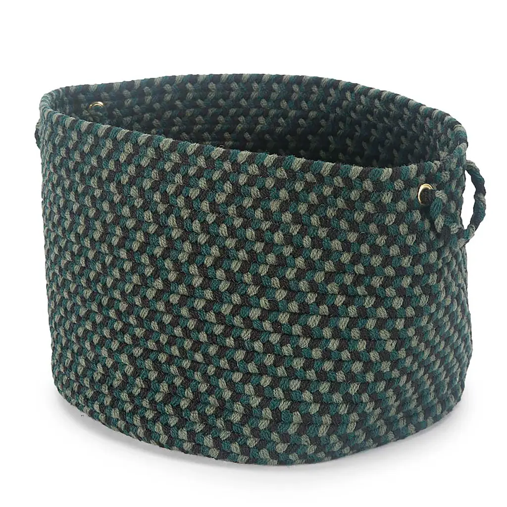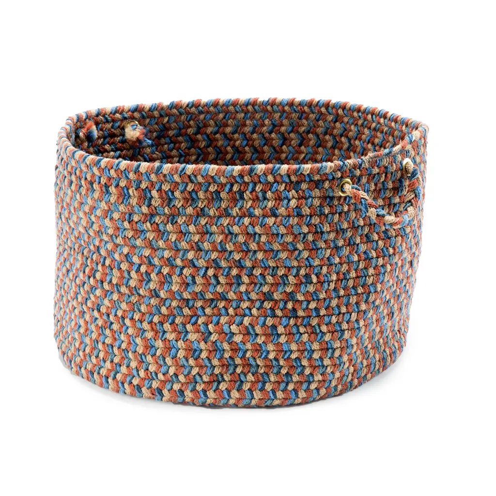 Crafted in New England in true colonial style, our Roanoke Braided Basket is flat braided using texturized polypropylene yarns, which create a wool-like finish and makes it stronger and more flexible.With a woven polypro core, these heavy-weight braids will always retain their shape and strength. Use indoors or out - the colors will always remain bright and true. Plus, they coordinate with our Roanoke Polypro Rugs!Made with pride in the USA by Rhody Rugs, a family run company.Please note: Similar to the coordinating Stair Treads and Chair Pads, the multicolored Baskets are made with the predominant colors of yarn used in our larger Roanoke Braided Rugs. Minor "irregularities" are inherent with all handcrafted products and contribute to their one-of-a-kind appeal. Colors may vary slightly due to dye lot changes. Minimal size and pattern repeat variations are completely normal and to be expected. What may appear to be an irregularity in color or construction is a part of the basket's handmade nature.