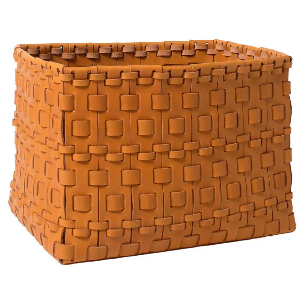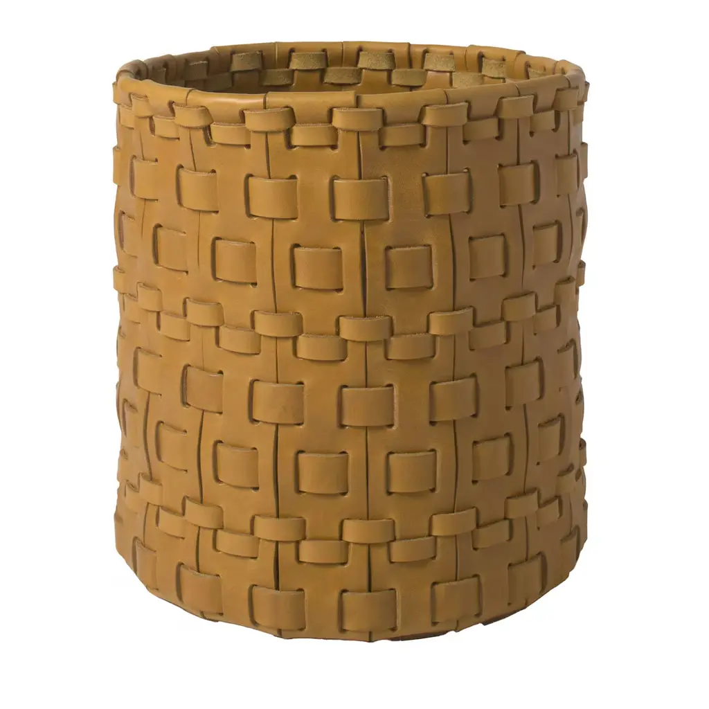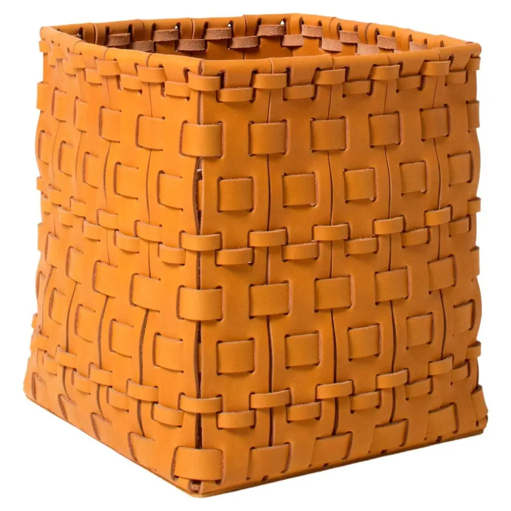 Contemporary predilection for simple lines meets the timeless flair of artisan leatherworking techniques in this superb rectangular-cut basket. Assorted in size yet offered in a solid ocher shade, multiple leather strips are meticulously combined in a twine of exceptional textural and visual charm. Multiple color variants, as well as different shapes, are available, please contact the Concierge for more details.