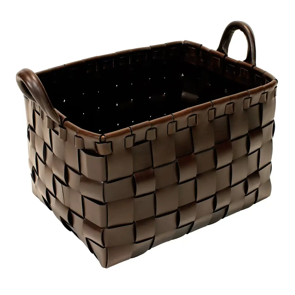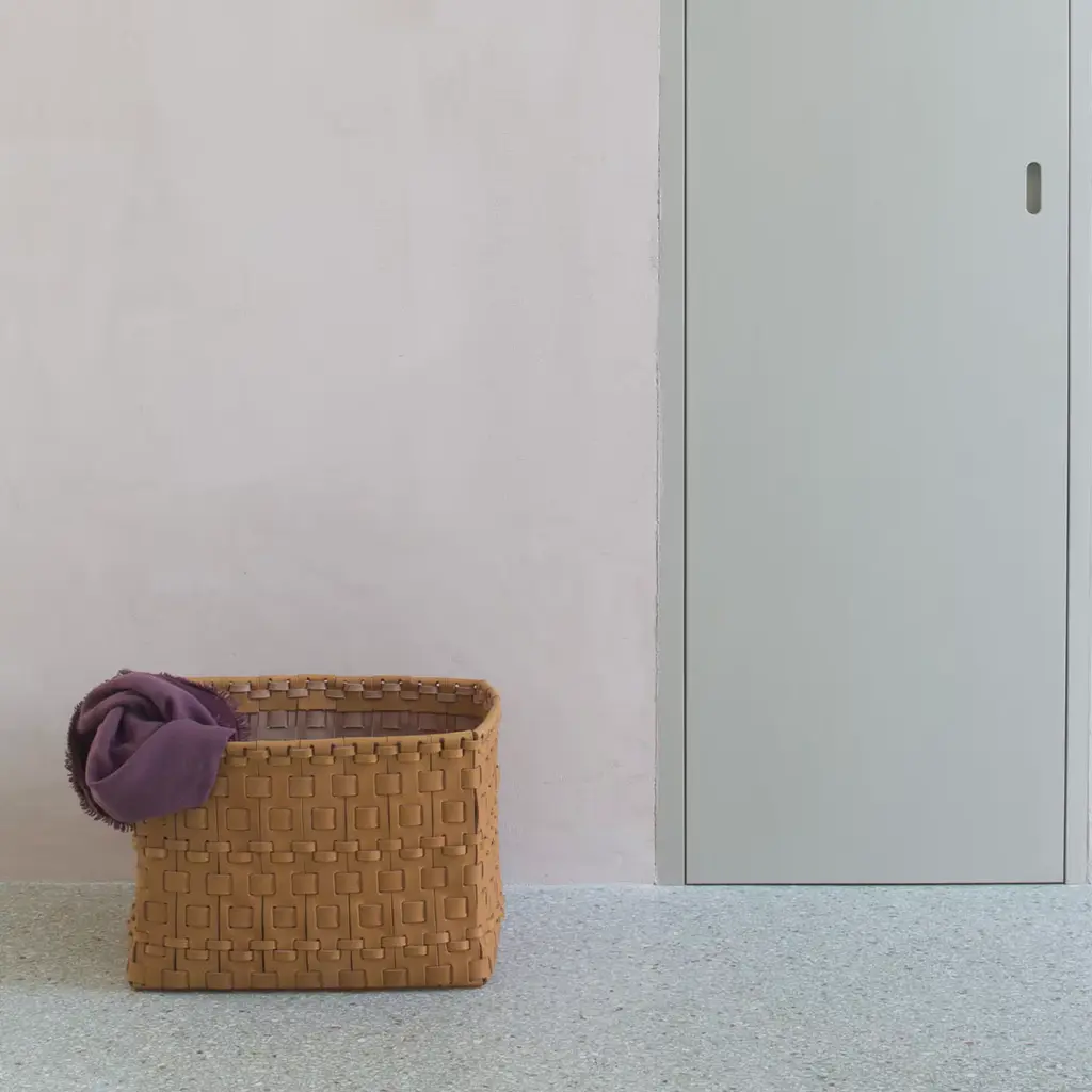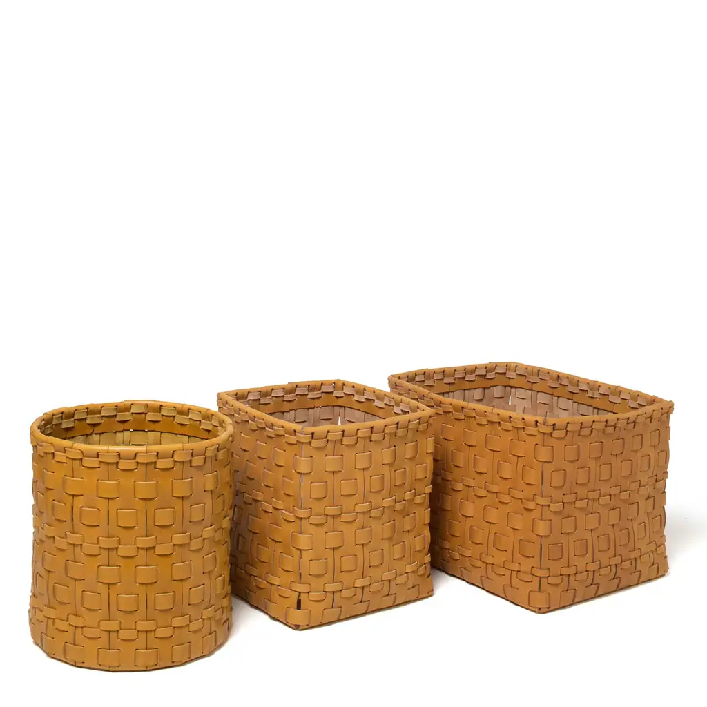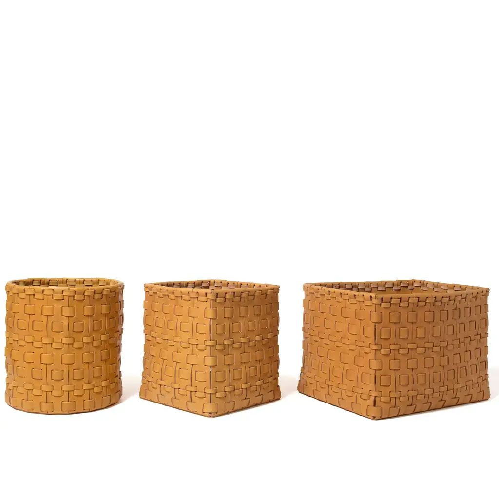 Contemporary predilection for simple lines meets the timeless flair of artisan leatherworking techniques in this superb rectangular-cut basket. Assorted in size yet offered in a solid ocher shade, multiple leather strips are meticulously combined in a twine of exceptional textural and visual charm. Multiple color variants, as well as different shapes, are available, please contact the Concierge for more details.