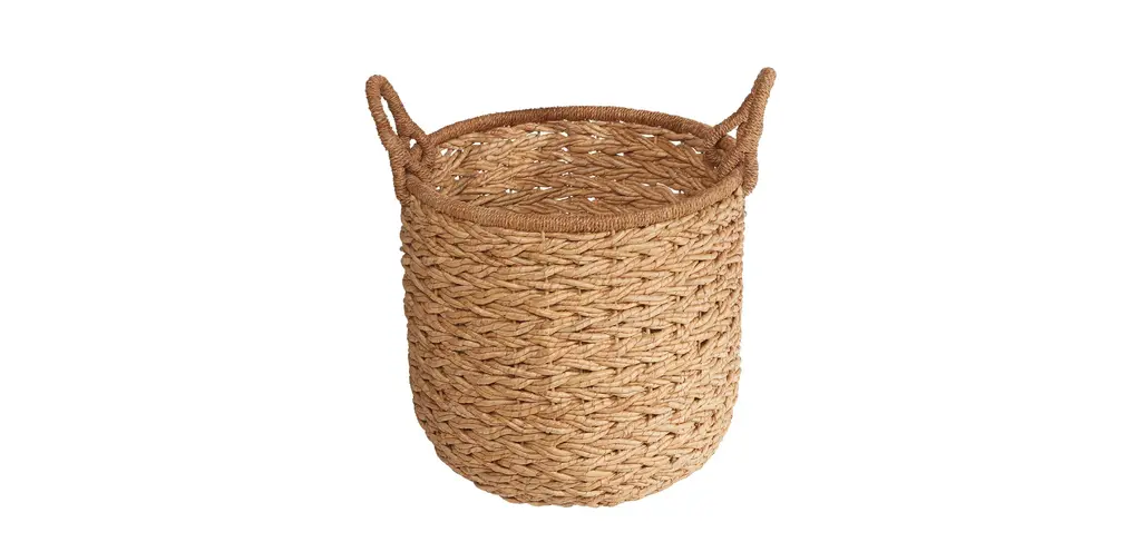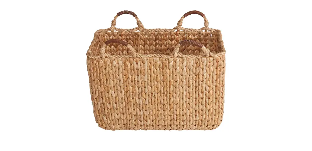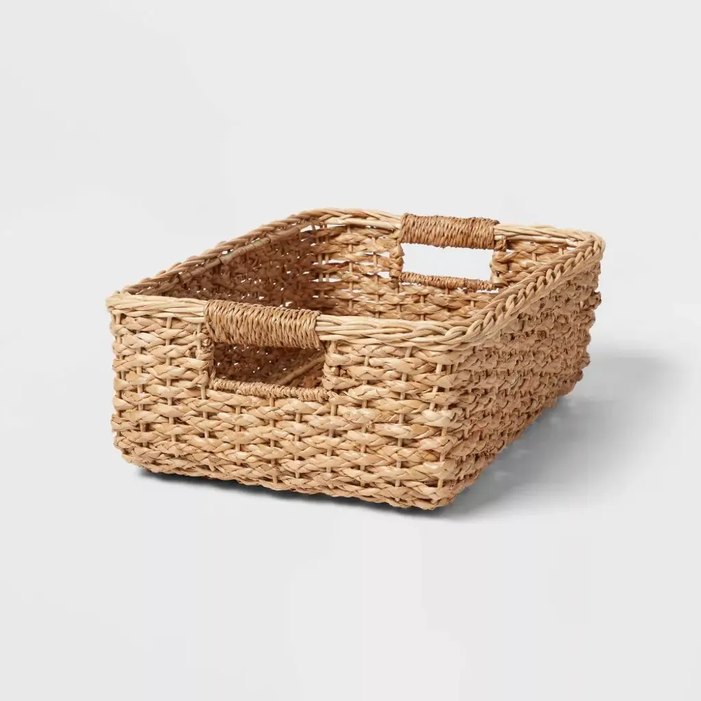 Make a practical addition to your home decor with the Braided Water Hyacinth Folio Basket with Faux-Leather Handles from Threshold™. Woven from water hyacinth, this natural folio basket features a braided design with a brown stripe for visual appeal. It's designed in a rectangular shape with an open top, making it great for stashing toys, books and other items you want to have close at hand in one spot. You can display this braided folio basket on a tabletop or on a shelf to save space and easily move it with the built-in faux-leather handles. Threshold™: Looks like home, feels like you.Interior Dimensions: 5.75 Inches (H) x 11.5 Inches (W) x 16.5 Inches (L)