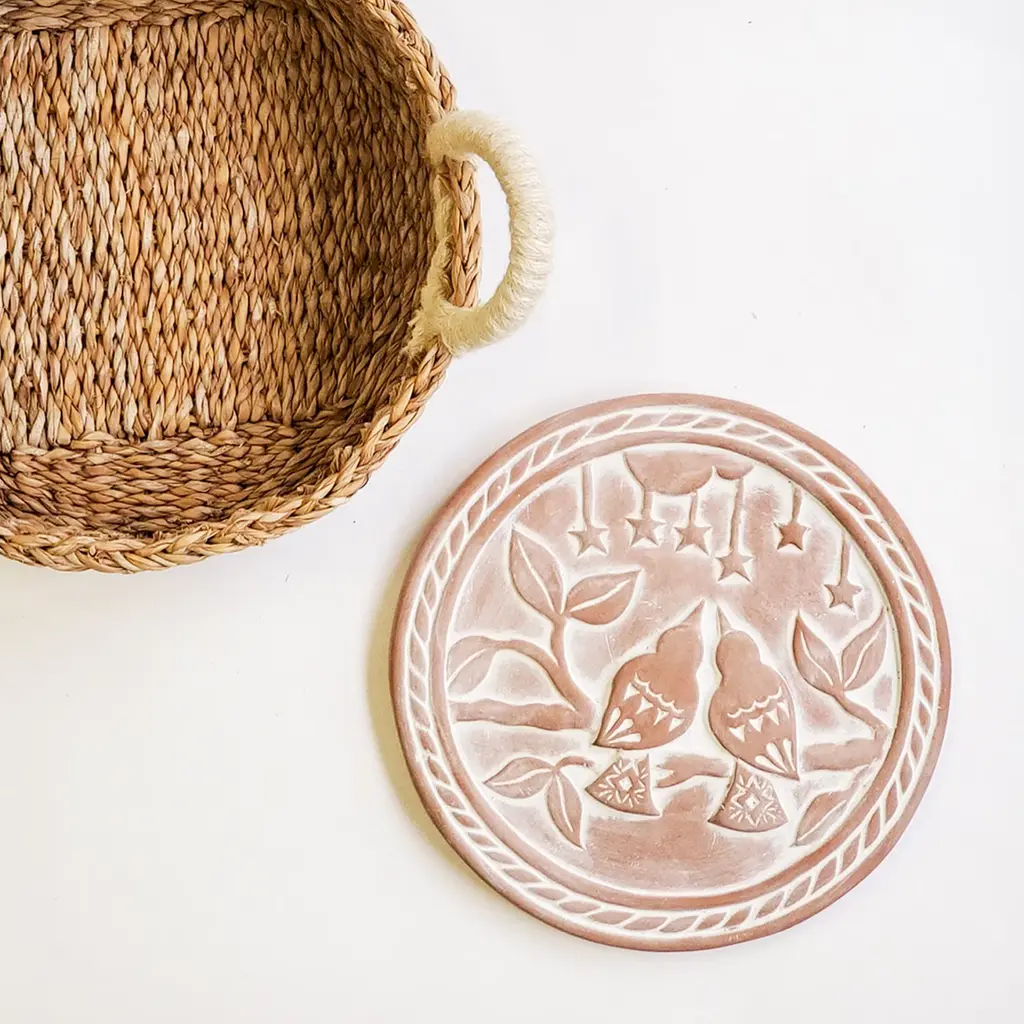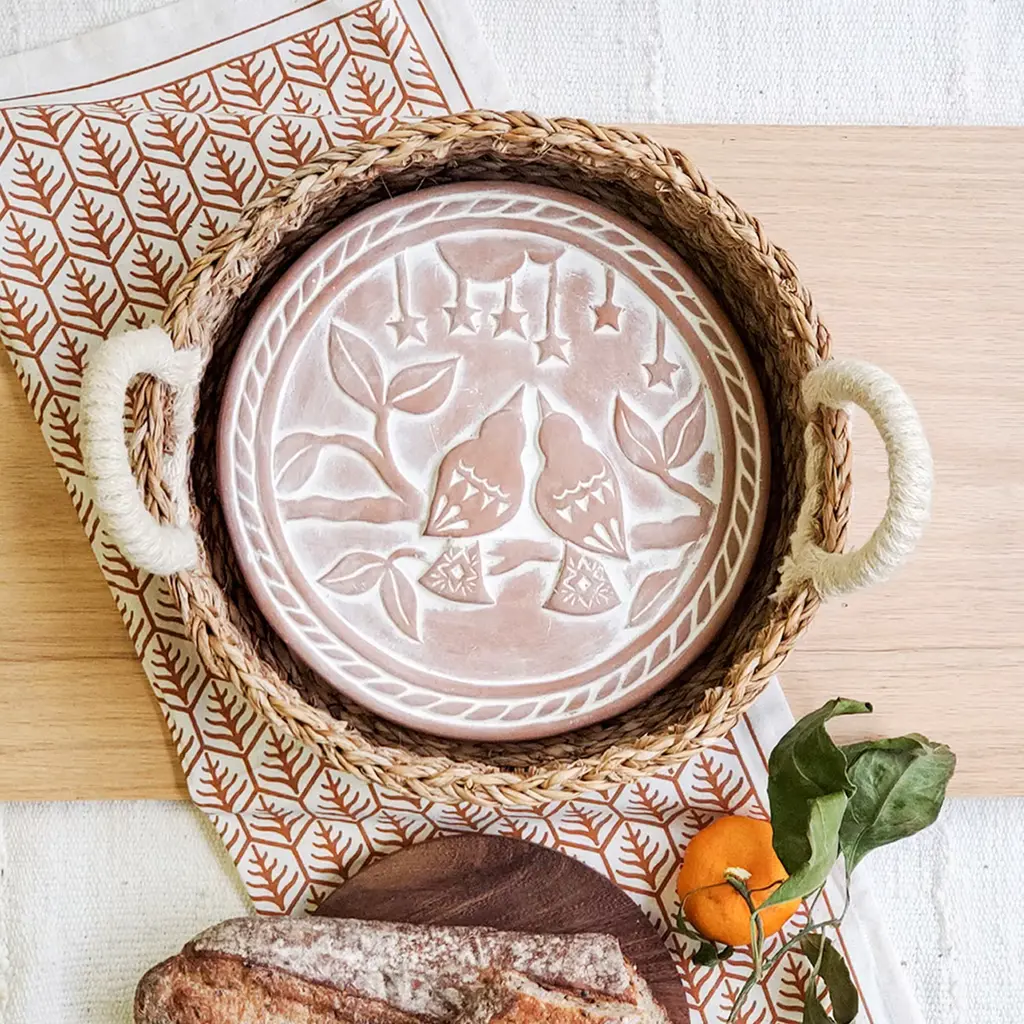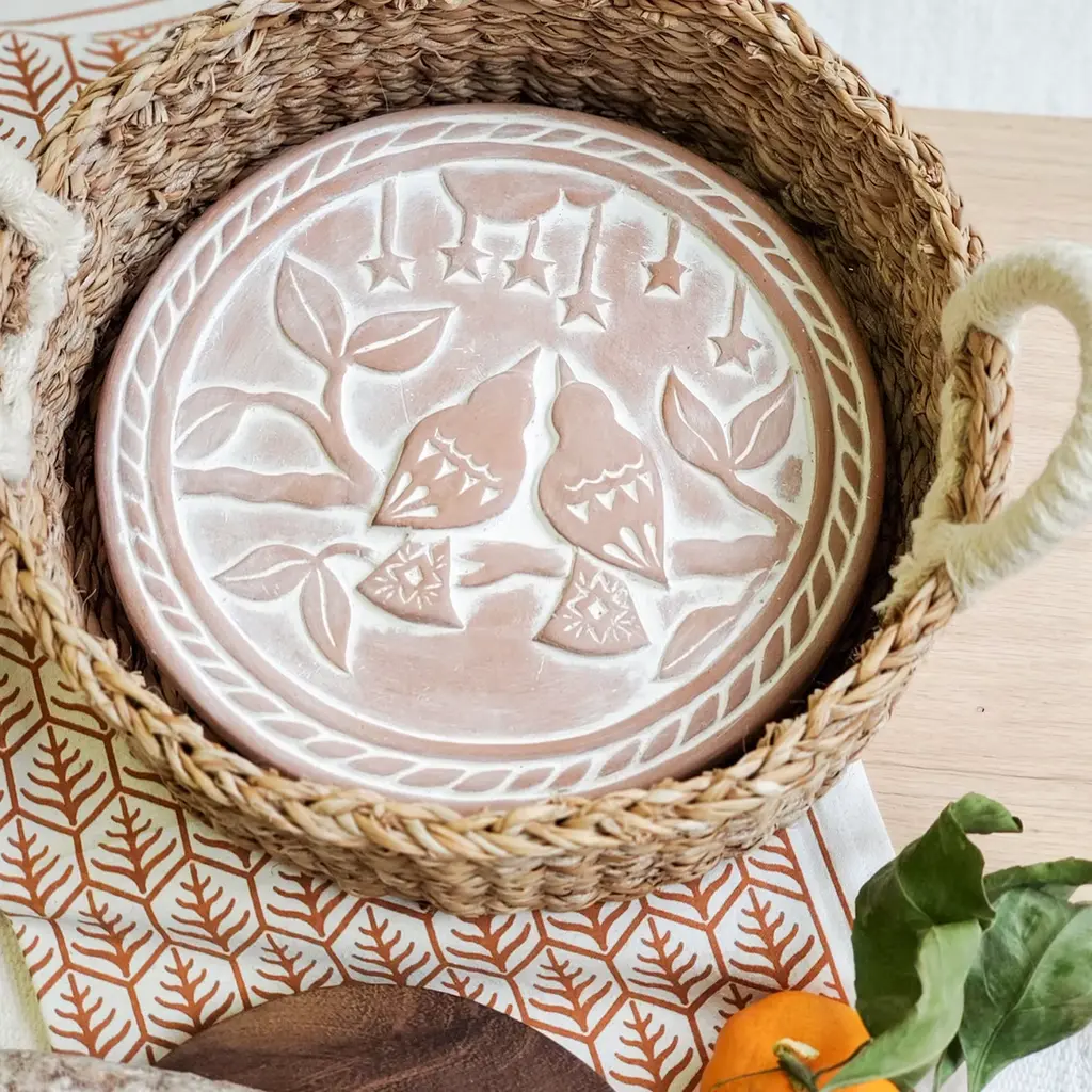 There’s nothing quite like the smell of warm bread on the weekend. Here, our terracotta plate has been engraved with lovebirds and cut to fit neatly into a round basket. This special bread warmer is naturally insulating, and the basket itself has been handwoven from sustainably grown seagrass. It’s the best gift item for anyone who loves bread!Each product is designed and curated by KORISSA, sustainably handmade by Fair Trade artisans in Bangladesh.