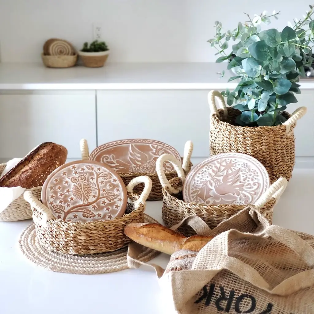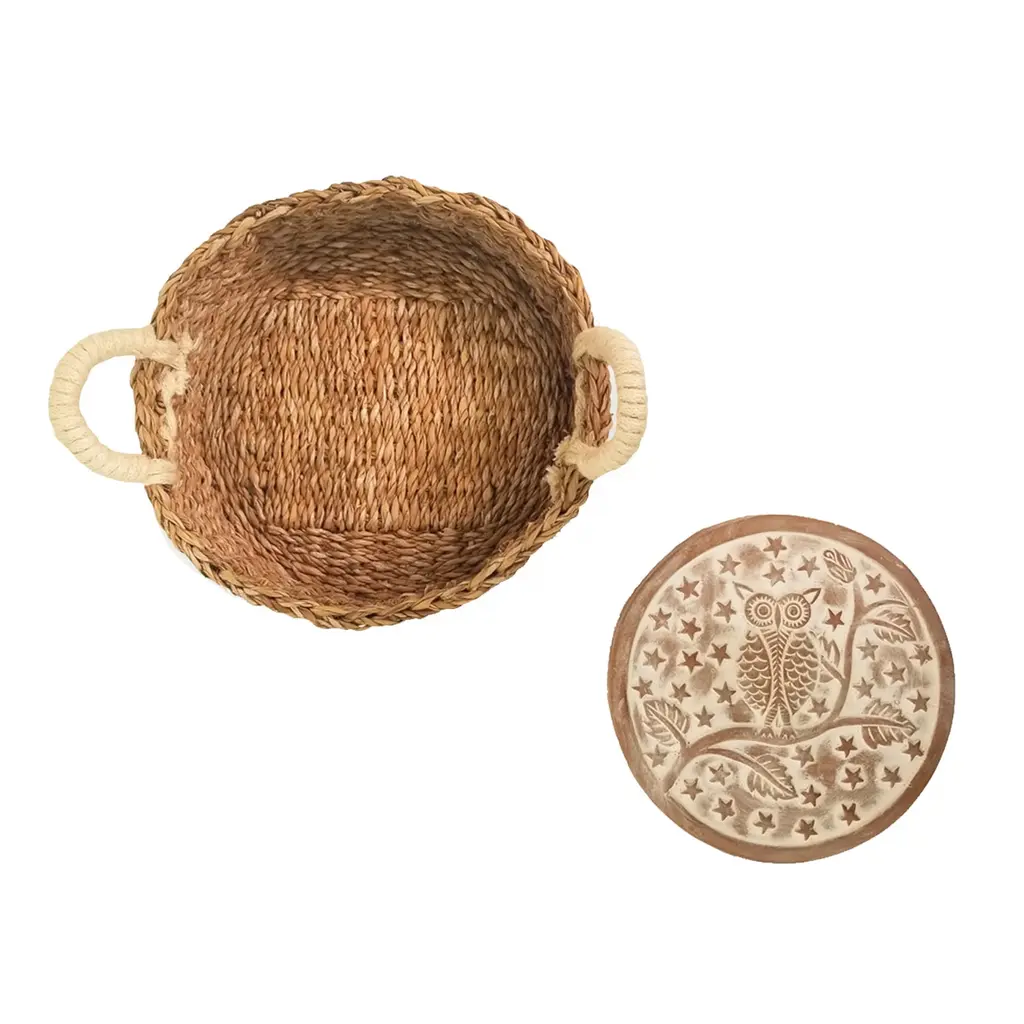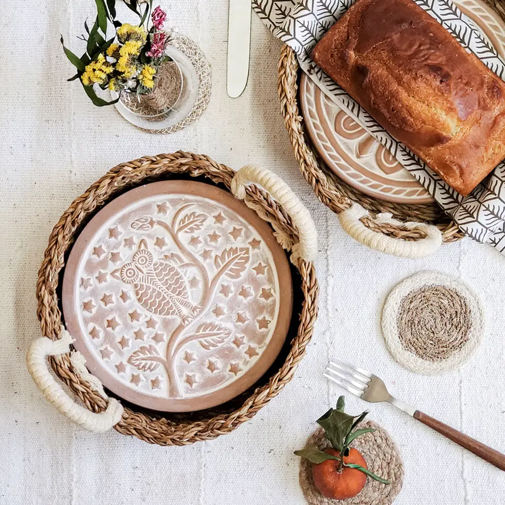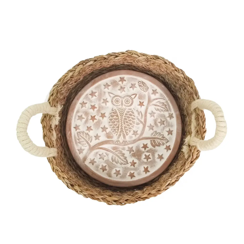 There’s nothing quite like the smell of warm bread on the weekend. Here, our terracotta plate has been engraved with a cute owl on a tree design and cut to fit neatly into a round basket. This special bread warmer is naturally insulating, and the basket itself has been handwoven from sustainably grown seagrass. It’s the best gift item for anyone who loves bread!Each product is designed and curated by Korissa, sustainably handmade by Fair Trade artisans in Bangladesh.