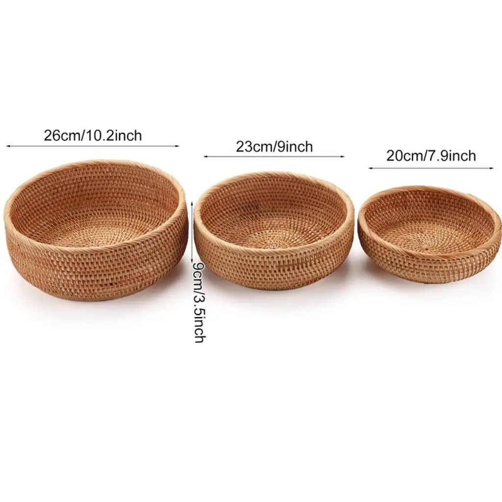 Brinjoy 3-piece Stackable Round Rattan Basket Set - Natural Woven Storage Bowls For Fruits, Keys, Kitchen Counter (10.2", 9", 7.9")