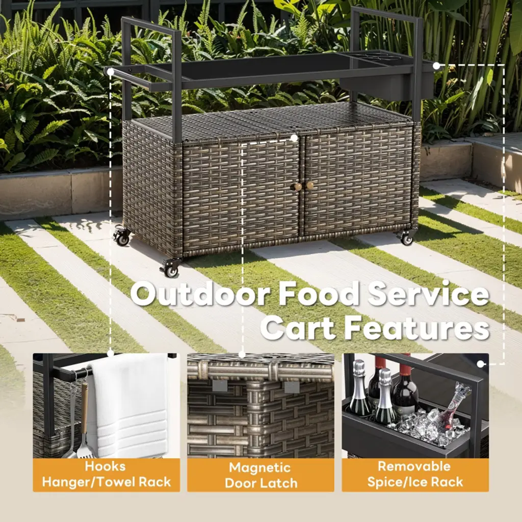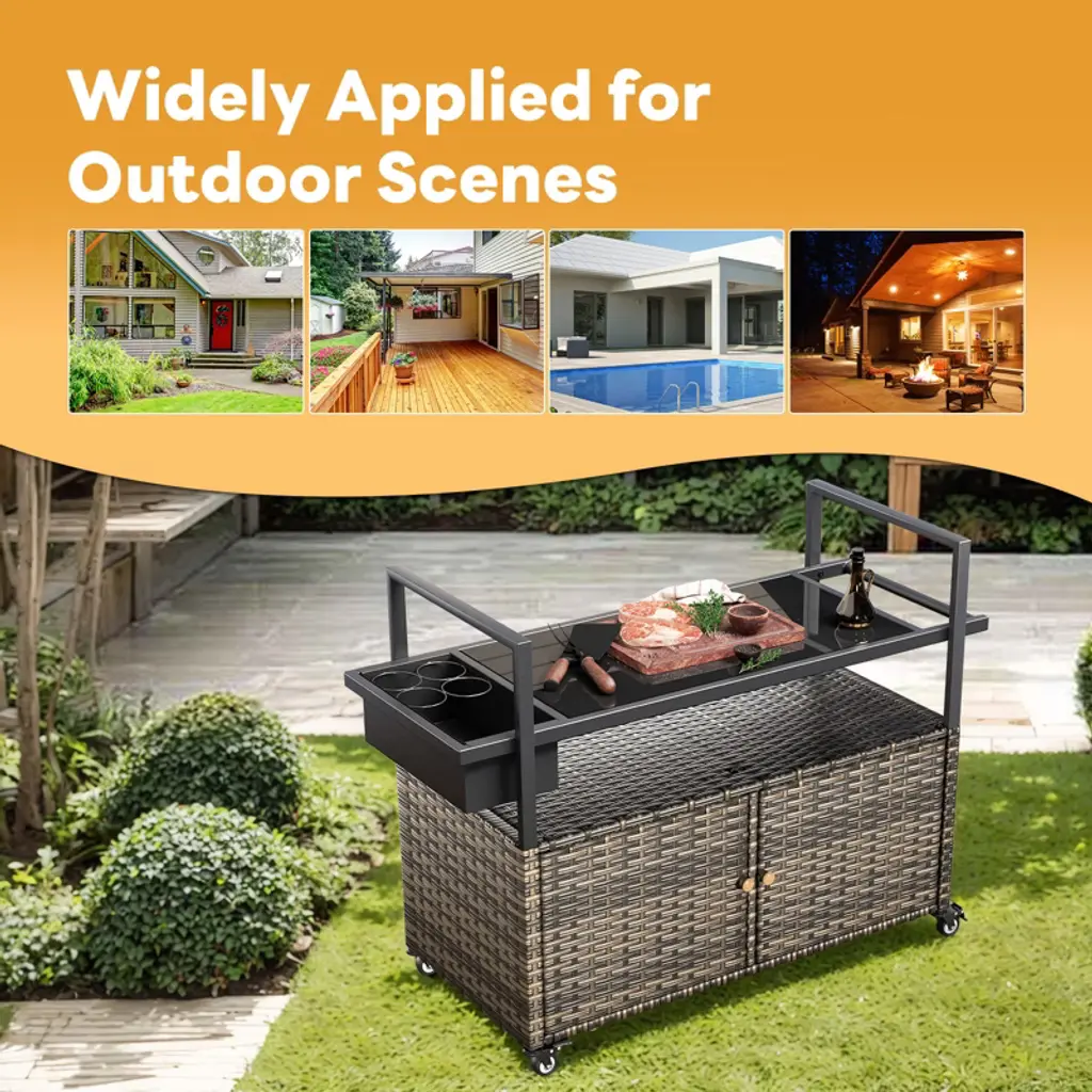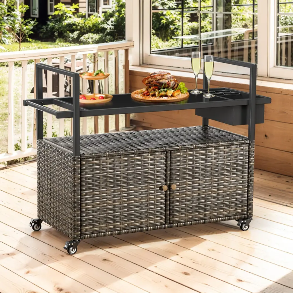 Elevate your outdoor entertaining with the Buenhomino Outdoor Kitchen Island. This versatile cart combines a sleek, tempered glass top with a spacious, lockable wicker storage cabinet. Featuring four locking wheels and a convenient side basket, it¡¯s the perfect mobile solution for your patio, poolside, or backyard BBQ, blending elegant design with all-weather durability.