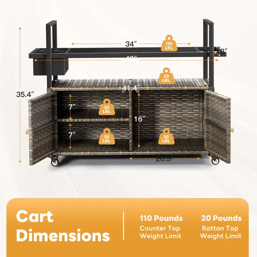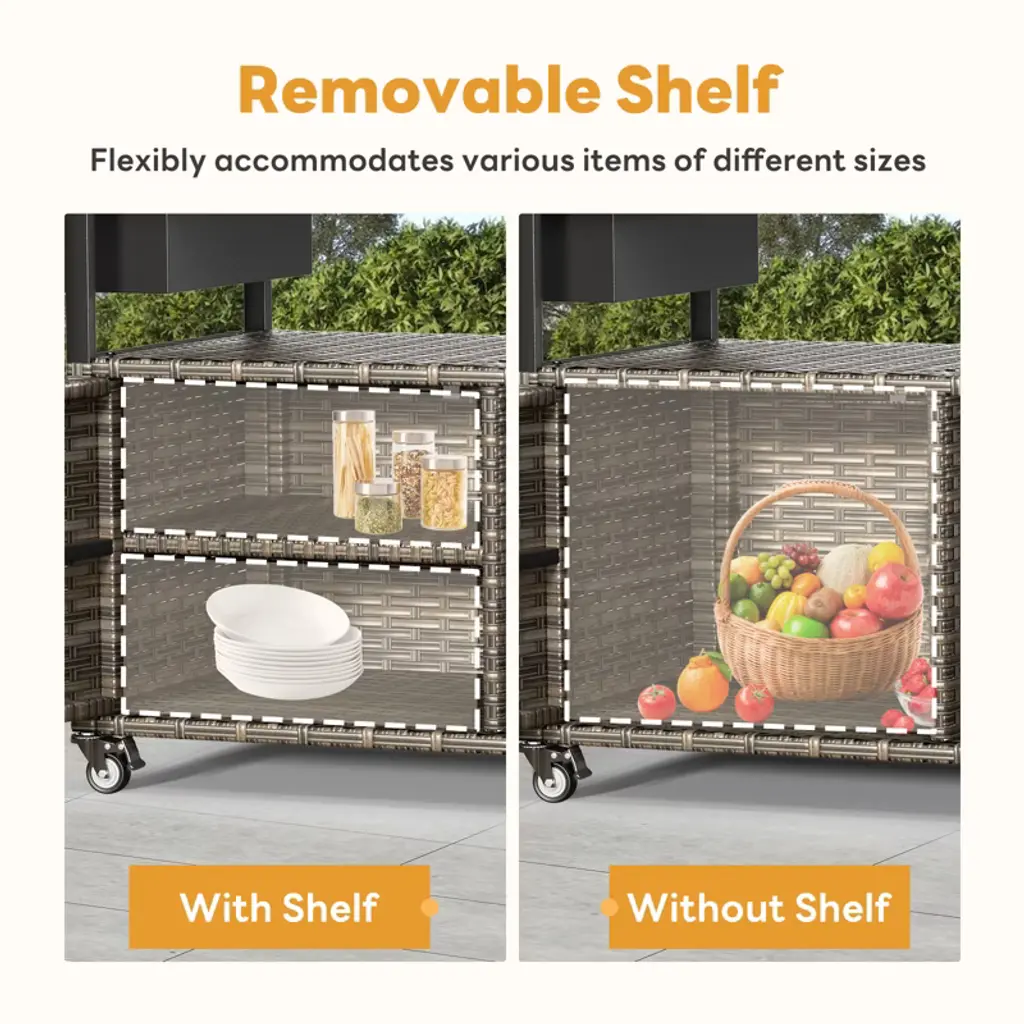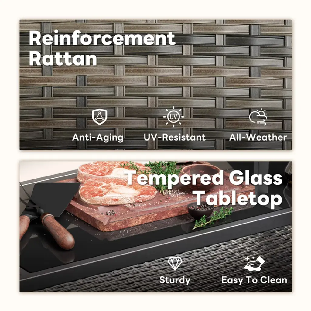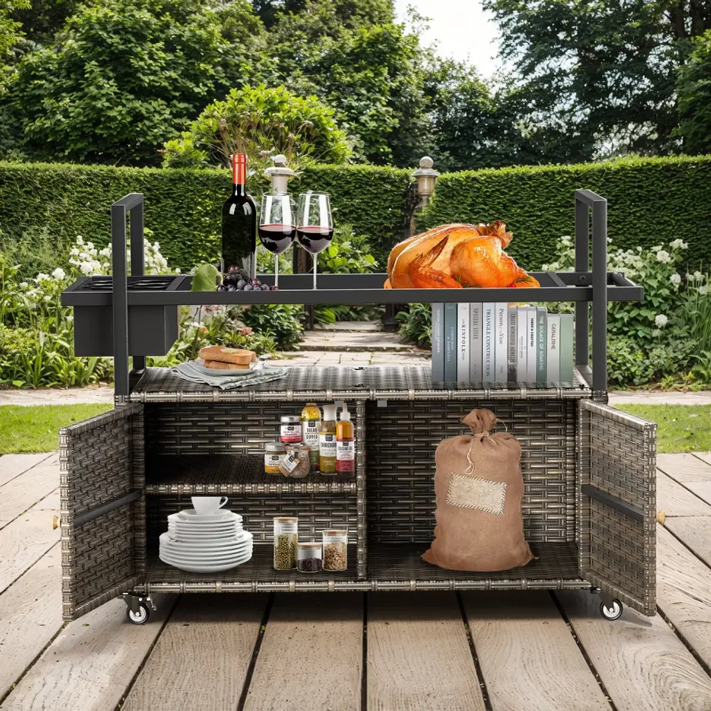 Elevate your outdoor entertaining with the Buenhomino Outdoor Kitchen Island. This versatile cart combines a sleek, tempered glass top with a spacious, lockable wicker storage cabinet. Featuring four locking wheels and a convenient side basket, it¡¯s the perfect mobile solution for your patio, poolside, or backyard BBQ, blending elegant design with all-weather durability.