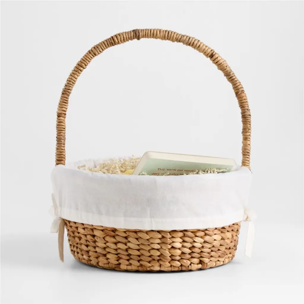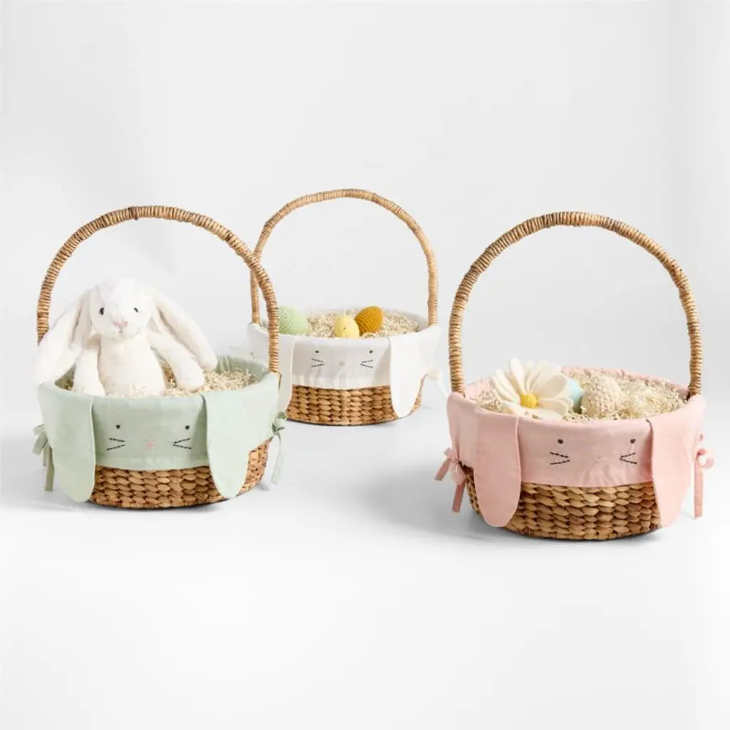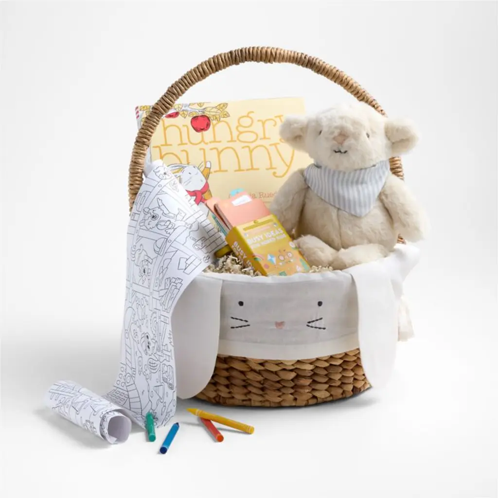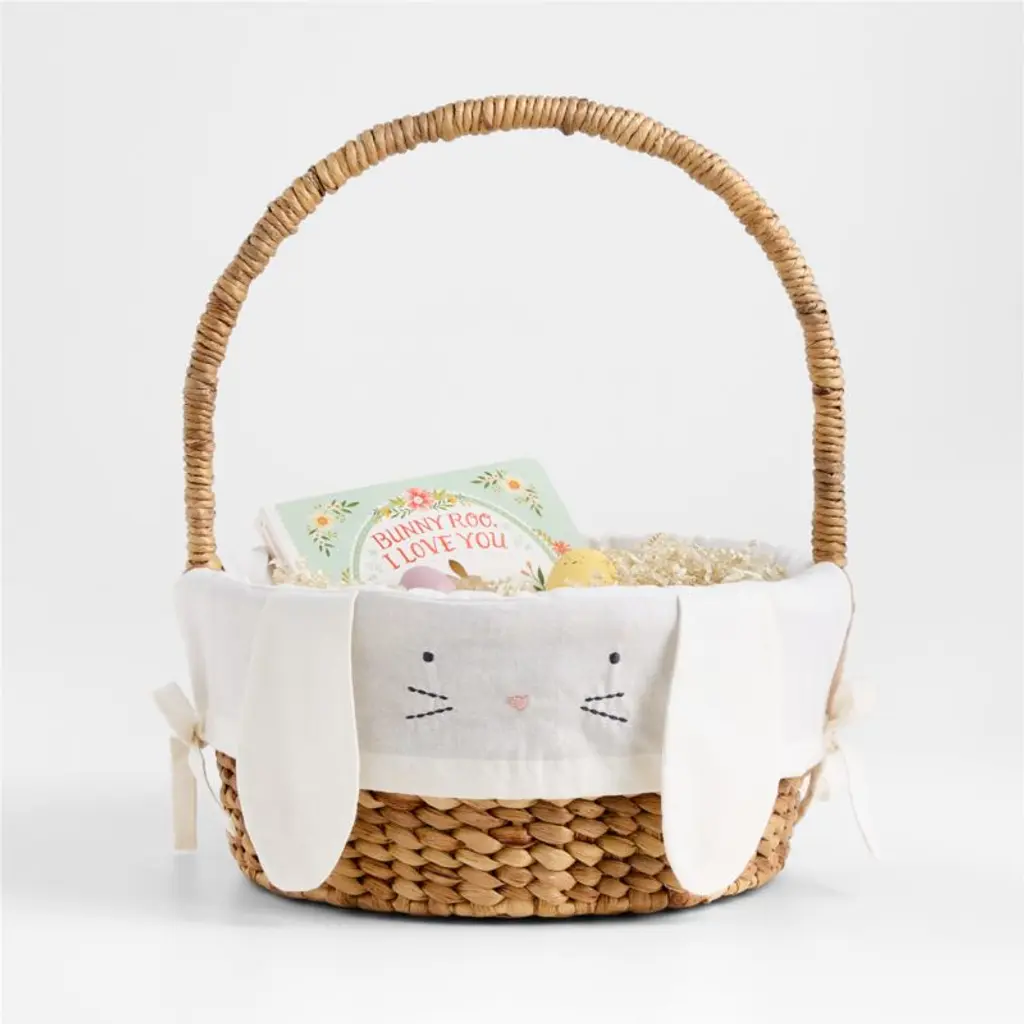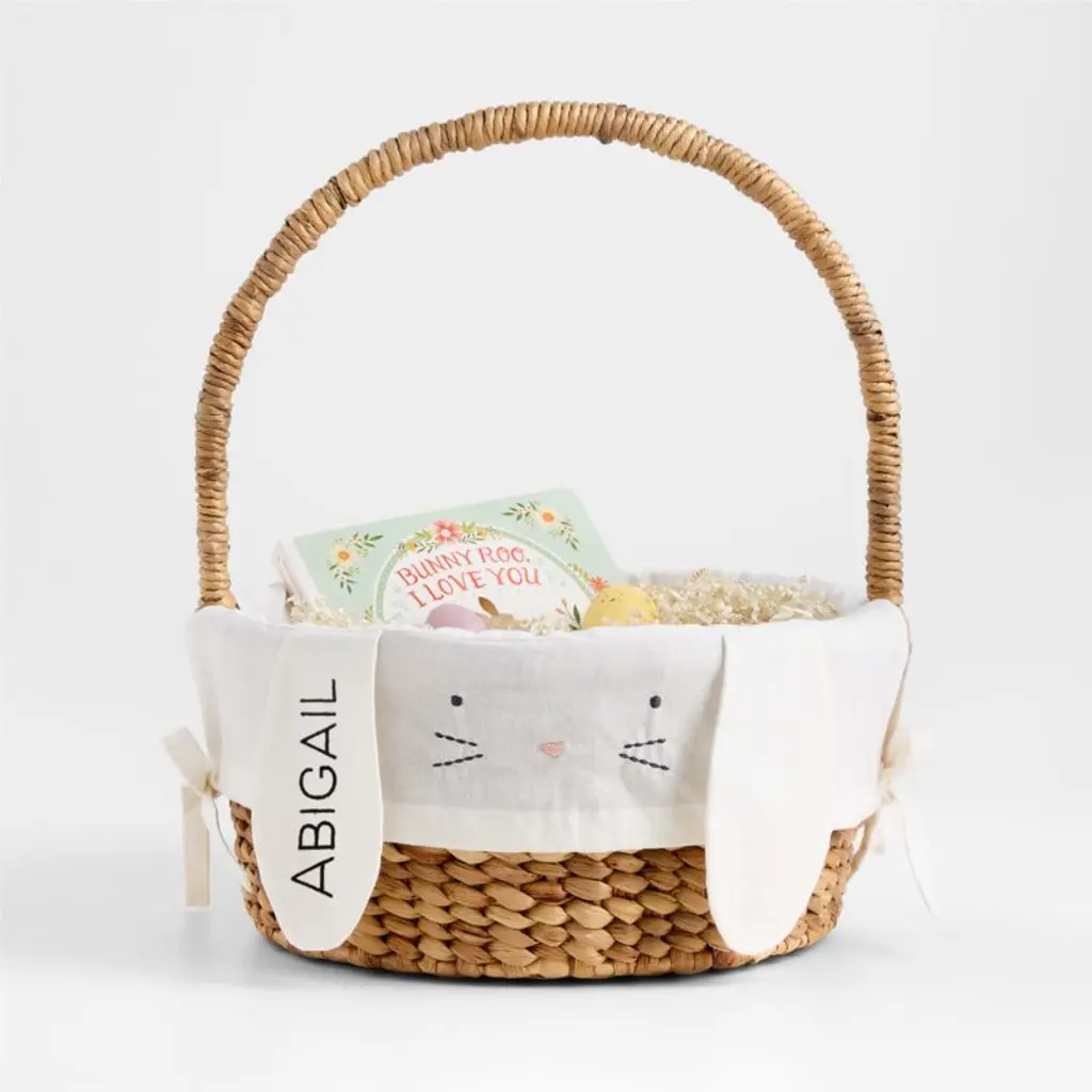 Kids will leap at the chance to hunt for sweet surprises with this floppy-eared Easter Basket Liner, decorated with a cute bunny face. A springtime essential, the soft ivory organic cotton can be embroidered with a name or initials on the back so kids can keep track of whose basket is whosetreats, toys and books will practically hop right in!