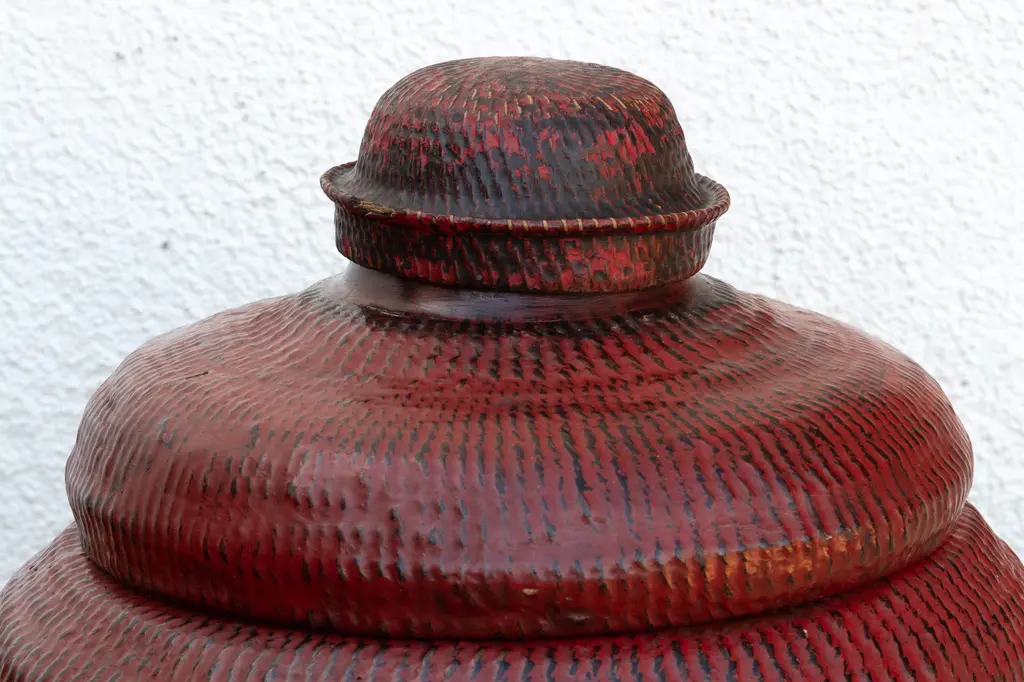 This antique Burmese lacquered container, a captivating blend of artistry and cultural heritage, invites a touch of Eastern elegance into your home. Likely dating back to the 19th century, this container showcases the rich red lacquer so often associated with royalty, spirituality, and auspiciousness in Burmese culture. The meticulous application and lustrous sheen speak to the dedication of Burmese artisans.