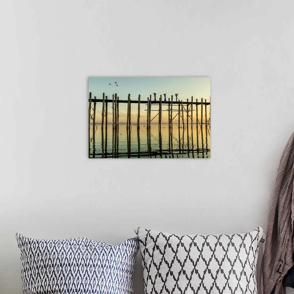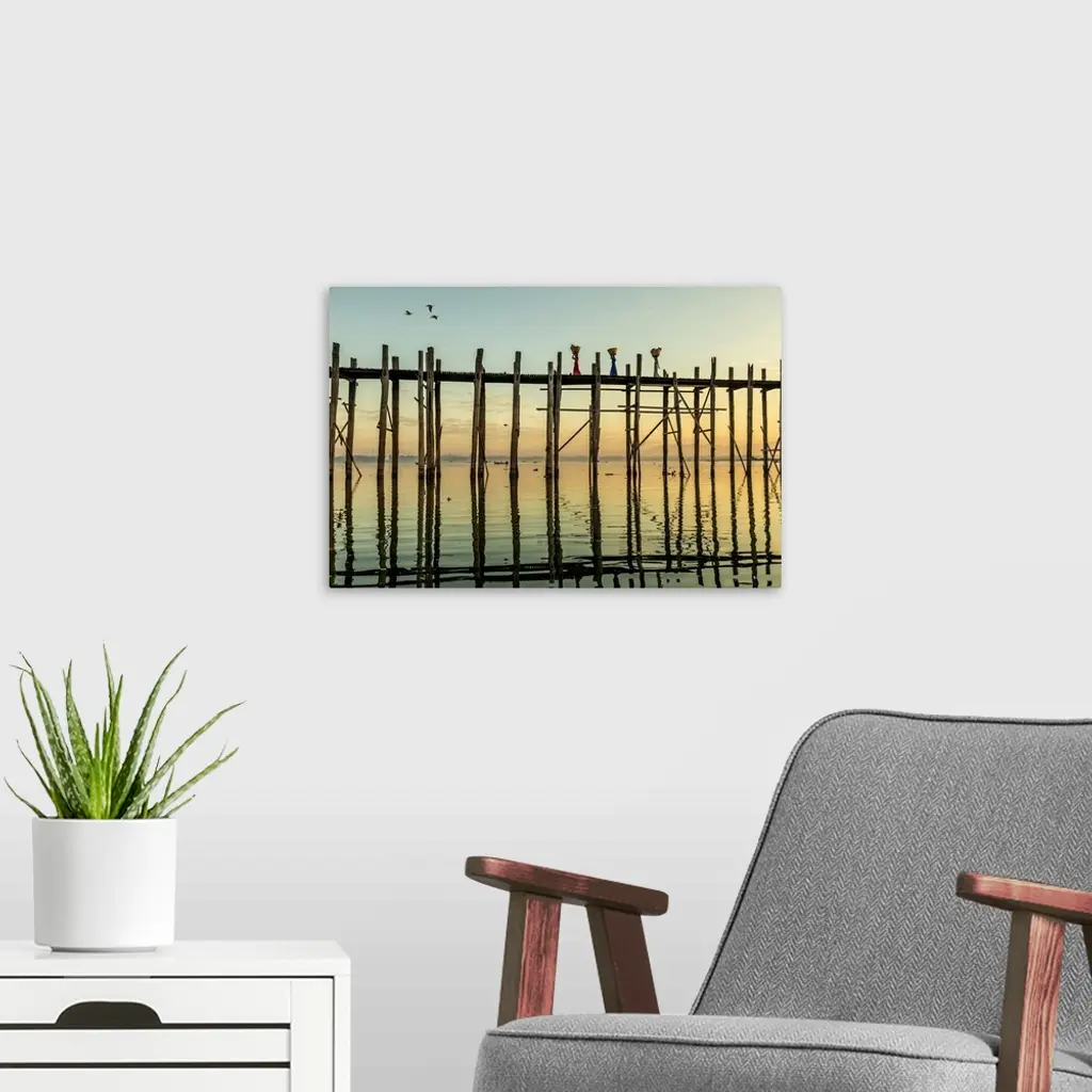 Burmese women walking with baskets on the Ubein Bridge in Mandalay