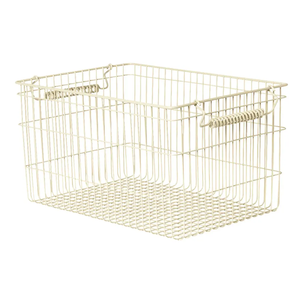 Inspired by the Spanish word `Cala' meaning `creek,' this stackable mesh basket is crafted from powder coated iron. Serving as a functional storage solution, it befits a number of environments, whether used in the office for organizing supplies, the bathroom for toiletries, or the kids' room for toys. Merging versatility with a touch of refinement, its unique feature is its distinctive metal spiral handle, which adds a decorative element while providing a comfortable grip. Stack maximum 3 baskets on top of each other.