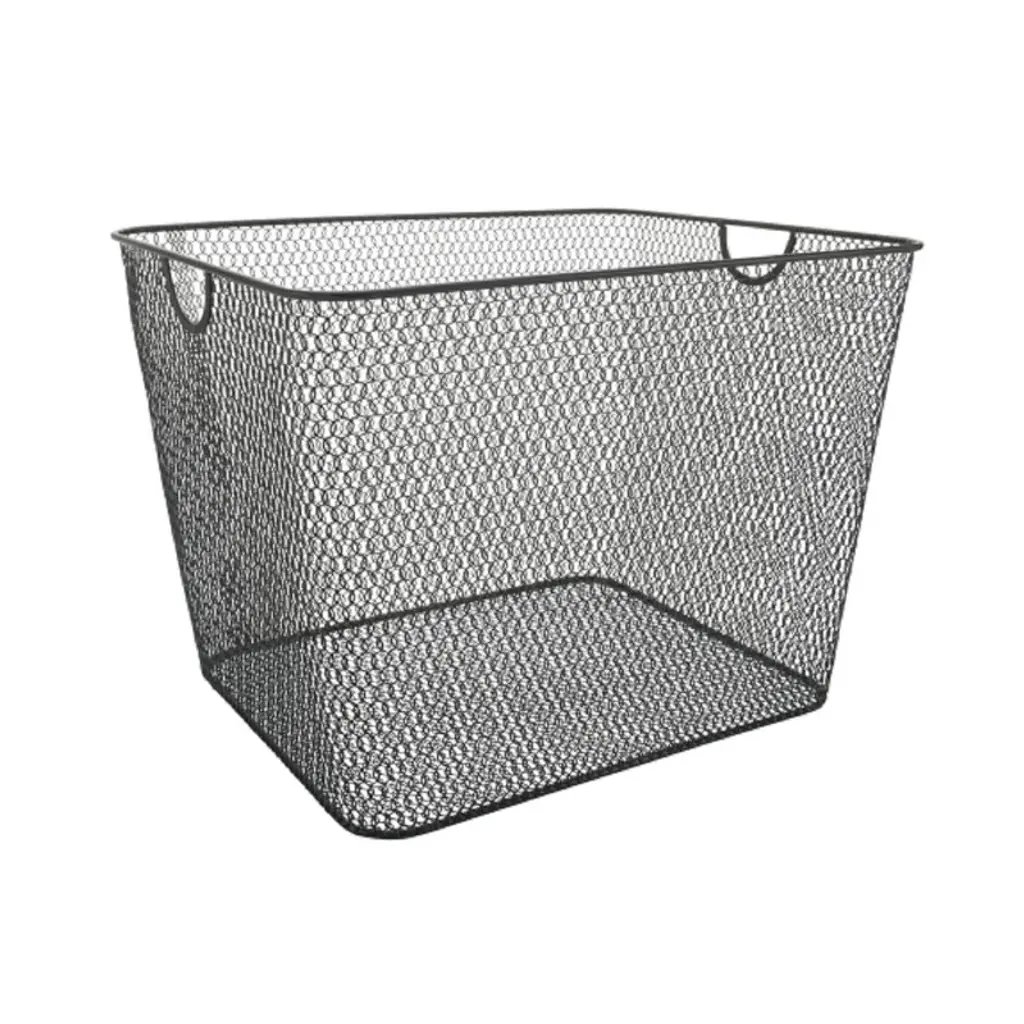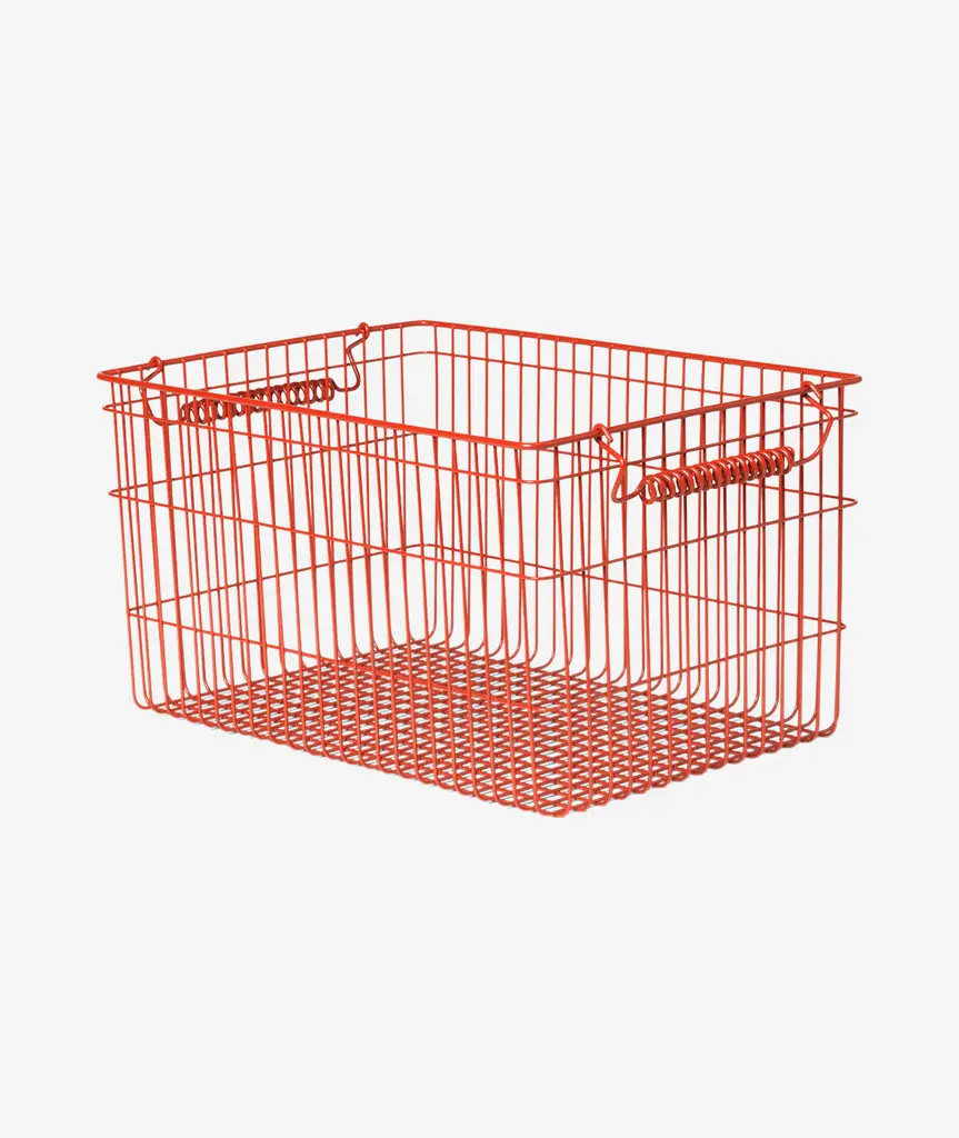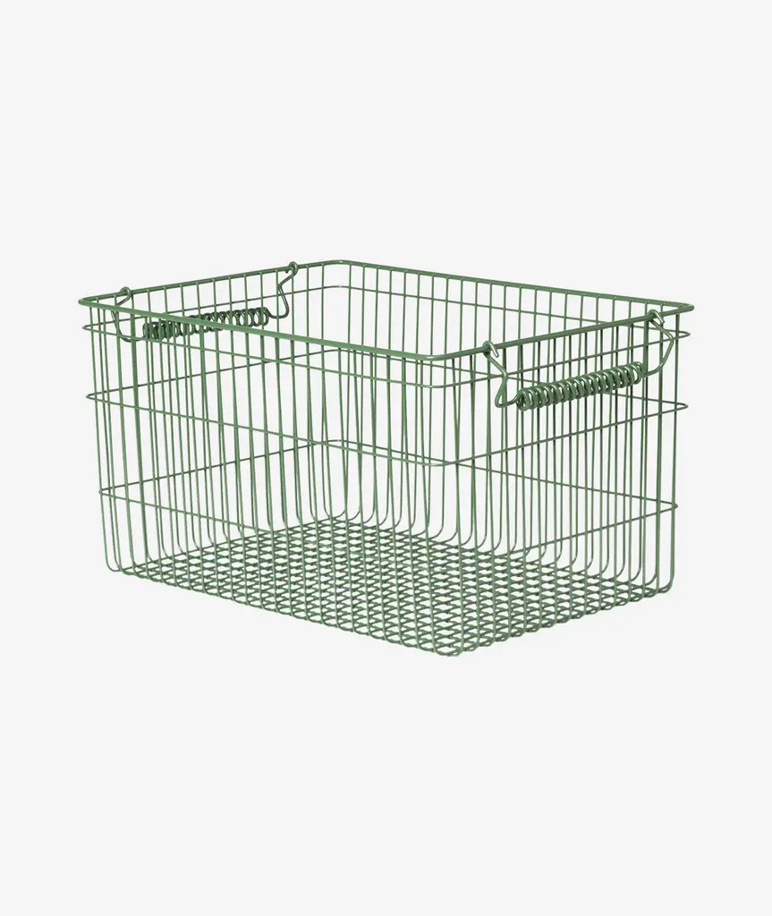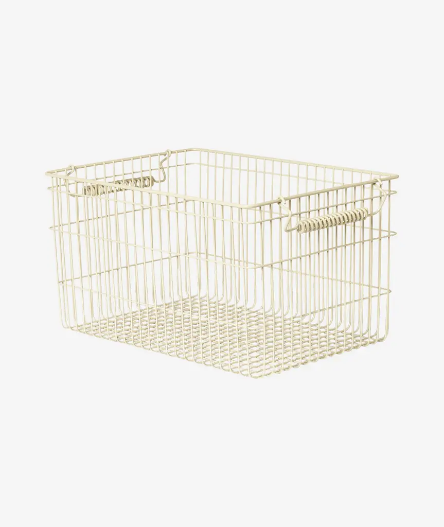 Inspired by the Spanish word ‘*Cala*’ meaning ‘creek,’ this stackable mesh basket is crafted from powder coated iron. Serving as a functional storage solution, it befits a number of environments, whether used in the office for organizing supplies, the bathroom for toiletries, or the kids' room for toys. Merging versatility with a touch of refinement, its unique feature is its distinctive metal spiral handle, which adds a decorative element while providing a comfortable grip. *Please note - this item is expected to be available for shipping in early March, 2025