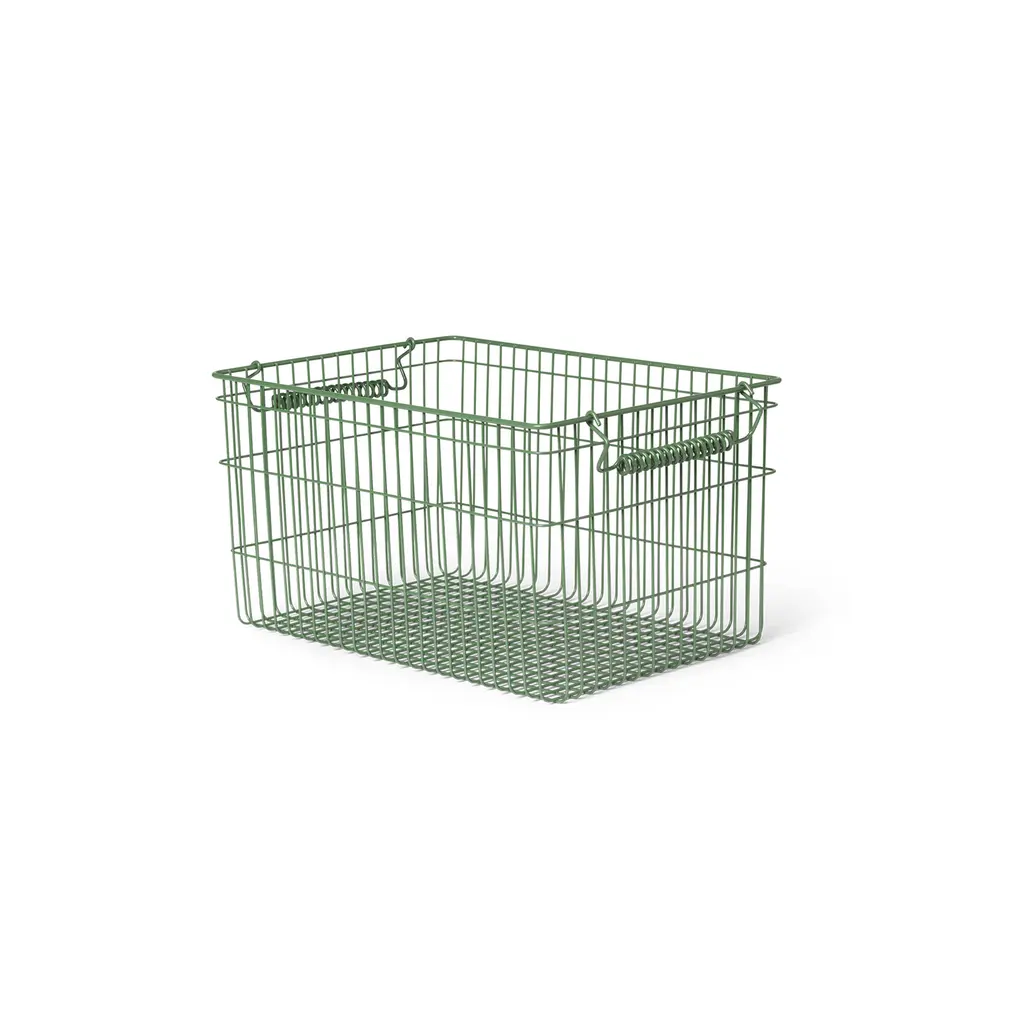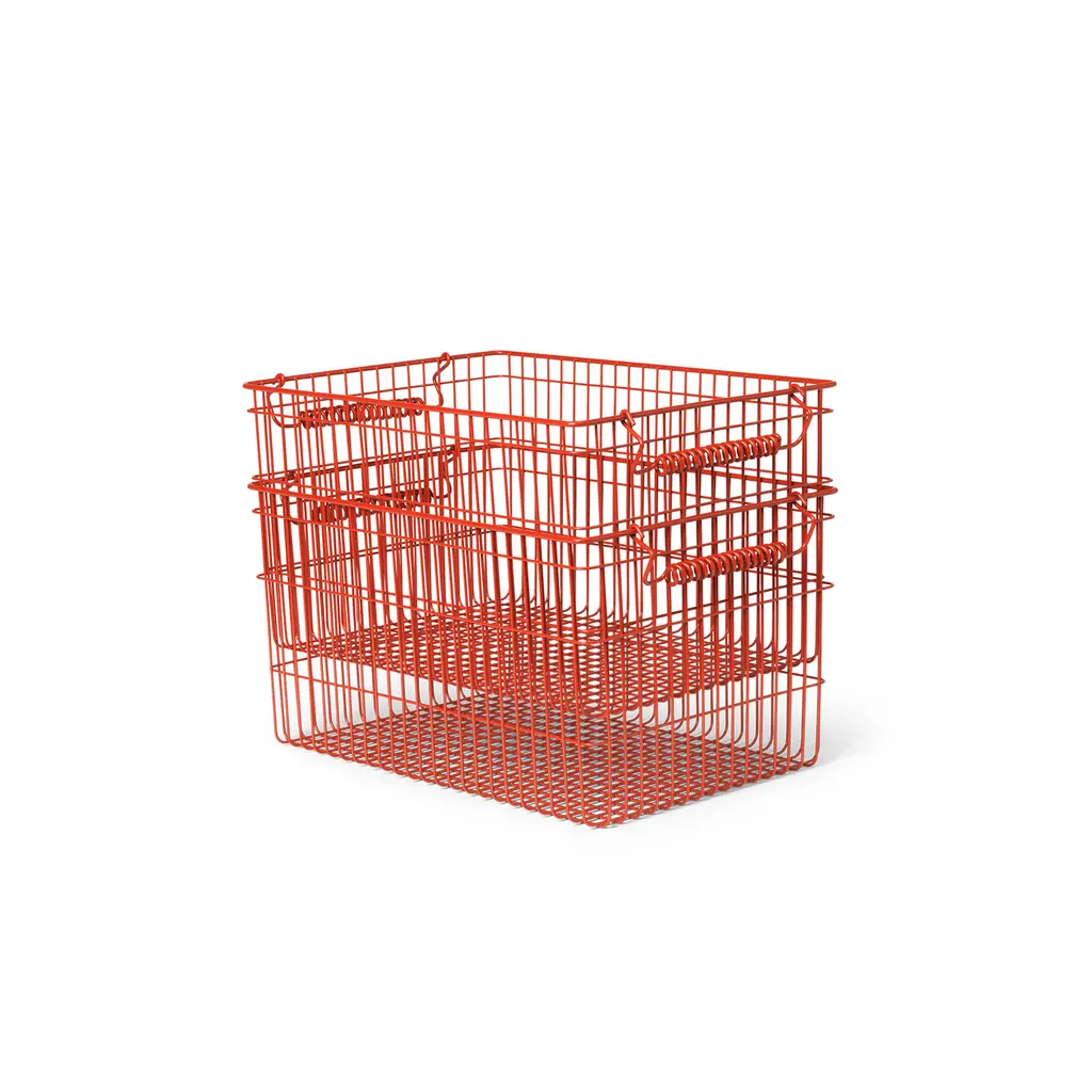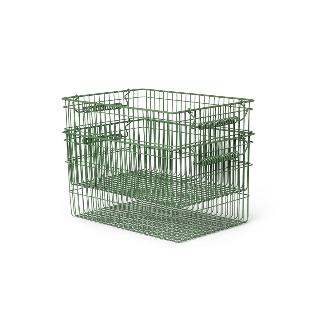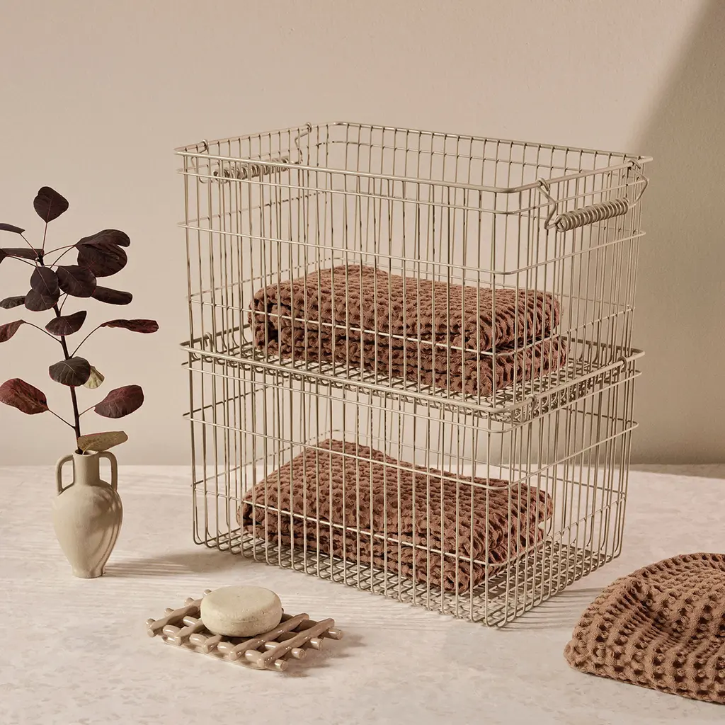Drawing inspiration from the Spanish word for ‘creek,’ the Ferm Living Cala Stackable Baskets offer a stylish and practical storage solution for your home. The design is simple but distinctive at the same time, with the handle boasting a metal spiral reminding of a creek’s rushing water. The rounded shapes of the handles not only add a decorative accent, but also provide a comfortable way to carry these baskets around the home. The powder-coated iron is durable, resistant to wear, and comes in different color finishes. Rectangular and tall, the Cala baskets are both spacious and versatile. Use them in the kitchen to store accessories and towels; in the bathroom for essentials and toiletries; in a home office for supplies and desk items; or in a child’s room to organize toys. Regardless, the Ferm Living Cala Stackable Baskets are incredibly practical and can be easily stacked three baskets high to save storage space.