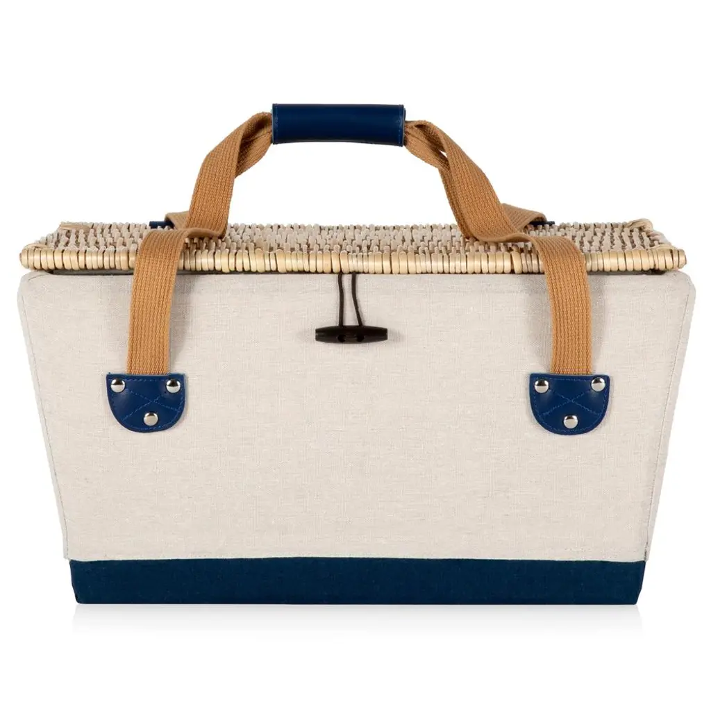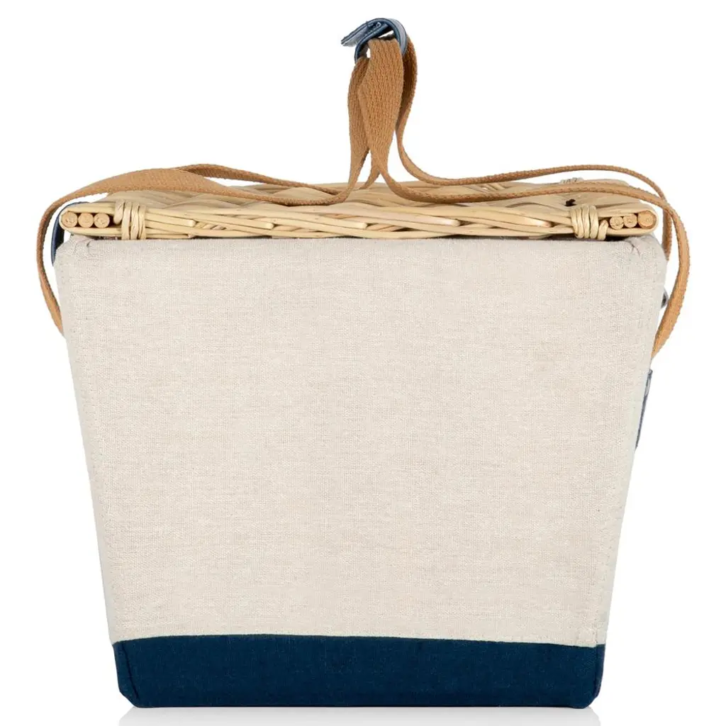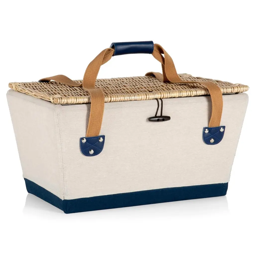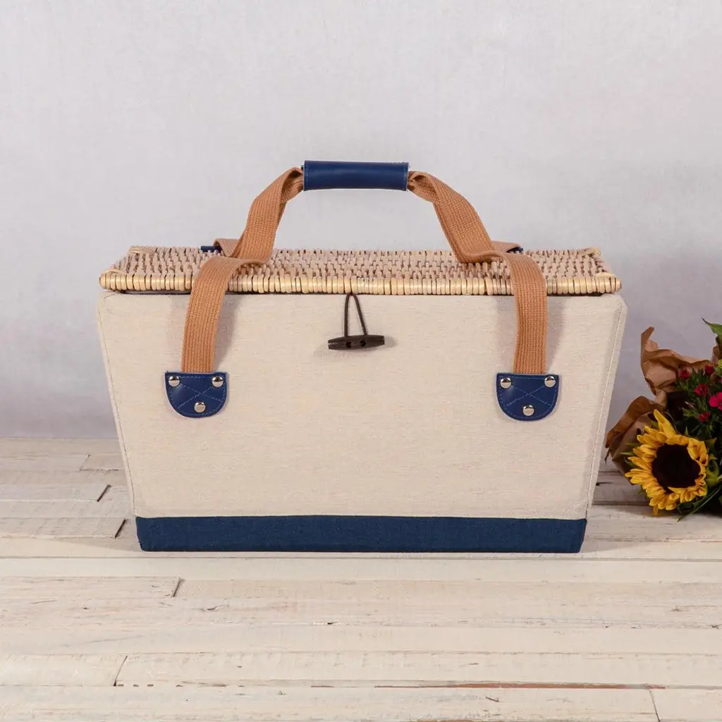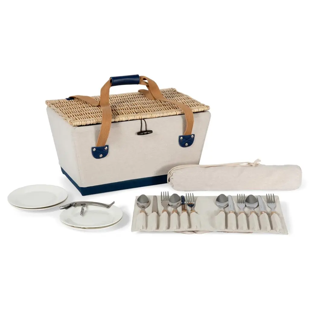 Callie Coastal Beach Beige Canvas Willow Picnic Basket With Serveware For 4