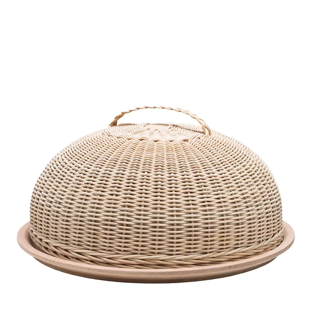 Merging the polished flair of pyrex glass with the raw, textured character of wicker, this exquisite cake plate is the perfect design to take out at the end of a joyful dinner or when starting a peaceful afternoon break. Masterfully woven by hand, and finished with clear water-based paint, it is available in a smaller and larger size. Please consult the Concierge for further details.