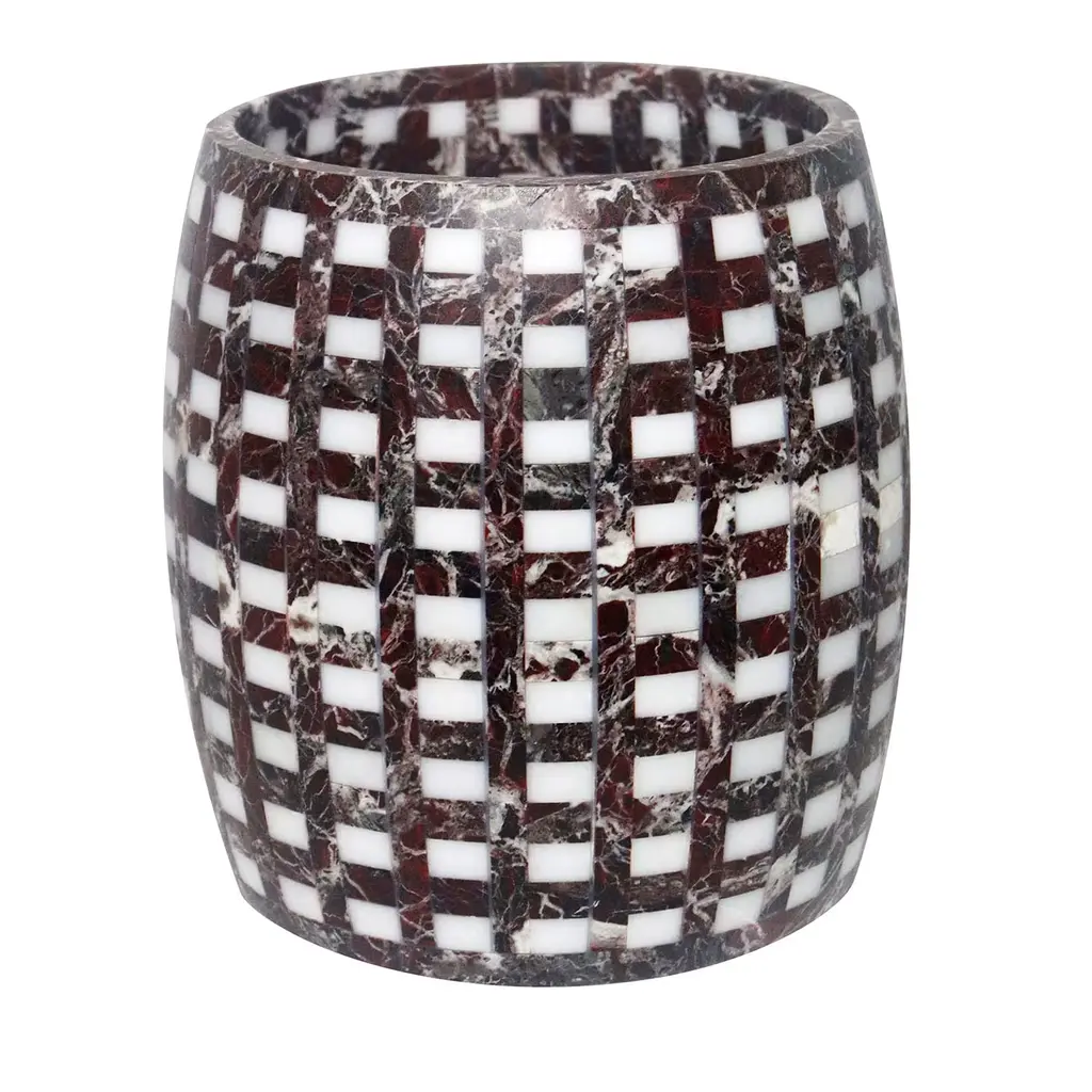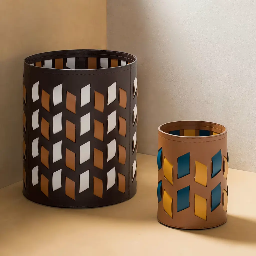 The Cancun baskets are characterized by a weave that develops only through vertical dotted lines that, being cut diagonally, give life to a design that reminds of the warm and retro atmospheres of certain fabrics typical of Central America. Finest regenerated reinforced leather structure with water-resistant and UV-resistant finish. Non-slip waterproof rubber base underneath. Fit for both indoor and outdoor use. Other colors are available. Please ask Concierge for details.