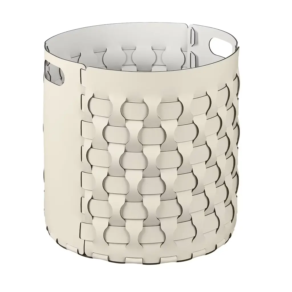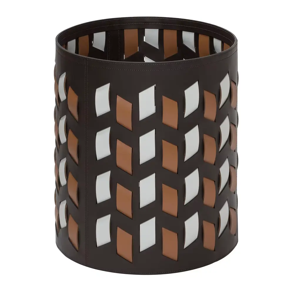 The Cancun baskets are characterized by a weave that develops only through vertical dotted lines that, being cut diagonally, give life to a design that reminds of the warm and retro atmospheres of certain fabrics typical of Central America. Finest regenerated reinforced leather structure with water-resistant and UV-resistant finish. Non-slip waterproof rubber base underneath. Fit for both indoor and outdoor use. Other colors are available. Please ask Concierge for details.