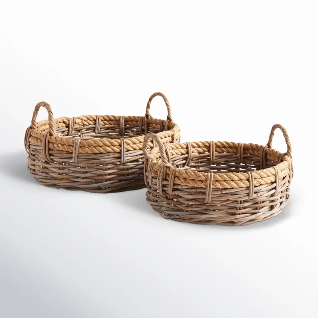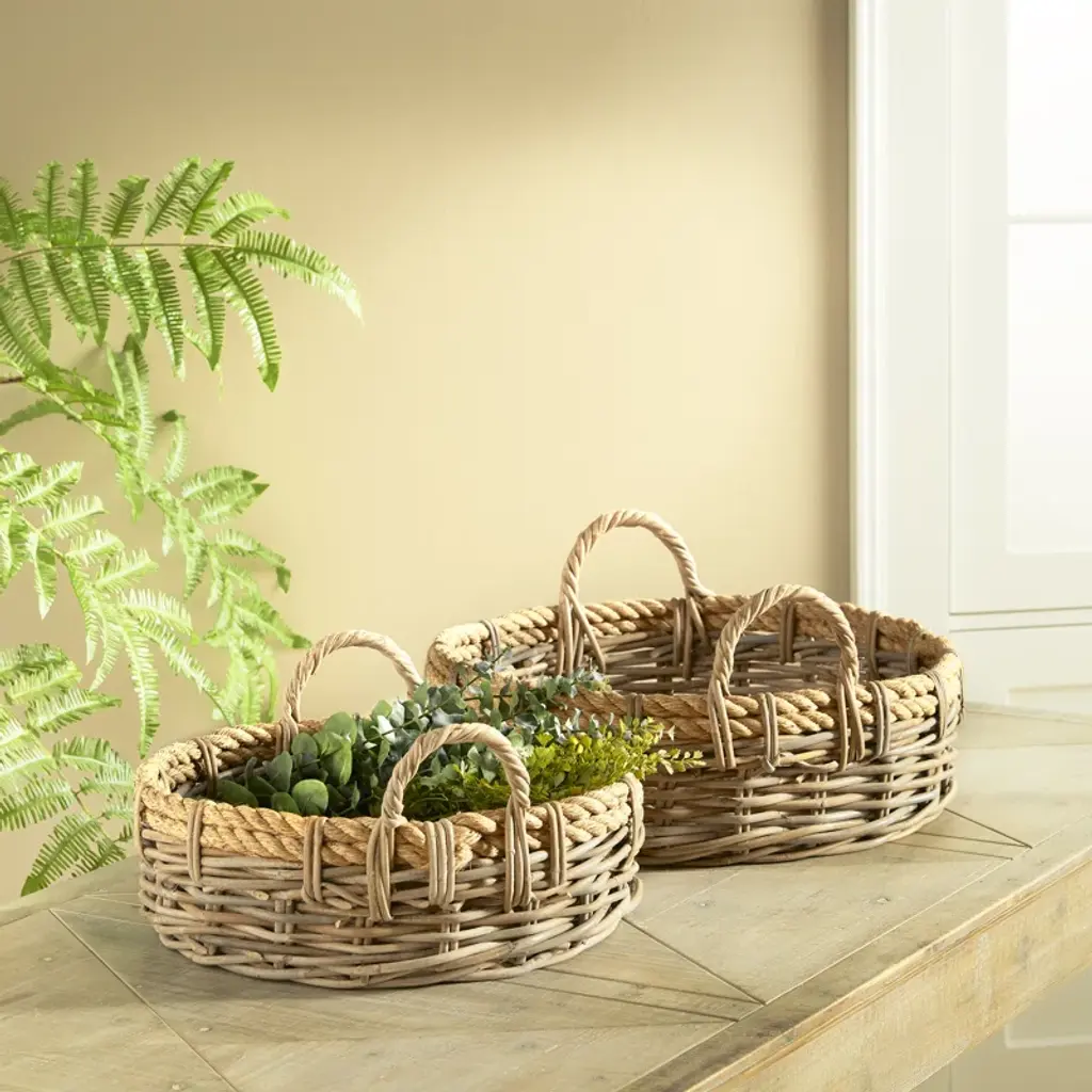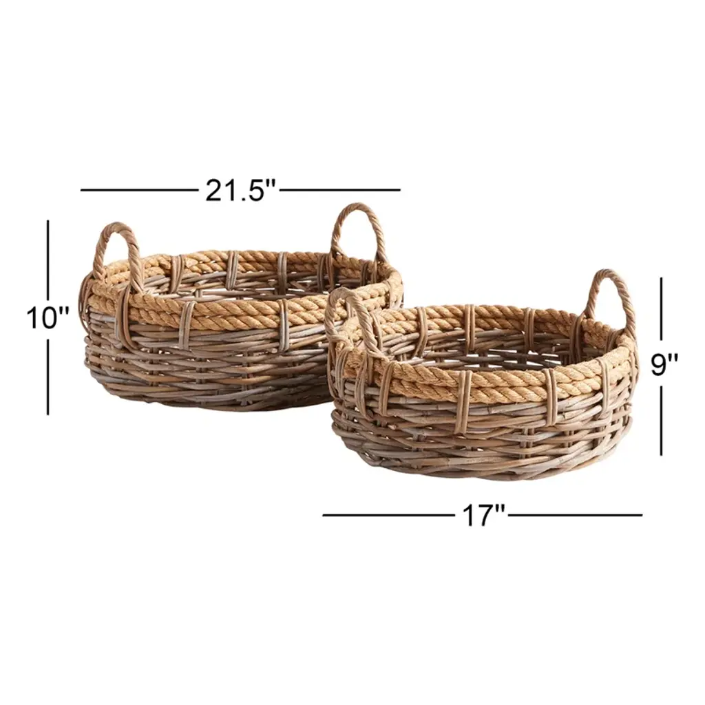 These well-scaled baskets with handles, feature a blend of rattan and rope. Great for storage and organization of any kind.