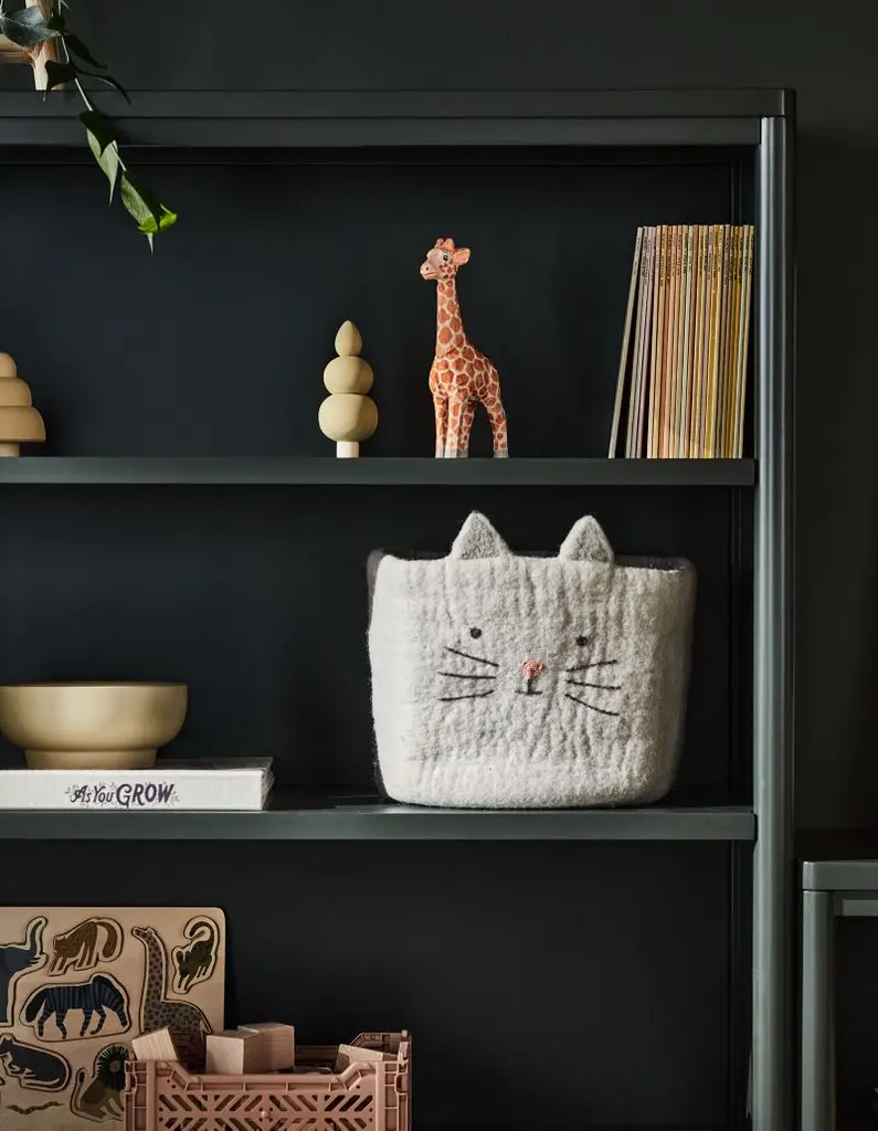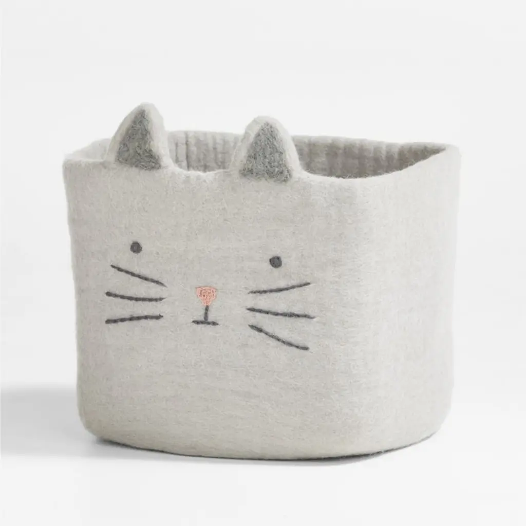 Made of light grey felted wool and adorned with an embroidered face and pointy ears, our cat storage bin is brimming with feline charmand roomy enough to keep books, toys, swaddles and other kids' essentials neatly tucked away.