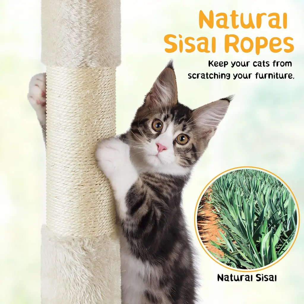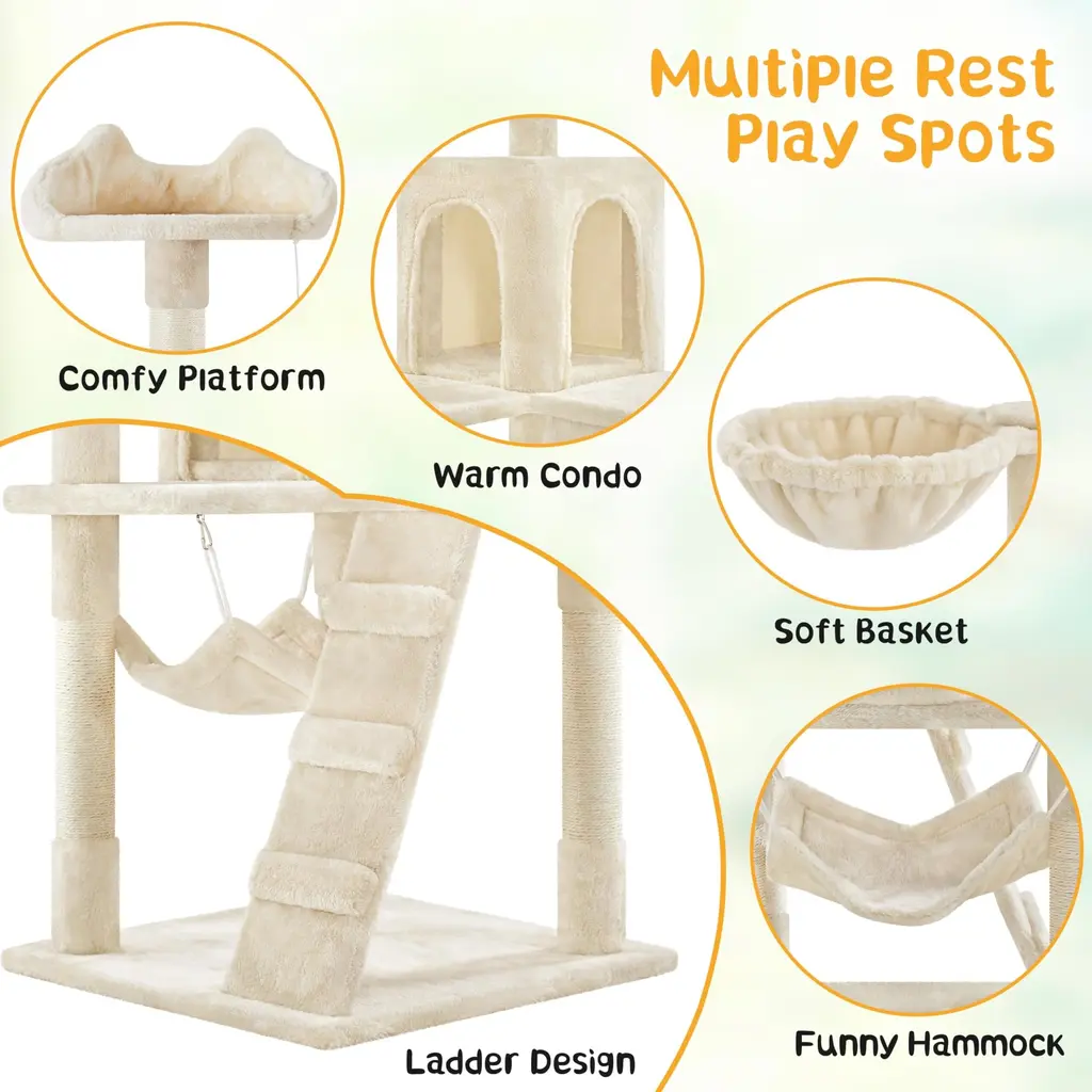 AMUSING AND RELAXING: The cat tower condo provides a perch with a cat-ear edge, warm condo, basket and hammock for comfy napping; sisal-covered scratching posts encourage positive scratching behavior and more importantly, free your furniture from sharp little claws DOUBLE STABILITY: The bottom base is reinforced to ensure the stability of the whole cat tree. It also comes with a wall anchor strap to attach it to the wall for extra stability MUST-HAVE FOR FAMILY WITH CATS: Specially designed for kittens or small/medium cats, this kitten tree provides a vertical territory for your cats to climb, play, scratch, establish authority, or hide. It not only keeps your pet healthy and entertained but also keeps it away from your delicate furniture SELECTED MATERIALS FOR YOUR BELOVED FRIENDS: This cat tree tower is made of safe and durable materials. Premium CARB P2-compliant particle board is covered with soft and skin-friendly plush, and posts are coiled with natural sisal ADORABLE PET FURNITURE: The top perch is the ideal observatory for cats to "survey their house". The cute cat-ears-shaped raised edge on the top perch reveals the little owners of this tree. Features a variety of neutral hues to ensure it complements your existing color palette