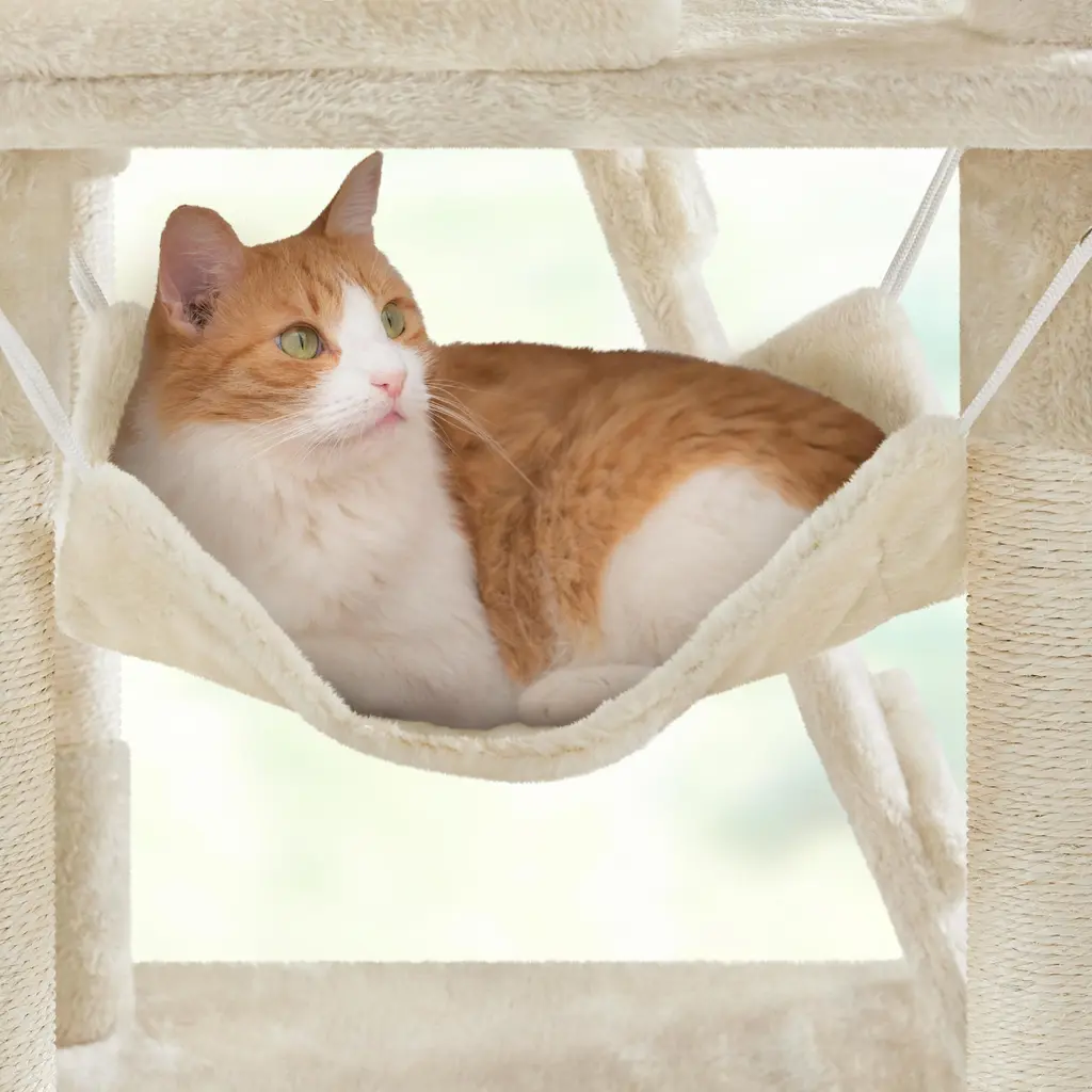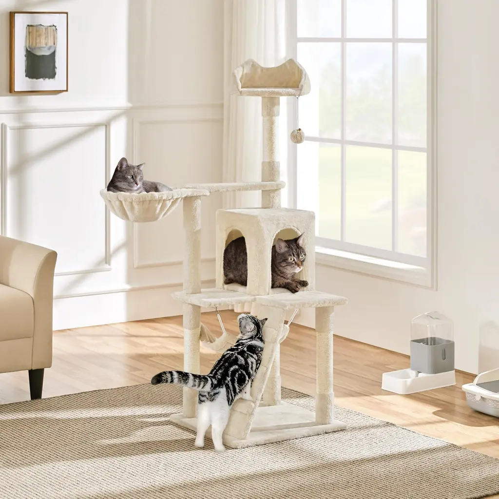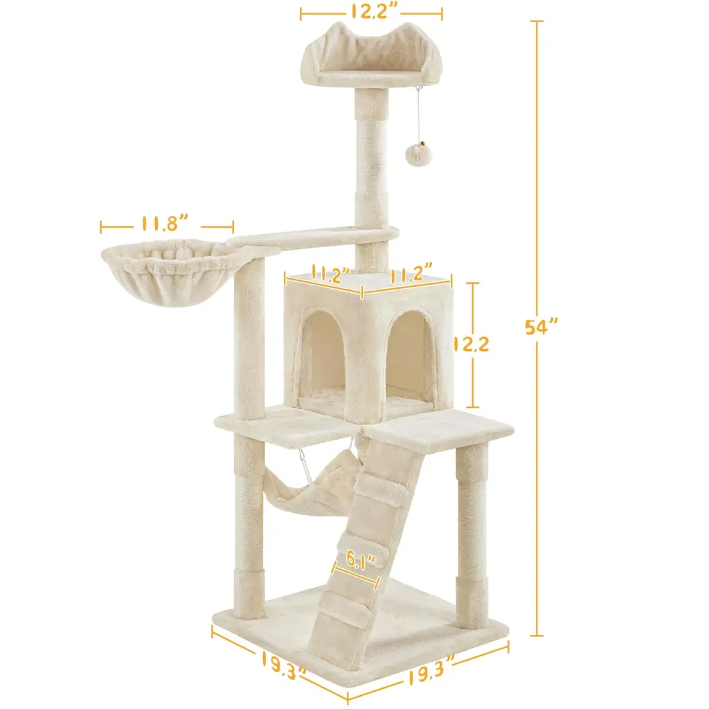 Cat Tree, 54in Tall Cat Tower W/extended Platform & Basket, Spacious Cat Condo, Funny Hammock, Scratching Posts & Ladder - Beige