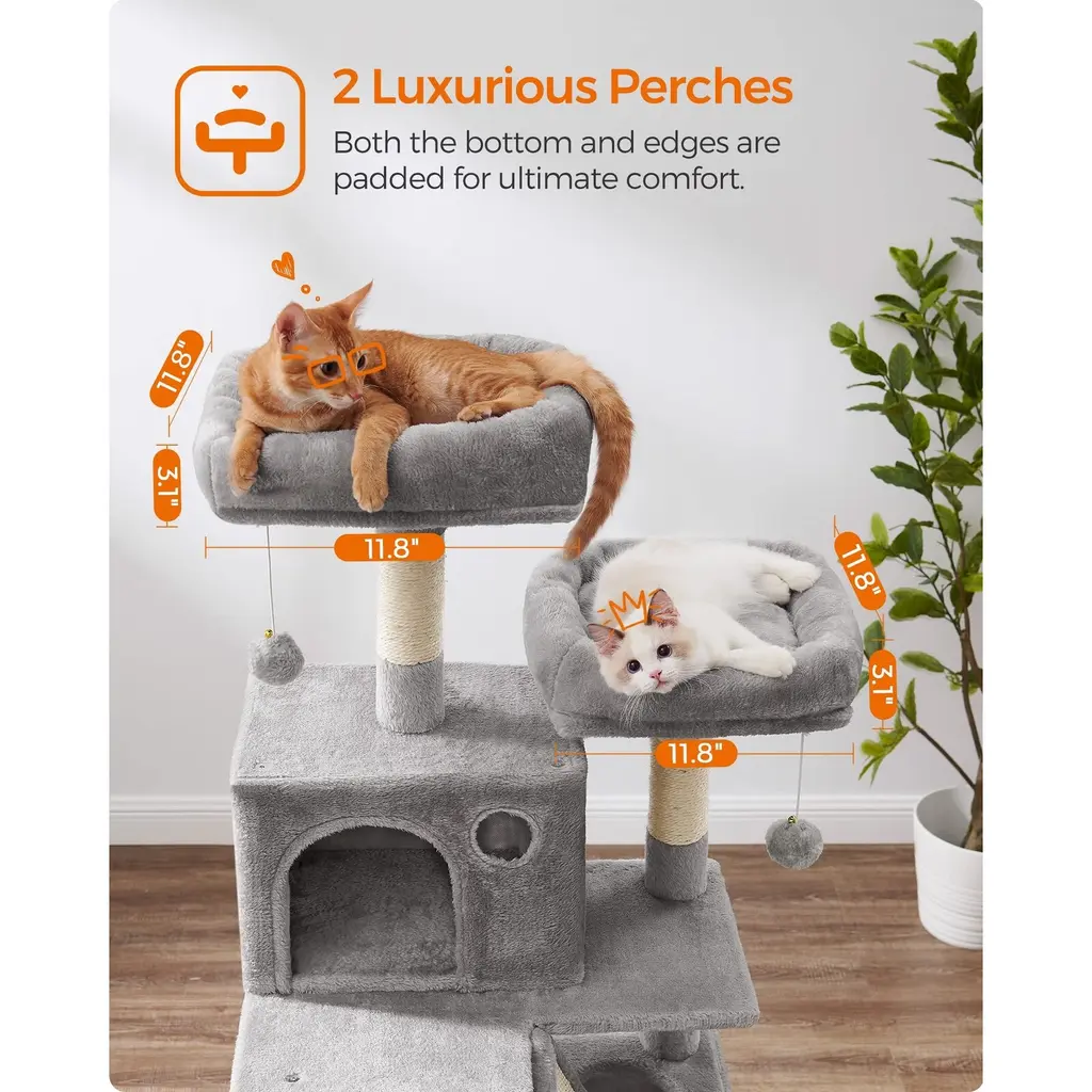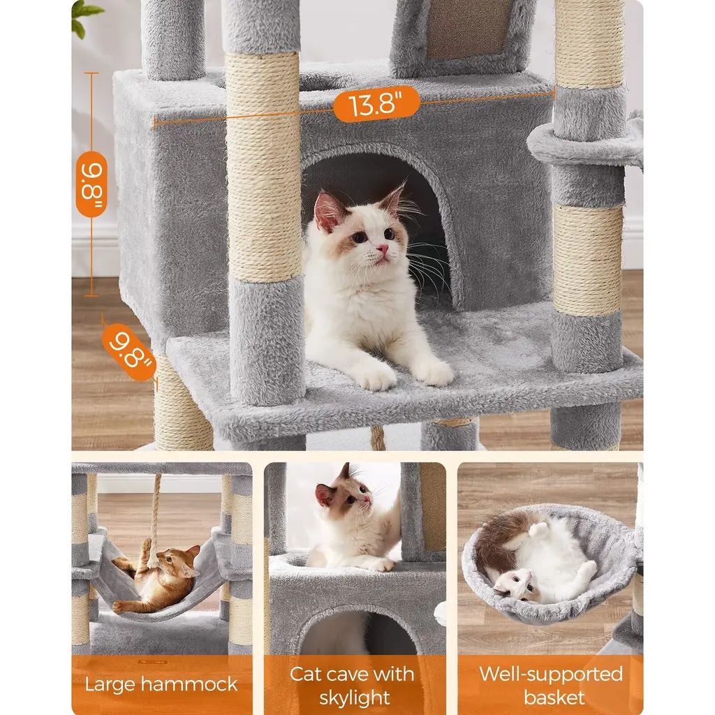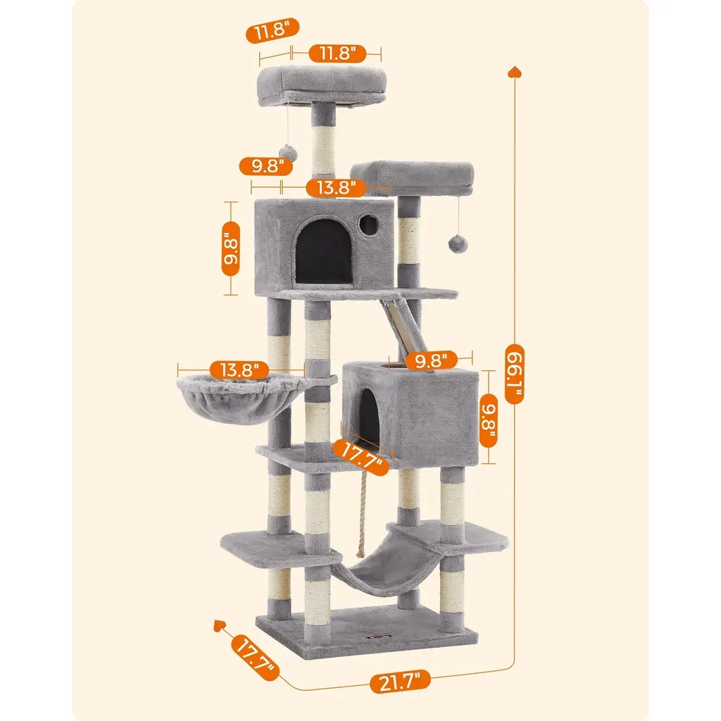 [66.1" Tall, Endless Climbing Fun] 66.1" tall. 5 levels. Short 10"-12" distance between levels. This plush cat tree is not only perfect for cats who love climbing and high places, but also friendly to kittens and elderly cats [All-in-One Playground] With 2 padded cat perches, 2 cozy caves, 1 fluffy basket, 2 pompoms, and 1 hammock, cats of different characters can all find their fave spot on this multi-level cat villa covered with plush all over—perfect for multi-cat households [Robust Material, Safe Cat Condo] Sturdy particleboard for durability, a large, reinforced base for extra stability, and an anti-tip kit for security—it's stable and safe for up to 6 cats (max. 11 lb each) to play [13 Scratching Posts & 1 Scratching Ramp] Cats love to scratch. With scratching areas on each level, they can scratch to their hearts' content and let your sofa go! Plus, the scratch ramp doubles as a ladder to help kittens and elderly cats climb up easily [Easy to Clean] Fur, dirt, and crumbs...no worries. Just a lint roller or vacuum cleaner can easily wipe them away [Spare Pompom] Whether your cat had a little too much fun with a pompom and damaged it or you're not a fan of bells, this cat tower for indoor cats comes with a spare pompom without a bell so you can replace it as needed