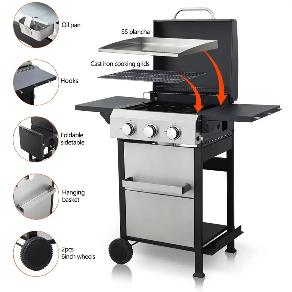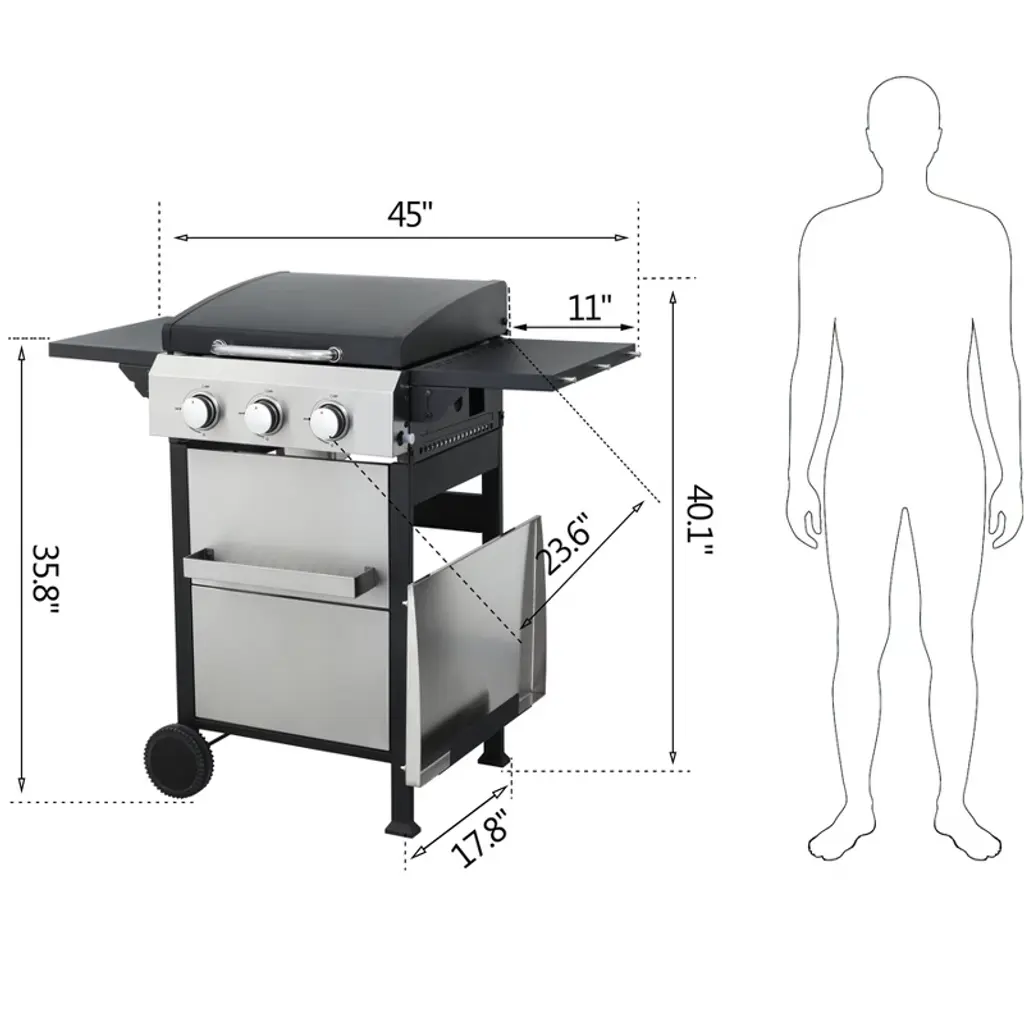 【wire enamel cooking grids】: 1pc 6.9x17.3 inch, 1pc 8.9x17.3inch【Ignition system】: Push and turn, integrated automatic easy ignition【Side table】: Steel, black powder coating, foldable, 11x17.7inch【Flame tamper】: Enamel flame tamper, 3pcs, So that the temperature can be evenly distributed【Firebox】: Enamel【wheel】: 2pcs 6inch wheels【Warming rack】: enamel【Power】: 12300 BTU * 3=36900 BTU【Hanging baskets】: 14.9x3.15x1.57inch【Hooks】:6pcs