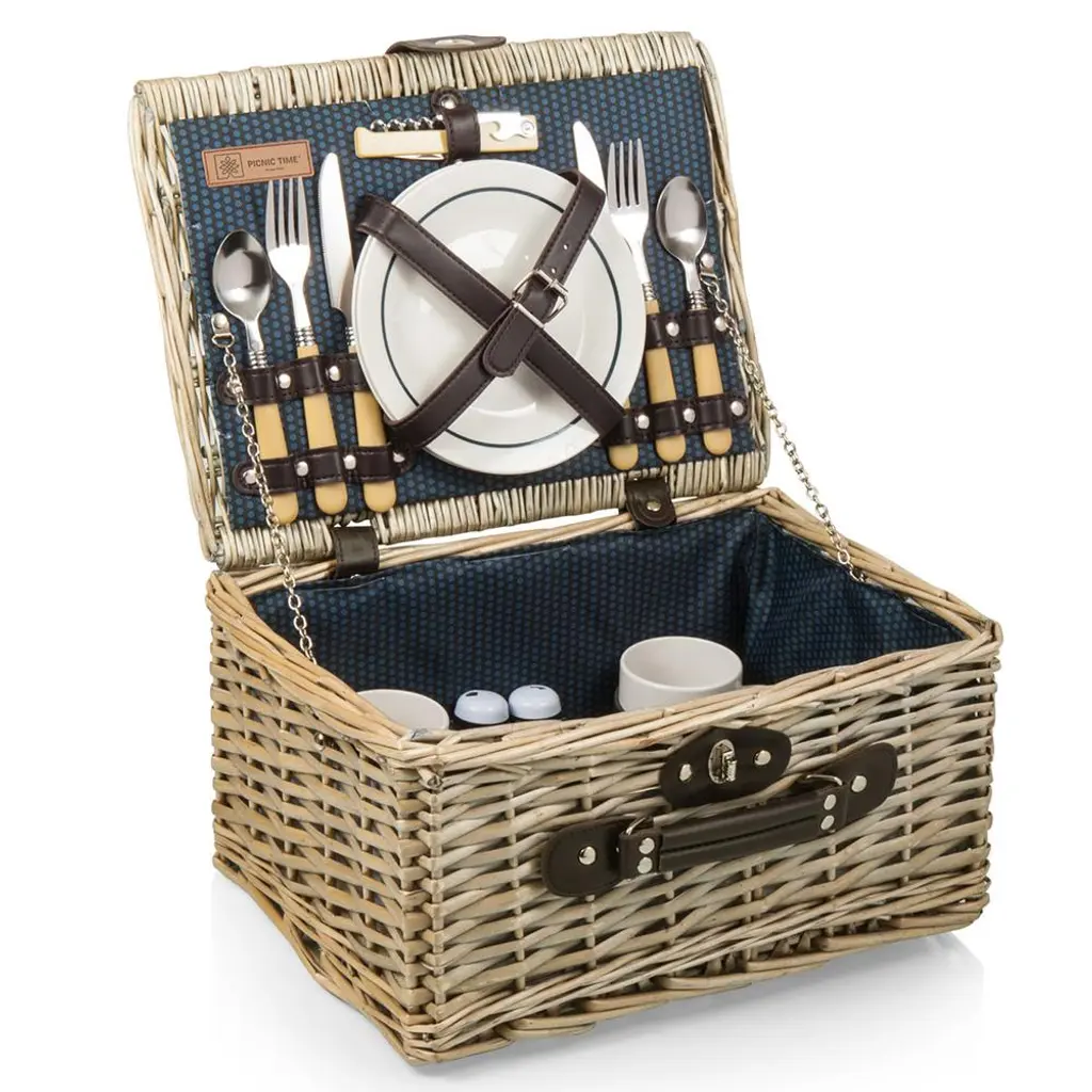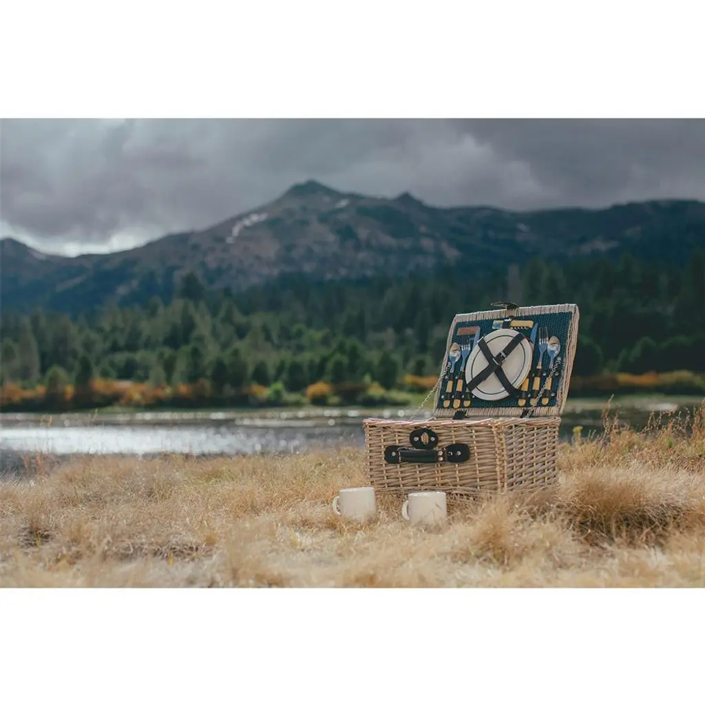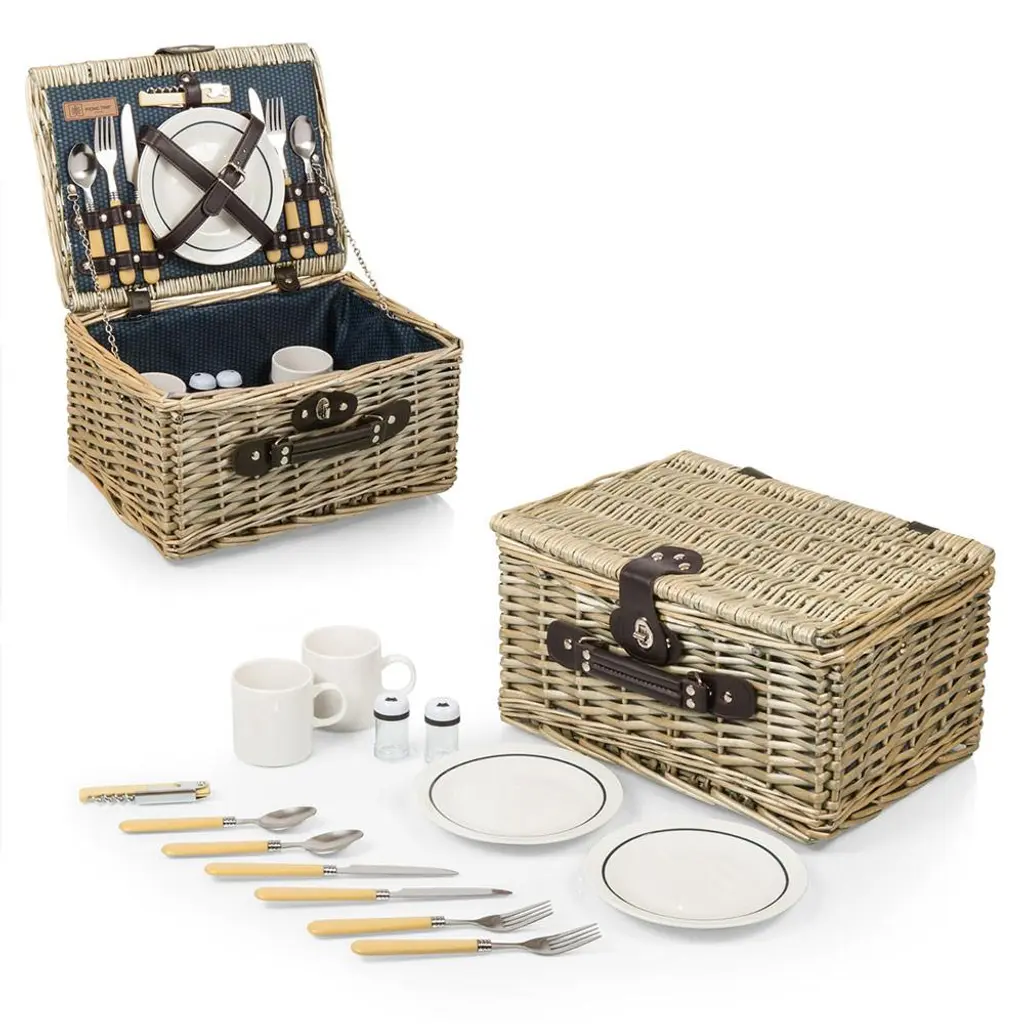 Celena Coastal Beige Willow Blue Picnic Basket With Serverware For 2