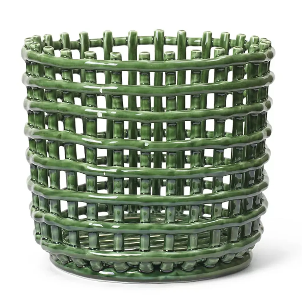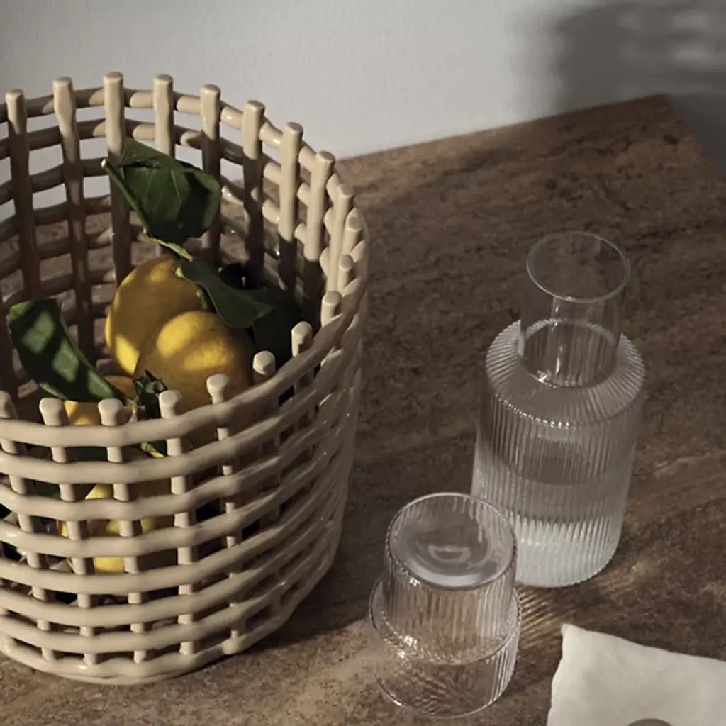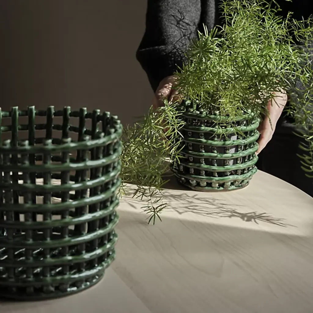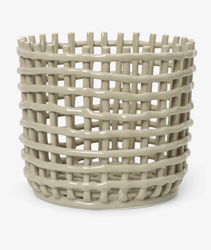 The Ceramic Basket from Ferm LIVING translates the familiar rhythm of woven basketry into glazed ceramic form. Skilled artisans recreate traditional braiding patterns in clay, building up each piece by hand to mimic the interlaced structure of natural fiber baskets. The ceramic construction allows for multiple uses, from holding fresh fruit to housing potted plants or simply serving as decoration. Each basket features subtle variations, making every piece truly one-of-a-kind. The multifunctional design adapts easily to different needs, whether displayed on shelves, used for storage, or featured as a centerpiece on dining tables.