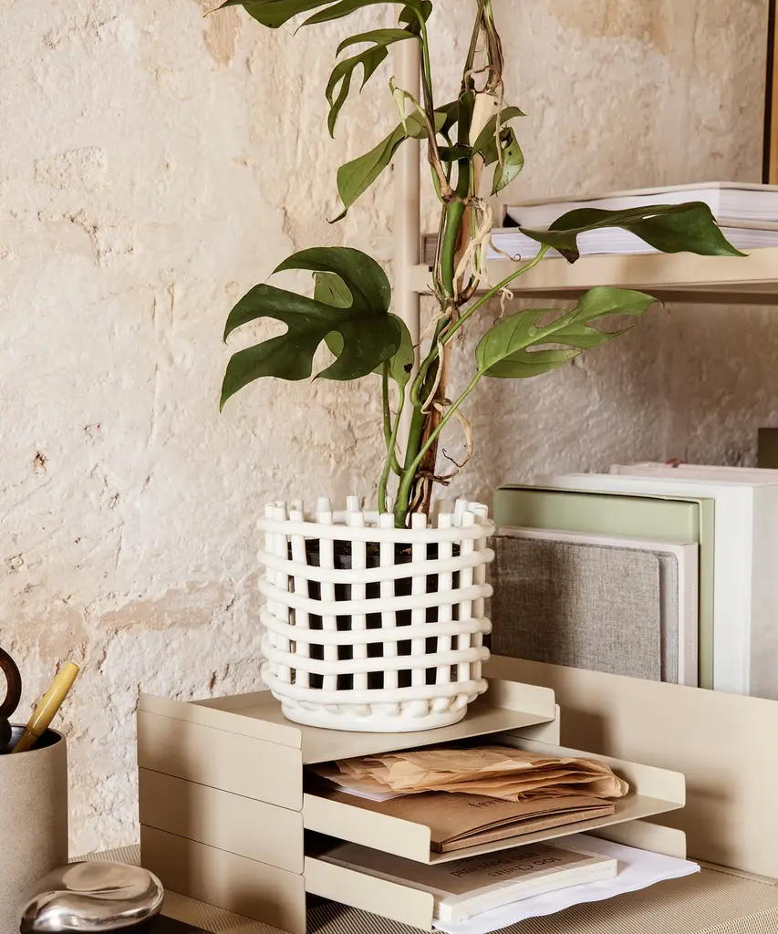 Bringing the traditional basket weaving technique to pottery, the handmade Braided Baskets recreate the familiar feel of woven containers. Available in two sizes and colors small and large, and indigo blue and off-white respectively the multifunctional design can be put to use as a plant pot, fruit bowl, or decorative focal point in a room. Each piece is unique. Designed and produced by the Copenhagen-based studio Ferm Living.