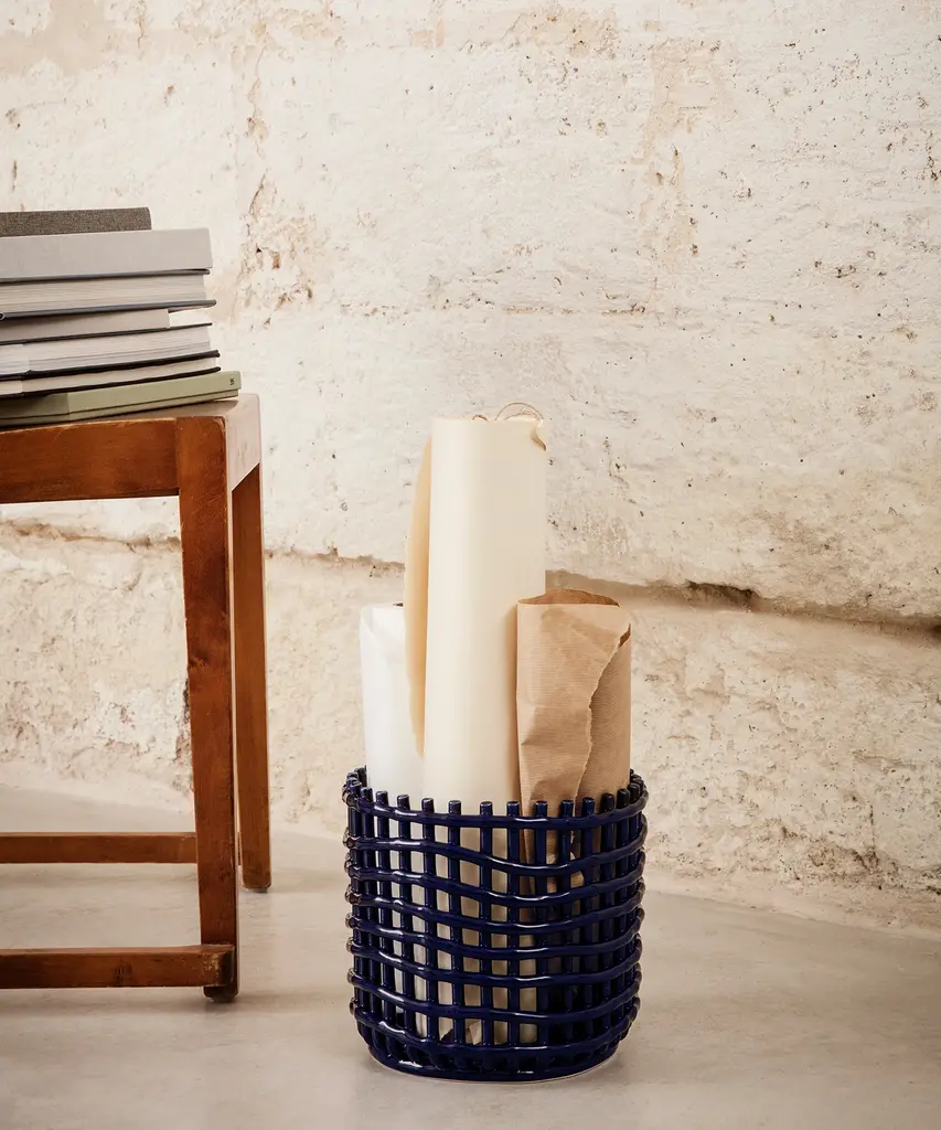 Bringing the traditional basket weaving technique to pottery, the handmade Braided Baskets recreate the familiar feel of woven containers. Available in two sizes and colors small and large, and indigo blue and off-white respectively the multifunctional design can be put to use as a plant pot, fruit bowl, or decorative focal point in a room. Each piece is unique. Designed and produced by the Copenhagen-based studio Ferm Living.