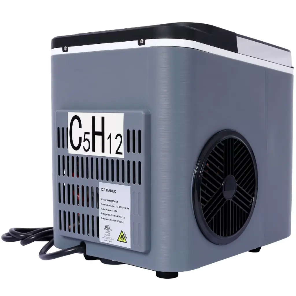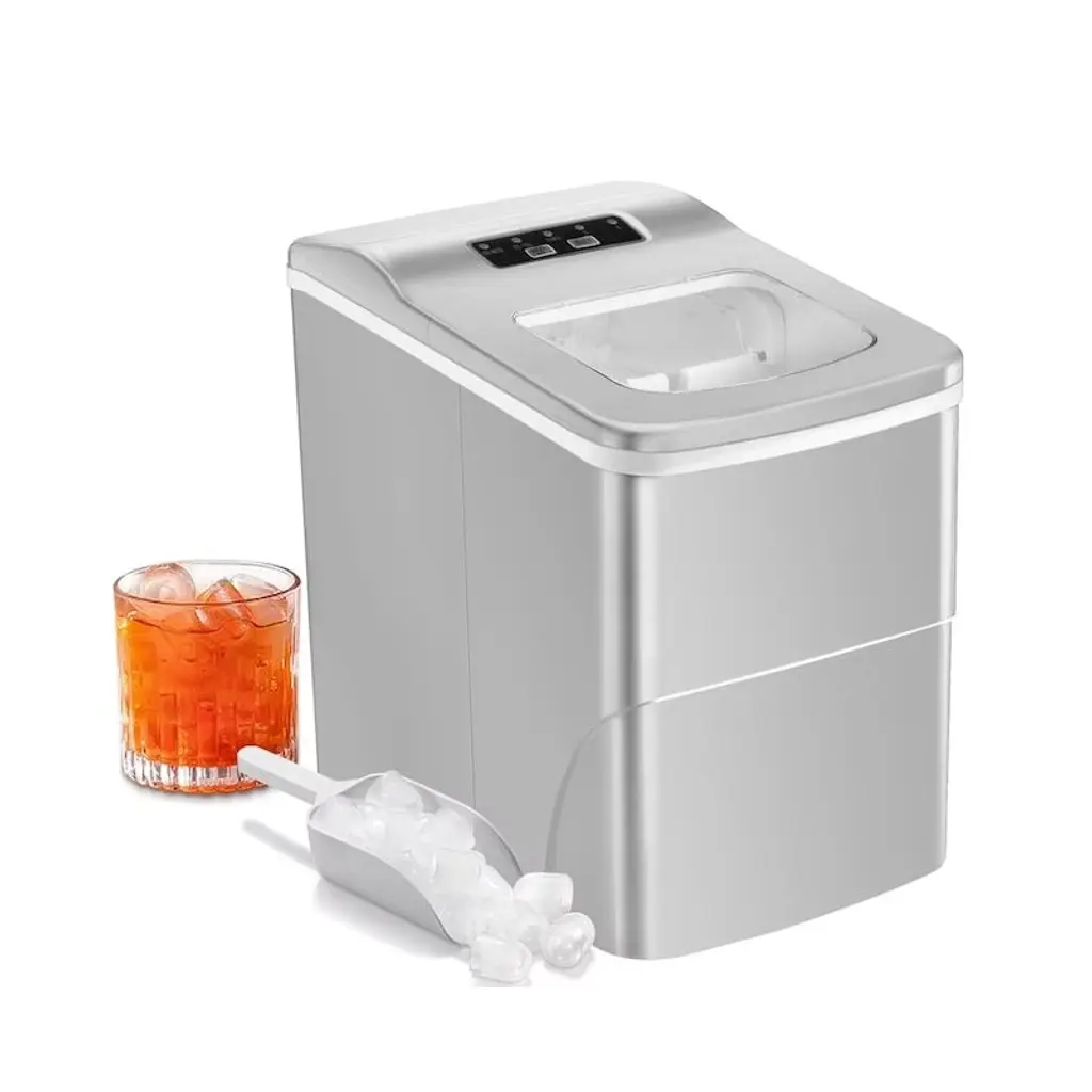 This space-saving ice maker (8.7 x 11.6 x 11 inches) delivers bullet-shaped ice in 6 minutes and produces 26 lbs/day, perfect for kitchens, offices, or parties. The 1.2L water tank and 1.3 lbs storage bin ensure continuous supply, while the self-cleaning function and quiet operation (<50dB) make maintenance effortless. Includes an attached scoop and transparent lid for easy monitoring.