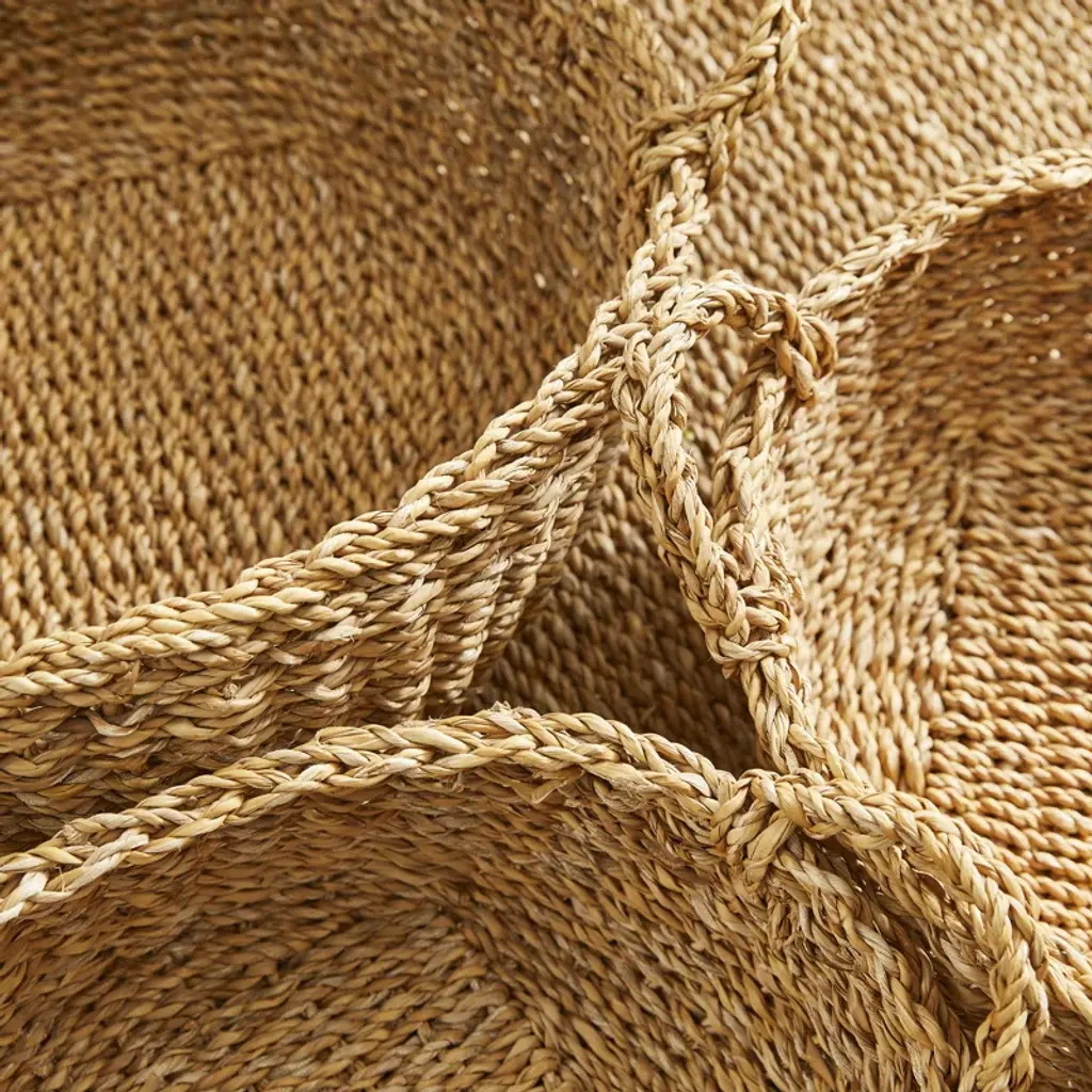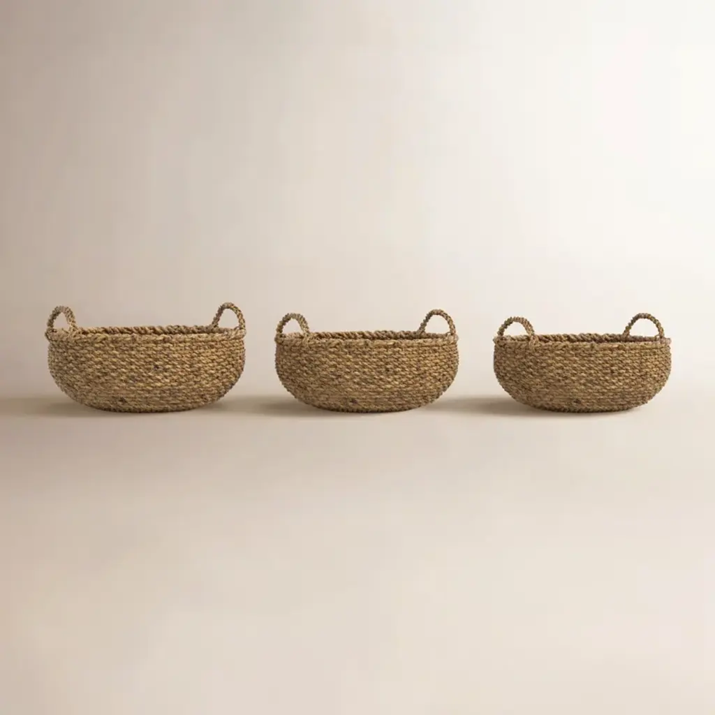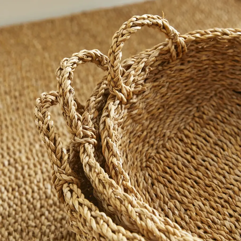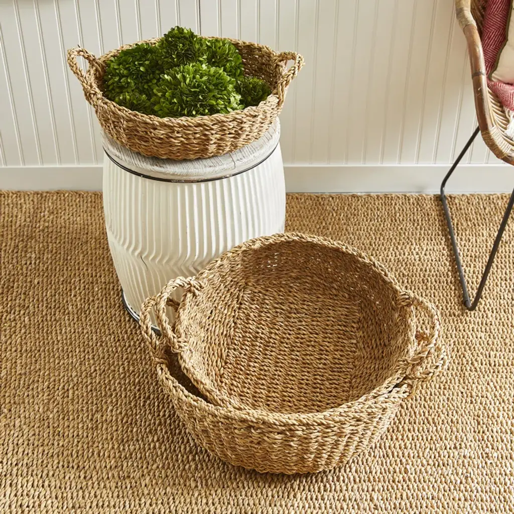 This 3-piece set of nesting decorative baskets completes your coastal farmhouse space with charming storage. Each is crafted from seagrass in a natural brown tone connected in a classic wicker weave that adds texture to your sideboard, shelves, or coffee table. We love the soft circular shape with handles that make it easy to transport laundry or snacks from room to room. The set showcases three different sizes with the largest measuring nearly 20'' wide and deep. Interior use only.