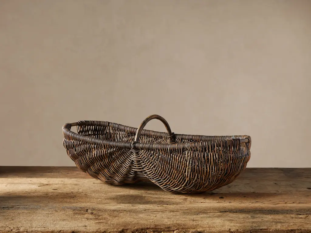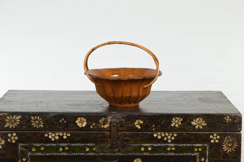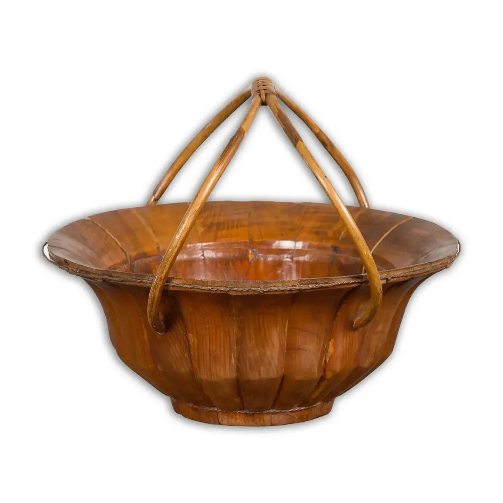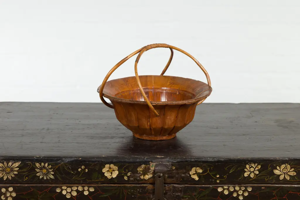 Chinese Late Qing Dynasty 1900s Varnished Bamboo Basket With Large Handles