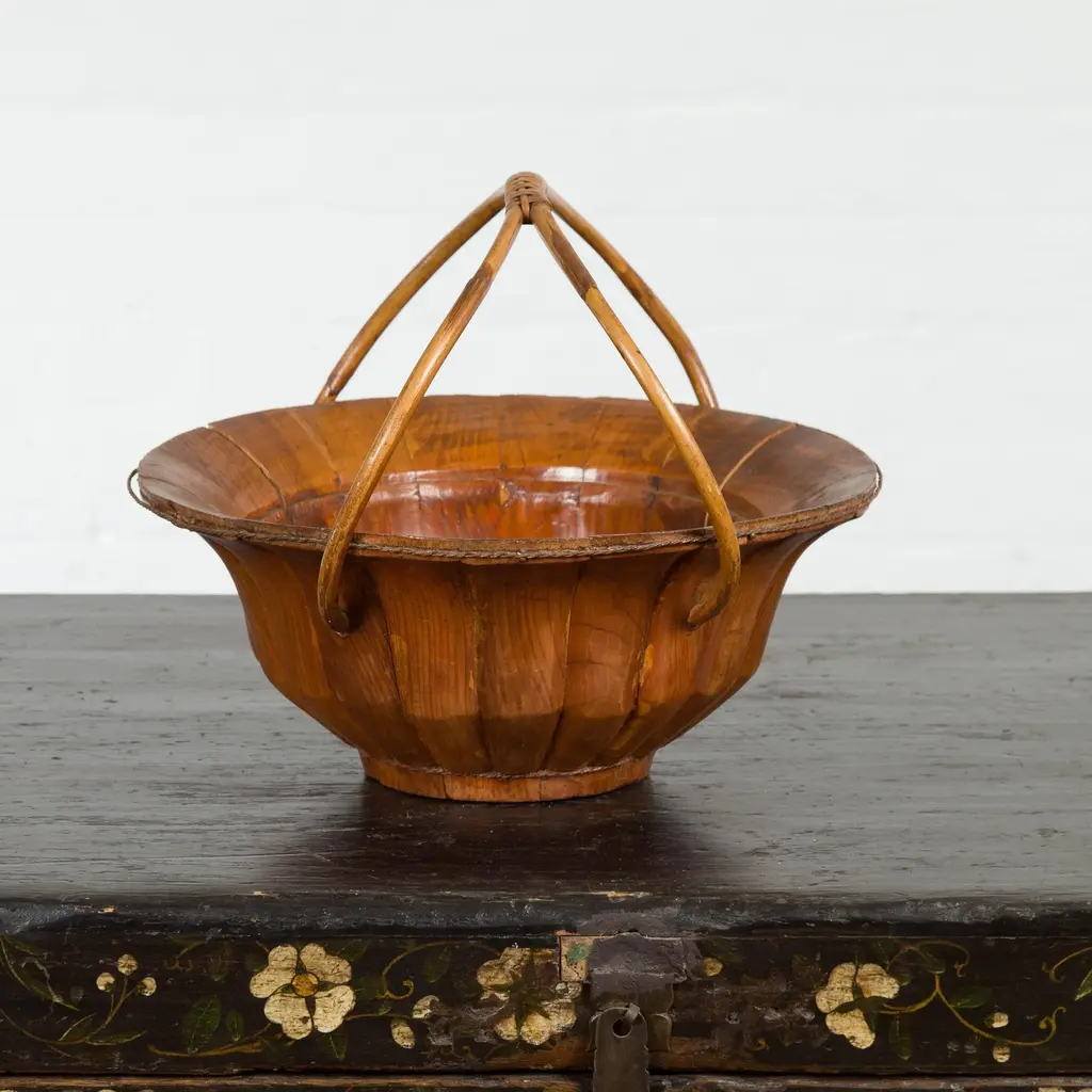 A Chinese late Qing Dynasty period varnished bamboo basket from the early 20th century with rattan tied handles. Created in China during the late Qing Dynasty period in the early years of the 20th century, this bamboo basket was likely used as a hat basket. It features a circular slatted body topped with a flaring mouth. Two handles are secured to one another through woven rattan. The entire piece is made of carved bamboo, varnished in a brown hue. This late Qing Dynasty period Chinese varnished bamboo basket from the early 20th century will make for a charming decorative addition to any home, placed in a living room, kitchen or dining room.