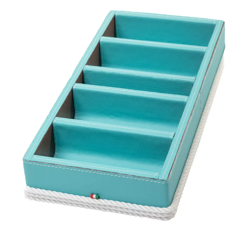 Finest regenerated reinforced leather baskets with dividers, provided with water-resistant and UV-resistant finish. It features a characterizing dark-stained metal handle. Other colors are available. Please ask Concierge for details.