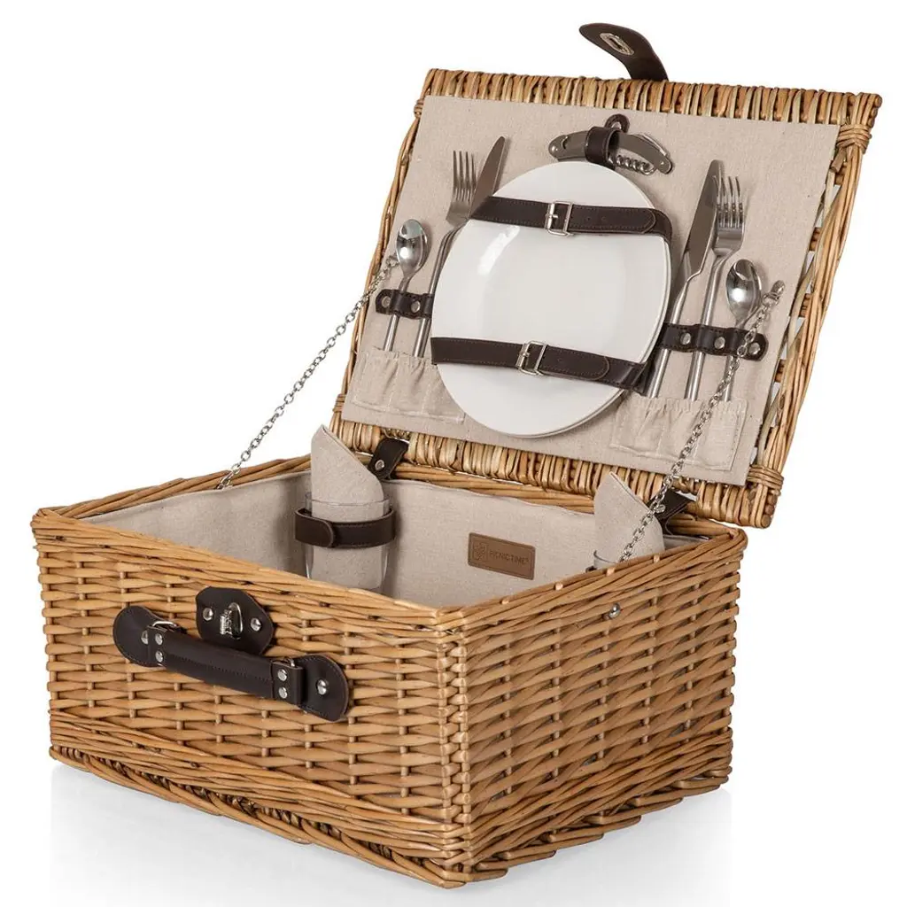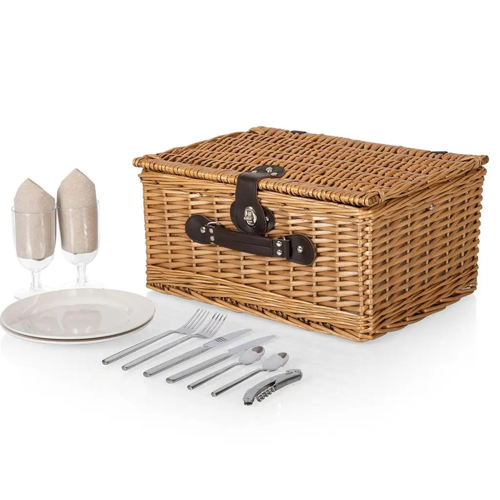 Clince French Brown Willow Beige Picnic Basket With Serverware For 2
