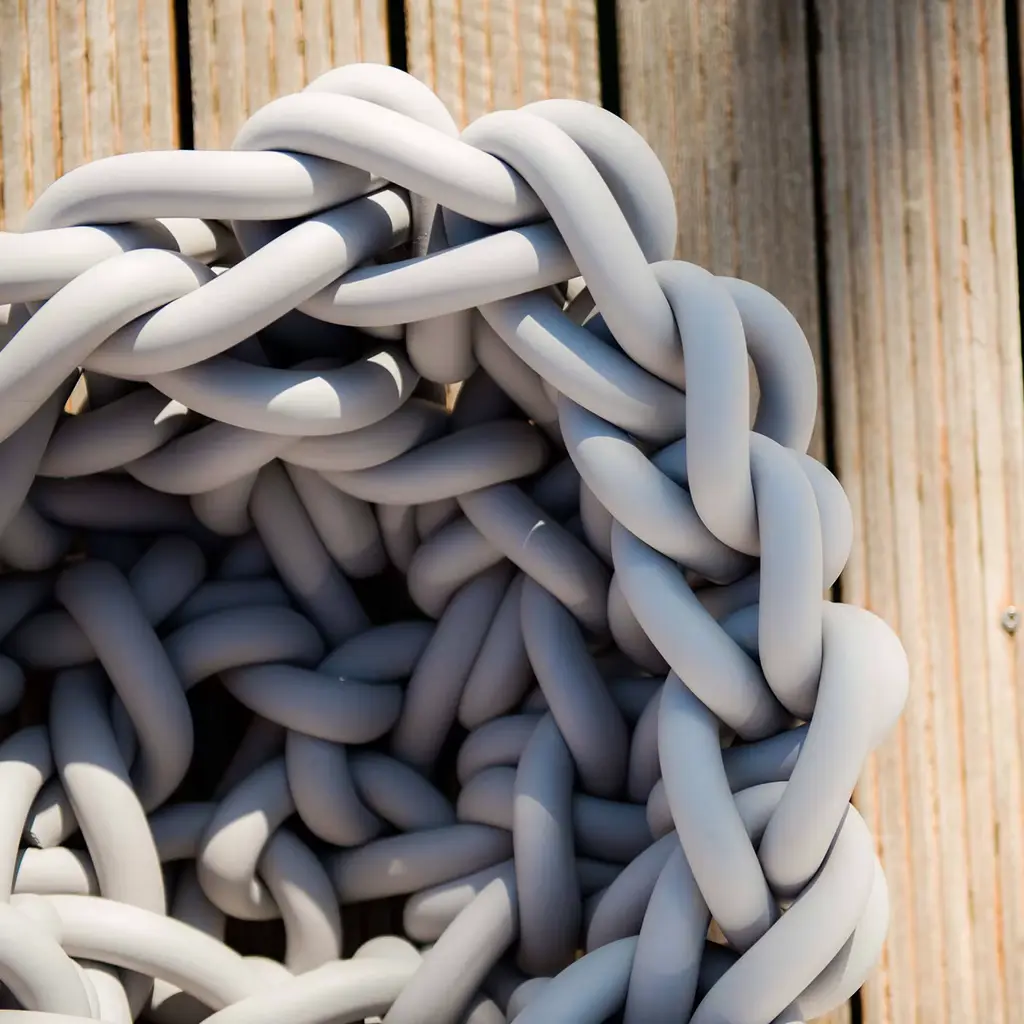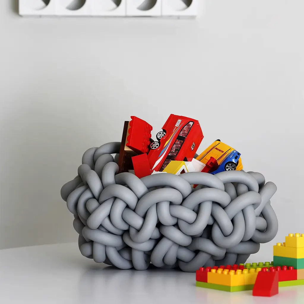 Part of the Colosso Collection of sleek and sculptural baskets, this extraordinary design will make an iconic accent piece in a contemporary-style setting, both indoor and outdoor. Impressively hand-knotted with 25mm-thick waterproof neoprene yarn, it boasts a dark gray hue and is also available in black and pearl gray. Please consult the Artemest catalog for customization options.