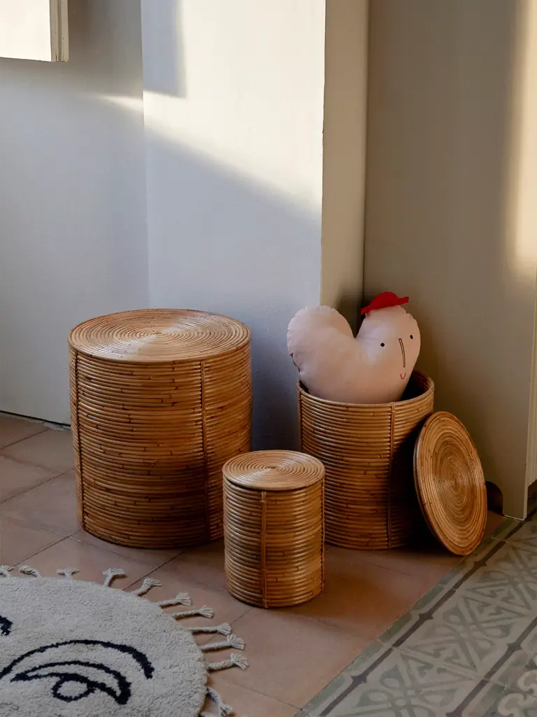 With shapes inspired by architectural columns, the Column Storage presents a versatile storage solution. The set of three baskets are made entirely from stained natural rattan, creating a beautiful contrast to their simple, clean shape, and lending each piece with a soft and organic expression. Adding to their functionality, each basket comes with a practical lid, enabling you to easily hide away any unwanted clutter. Use the Column Storage to sort your laundry, to store away your little one’s toys at the end of the day or as a decorative and useful storage solution in the living room.