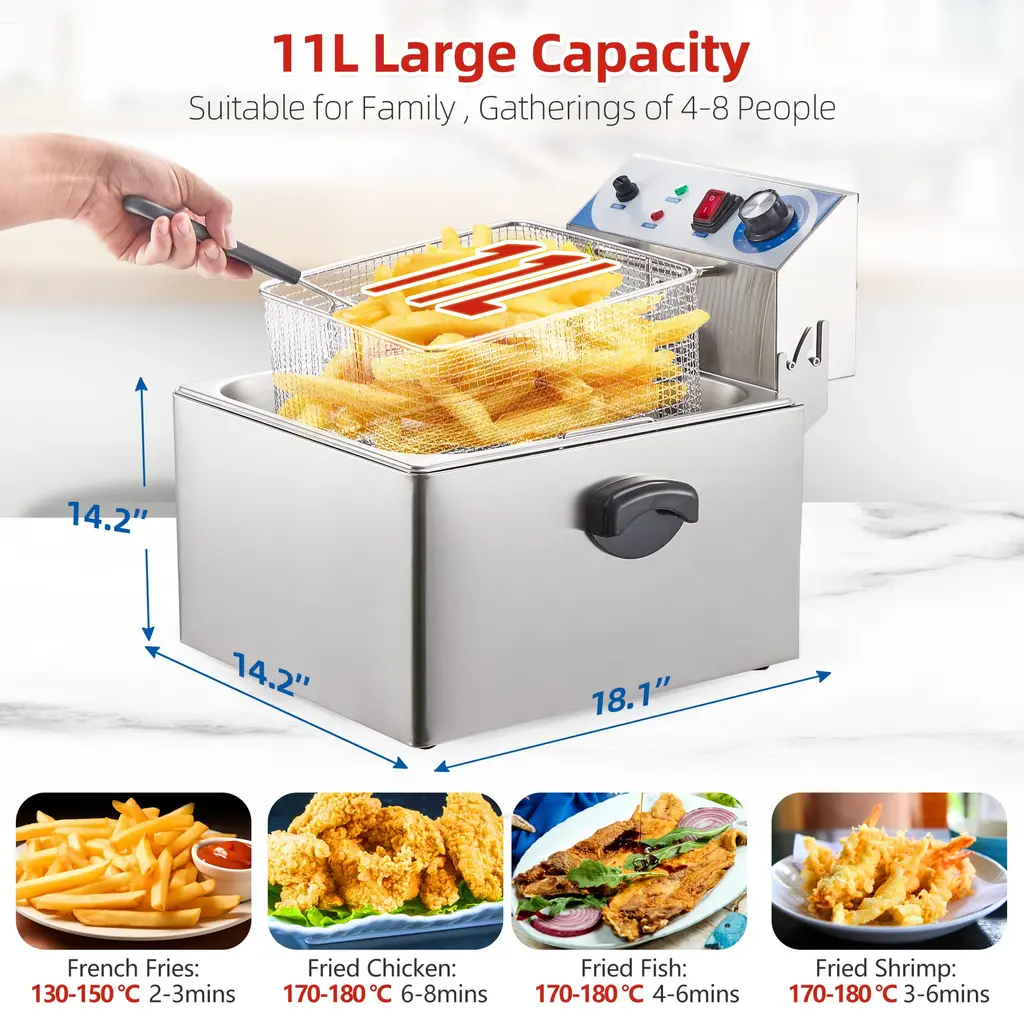 Commercial-Grade Performance: Designed for heavy-duty use, this stainless steel electric deep fryer offers commercial-grade performance suitable for restaurants, caterers, and food establishments. Safety Features: The fryer includes safety features such as a lid to prevent oil splashing, ensuring a safe and secure cooking experience for the user. Efficient Operation: The adjustable temperature control allows for precise cooking, while the easy-to-use design ensures efficient operation for a hassle-free cooking experience. Wide Range of Applications: Ideal for preparing a variety of dishes, from classic buffalo wings to crispy nuggets and golden fries, this fryer caters to a diverse range of culinary needs. Enhanced Flavors: Elevate your dishes with the delicious and crispy texture achieved with this electric deep fryer, enhancing the flavors of your favorite fried foods.