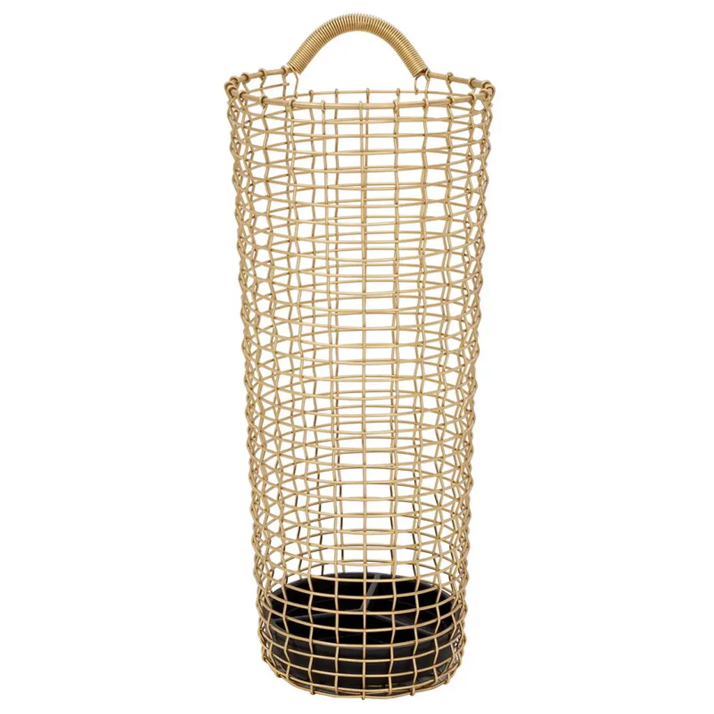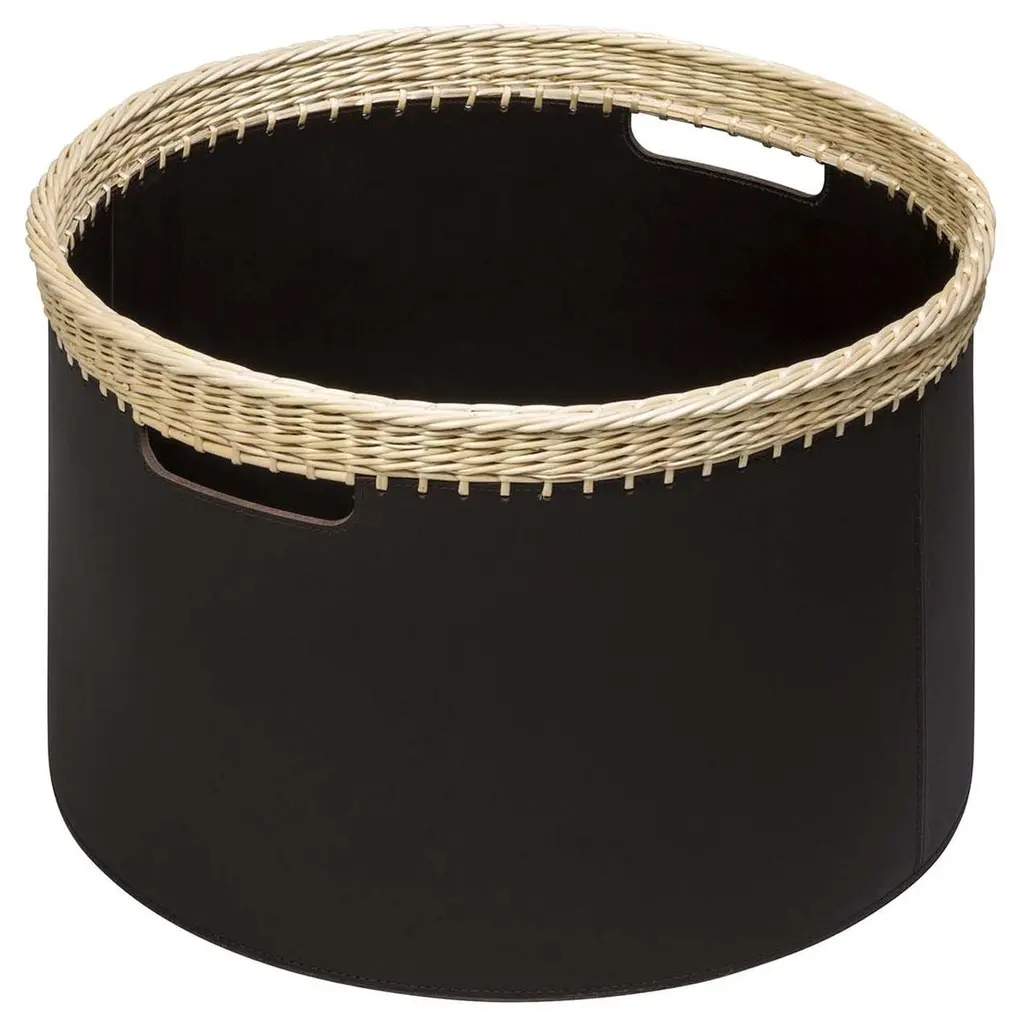 Part of the Como Collection of baskets entirely handcrafted of soft saddle leather in classic colors, this is a refined storage solution that can be used anywhere in the house. Its round shape features rectangular cut-out handles and an eye-catching hand-woven trim around the border in natural wicker that creates a striking contrast with the black color of the leather. Mixed with the other pieces of the collection, this basket is a superb way to store miscellaneous items in the bedroom, living room or bathroom.