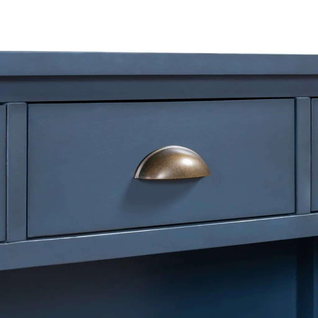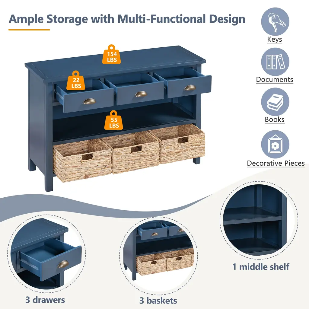 Upgrade your space with this console table, combining durability, functionality, and timeless charm. Crafted from panels and a solid pine wood frame, it ensures long-lasting stability for everyday use. Three spacious drawers and open shelves provide versatile storage, ideal for keys, books, or decorative pieces. A vintage-inspired design with cup-style metal handles and a natural finish adds rustic elegance to any room. The bottom shelf features woven storage baskets, offering both practical organization and stylish appeal, perfect for small spaces.