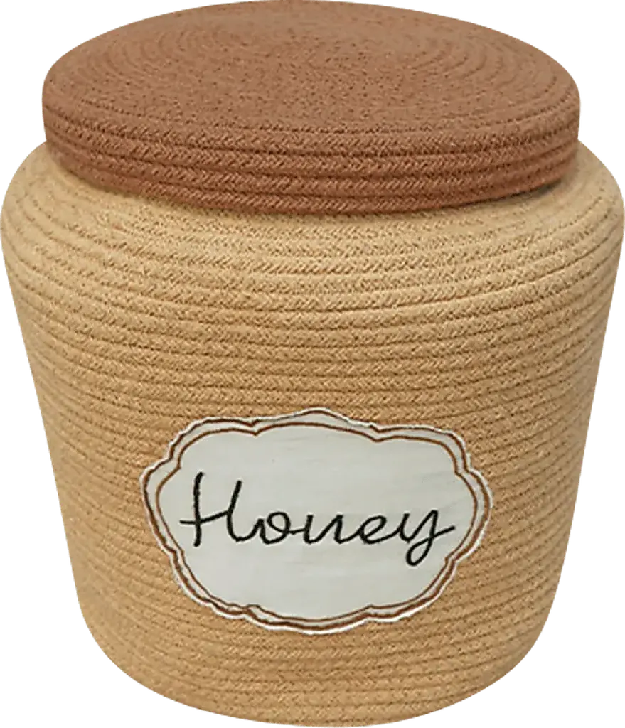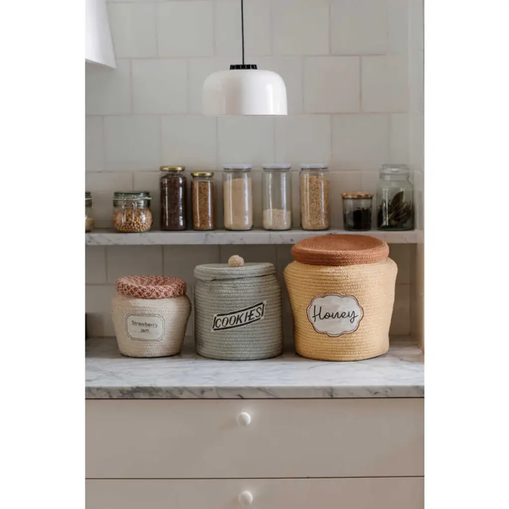 Soft and bending for little hands reaching for a treat, the Cookie Jar basket is a sweet accompaniment to a child's playroom. Handcrafted with natural cotton mixed with recycled PET bottle fibers in a soothing Blue Sage hue. With a pompom adorning the lid and a sewn on "Cookies" label, the Cookie Jar Basket is a play kitchen delight.