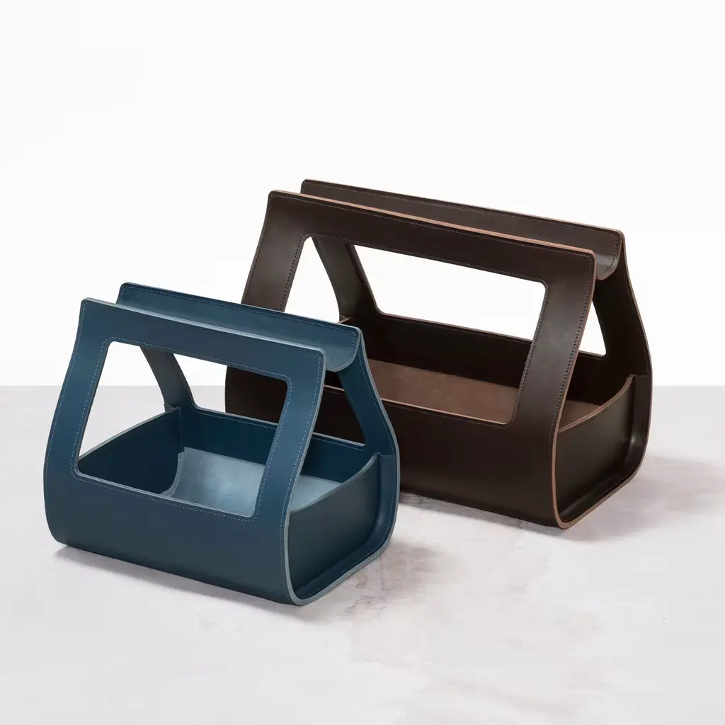 Elegant in its simple yet deftly handcrafted shape, this exquisite basket belongs to a stylish series designed by Gio Tirotto. Complementing any decor thanks to its versatile charm, it is entirely handmade of saddle leather showcasing a navy blue tone. Also available in the other tones from the Rabitti 1969 color palette: white, light grey, mud, graphite, black, mocha, brown, cognac, natural, cream, yellow, mango, red, navy blue, and loden green.