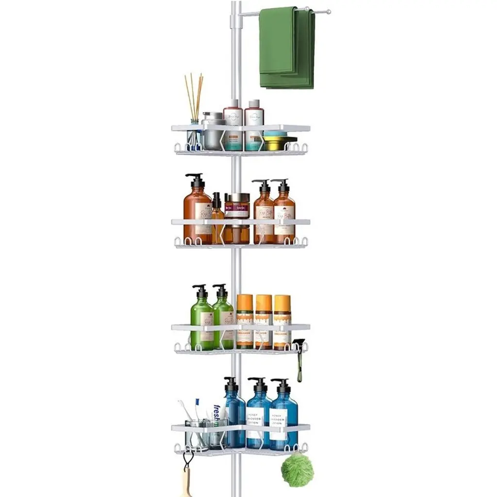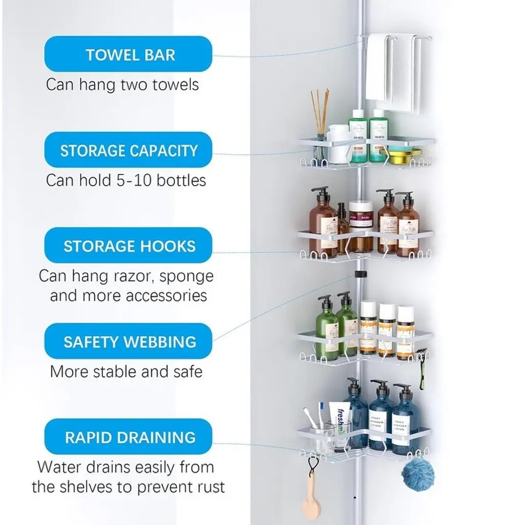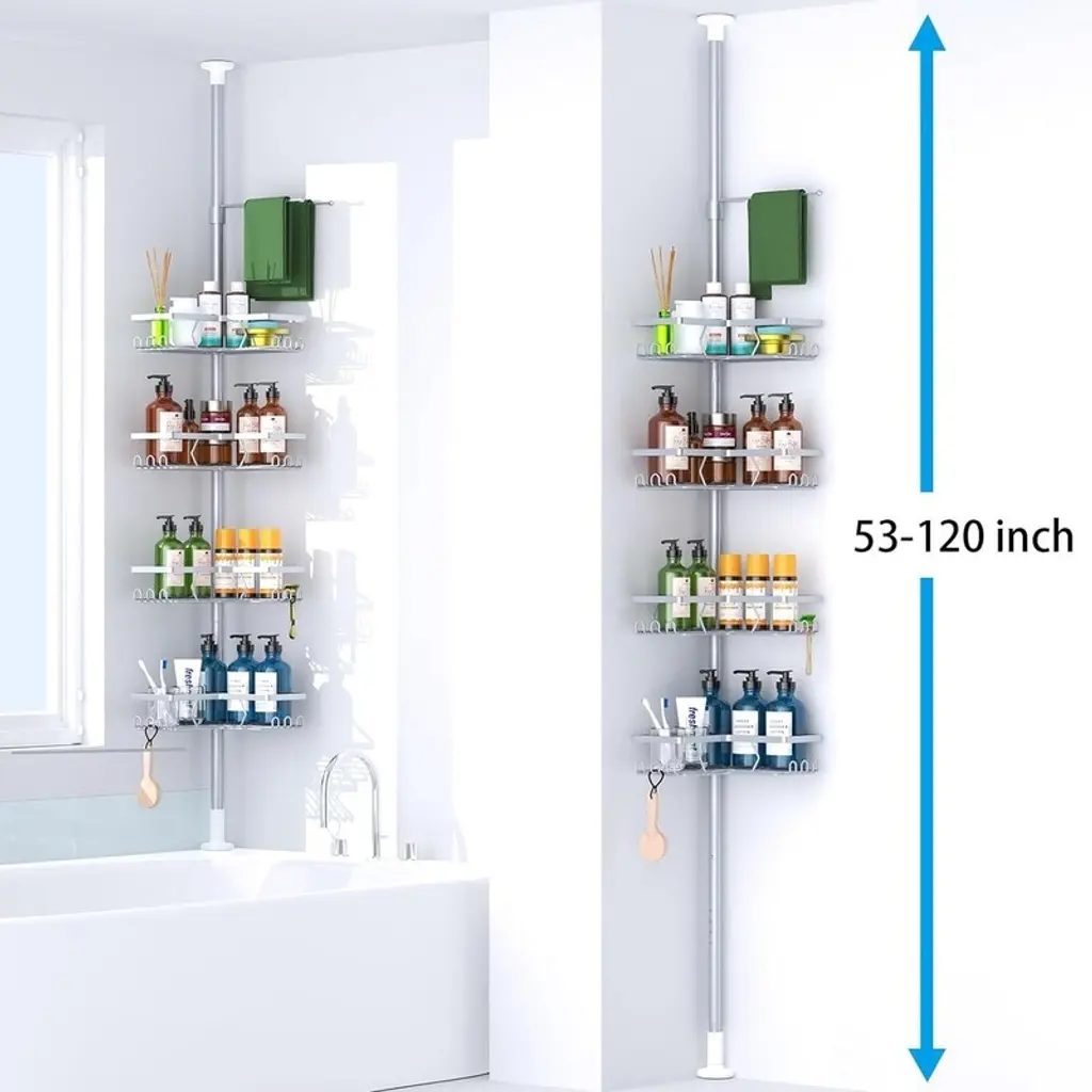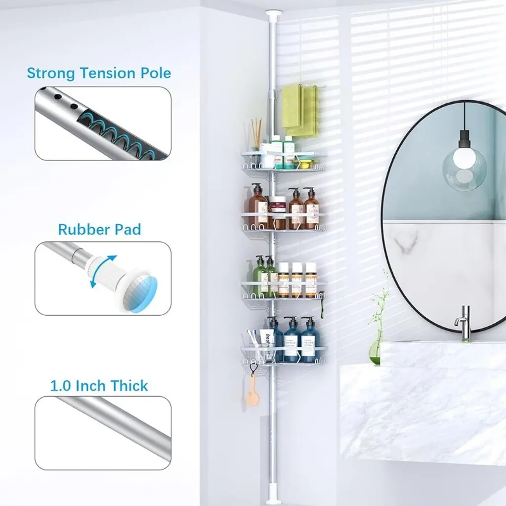 CORNER RALLY BAR SHOWER CADDY: Shower caddy can use the space in the corner of the bathroom to organize toiletries. Avoid random piles. Keep your bathroom neat and organized. Can be installed in bathrooms, showers, college dorms, toilets. ADJUSTABLE: No need to cut the tension bar, won't damage the floor and ceiling. Strong tensile springs are built in to ensure that the entire rod is firmly in place. This shower caddy can be adjusted to any height you need. The telescoping range of the pull bar is 53-120 inches. 4 TIER SHOWER STORAGE CABINET: The shower caddy has 4 large adjustable shelves, each shelf can store 2 large 32 oz. pump bottles or 4 16 oz. bottles. Ideal for storing shampoo, conditioner, and other shower supplies. RUST-PROOF STAINLESS STEEL POLES: The poles are made of high quality stainless steel rods to prevent rusting.4 baskets are made of sturdy metal with a powder coated finish for a beautiful look. RECESSED DESIGN: The shower shelf has a self-draining system that won't pool water and will keep your bath products clean and tidy. Each shelf is held in place by a rubber ring, which can also be easily adjusted. You can choose to install the safety webbing for more stability and firmness, not easy to shake.