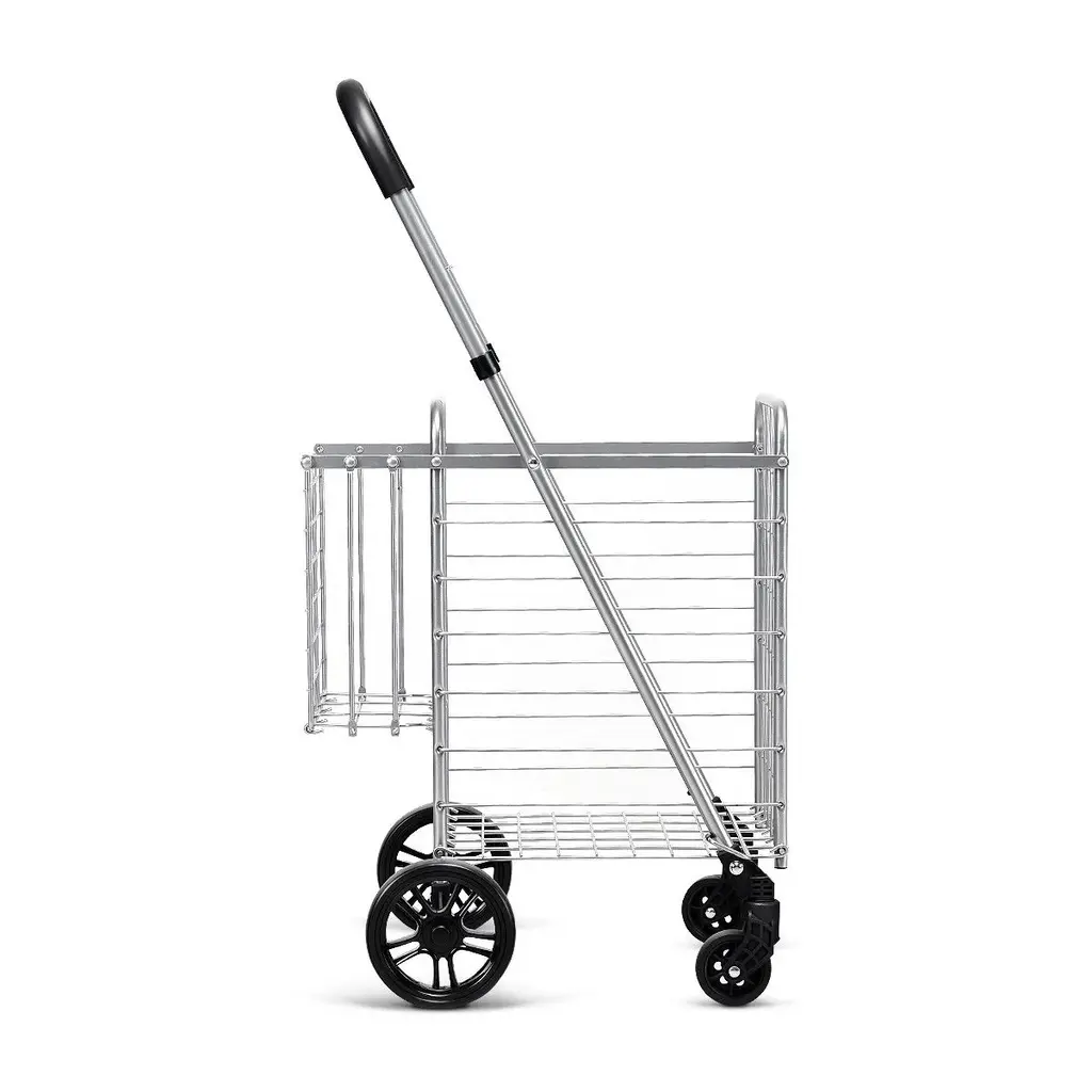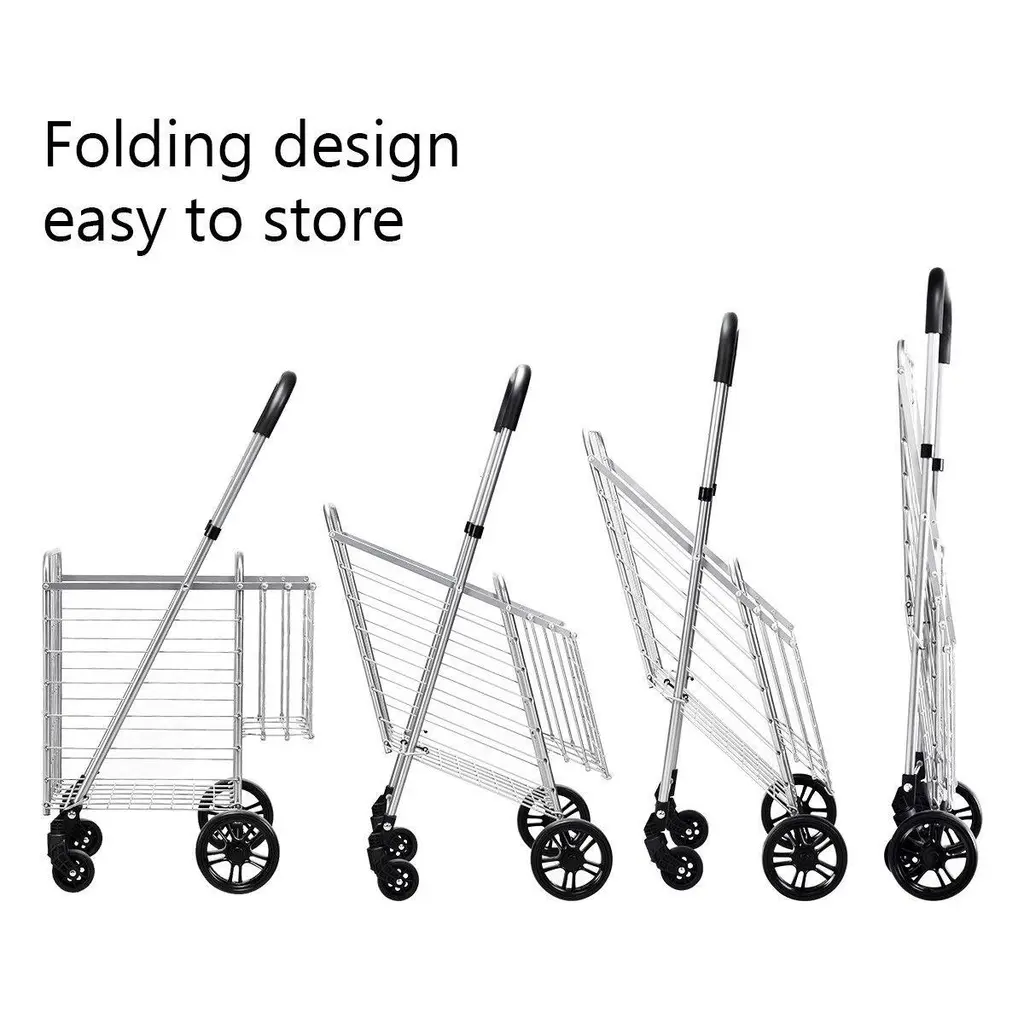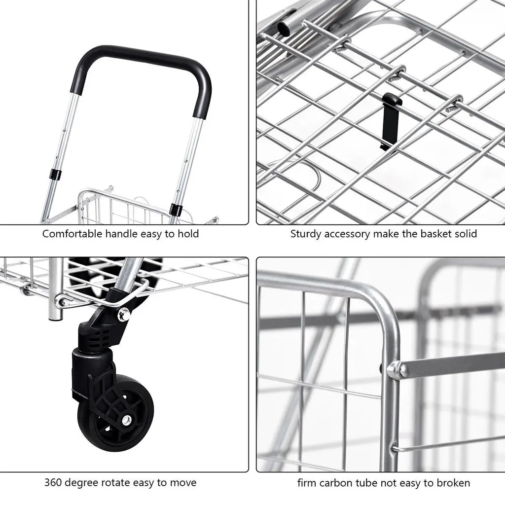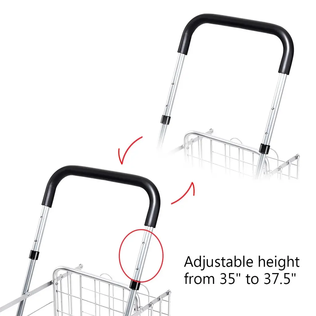 Do you think it's inconvenient to carry a lot of bags when you come back from shopping trip? Now this folding shopping cart will solve your problems. The two basket design allows you to keep your purse, jacket, umbrella, diaper bag or other personal items right in front of you for easy access and secure storage. And with the adjustable handle, you can meet your satisfied height to use this cart. In addition, lightweight and folding features are easy for you to store and carry. Anyway, this sturdy folding utility cart is ideal for anyone on the go. It's perfect for urban and city living, day to day grocery runs, laundry pickup, or everyday hauling. Do not hesitate to buy it now!FeatureTwo basket design provides more space to put things for easy access and secure storage. Small basket for your purse, jacket, umbrella and other personal smaller items Larger primary basket for bigger bulkier cargo Constructed with heavy duty and sturdy carbon tube with good rust resistance Lightweight and folding makes this cart easy to carry and store The handle can be adjusted from 35'' to 37.5'' to meet right height 3'' plastic front wheels provide a sturdy and easily 360 degree rotation 5'' foam rear wheels let you handle any condition with easeMultiple uses for an endless variety of situationsEasy assembly with no tools requirementEasy to assess and cleanPerfect size for public transportationSpecificationColor: Silver/BlackMaterial: carbon tubeProduct dimensions: 17'' x 19'' x 35''/37.5''(L x W x H)Large basket size: 14'' x 12'' x 18'' (L x W x H)Small basket size: 12'' x 5''x 10.5'' (L x W x H)Adjustable height: 35''~ 37.5'' Front wheel diameter: 3'' Rear wheel diameter: 5.5'' Net weight: 8.5 lbs Max weight capacity: 44 lbs Package includes: 1 x shopping cart