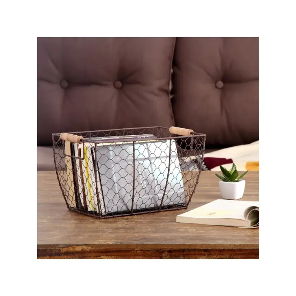 Decorative Brown Chicken Wire Basket with Wood Handles. 12.2x8x7.28
