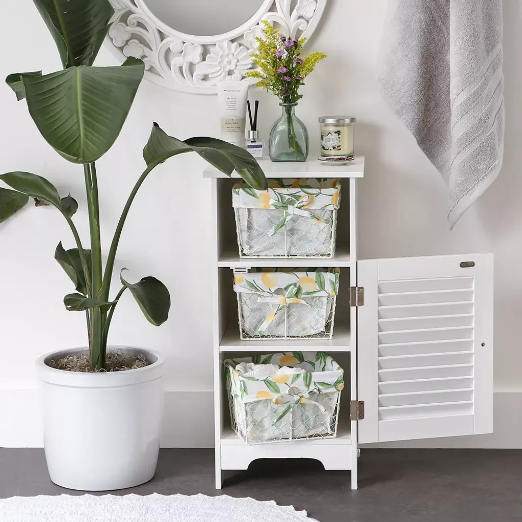 Upgrade your home organization with this set of 3 bronze wire baskets, complete with removable lemon bliss print fabric liners. The set includes a small basket measuring 9 inches in length, 7 inches in width, and 6 inches in height. Fill these versatile baskets with fruits, vegetables, canned foods, baking supplies, cleaners, and whatever else you need to keep organized. They are the perfect storage option for your kitchen, pantry, bathroom, laundry room, kids' rooms, nursery, and more. The poly-cotton blend fabric liners are machine washable and constructed to maintain their size and shape. Simply machine wash them in cold water, tumble dry on low heat, and iron on low if needed. The metal baskets can be easily wiped clean with a soft cloth. Add both style and function to your home with these rustic farmhouse wire baskets. Their cleverly designed slightly tapered shape allows for easy nesting and effortless storage. Discover our full range of trend-based designs, offering fresh and innovative lines of quality home products for every season.