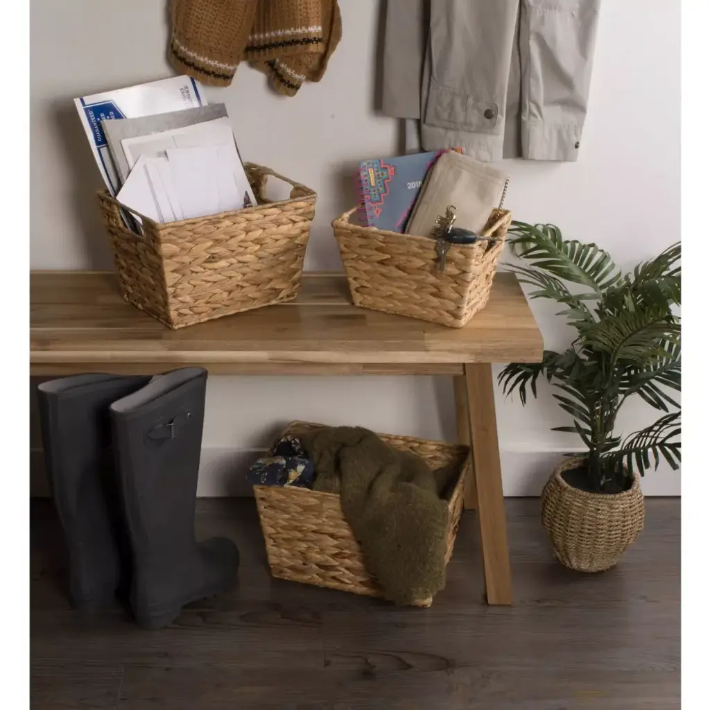 Enhance your home organization with this set of hyacinth storage baskets. The set includes one small 9x7x6 inches, one medium 11x9x7 inches, and one large 17.9x13x7.88 inches basket, offering versatile storage options. Crafted with a strong woven design and convenient carrying handles, these baskets ensure easy transportation of your belongings. The refreshing design and subtle texture of these baskets make them not only functional but also stylish decorative pieces for any room. Suitable for storing a wide range of household items, these decorative storage baskets are a practical addition to your home. Whether you need to organize clothing, accessories, beauty products, toys, letters, paperwork, or general household items, these multi-purpose baskets have you covered. Made from durable water hyacinth with a sturdy frame, these baskets are built to last. With integrated insert handles, lifting and moving these baskets is a breeze. Discover the perfect blend of functionality and timeless style with these charming hyacinth storage baskets.