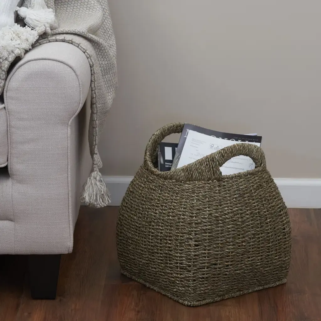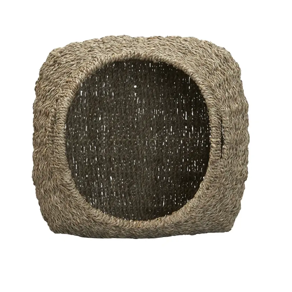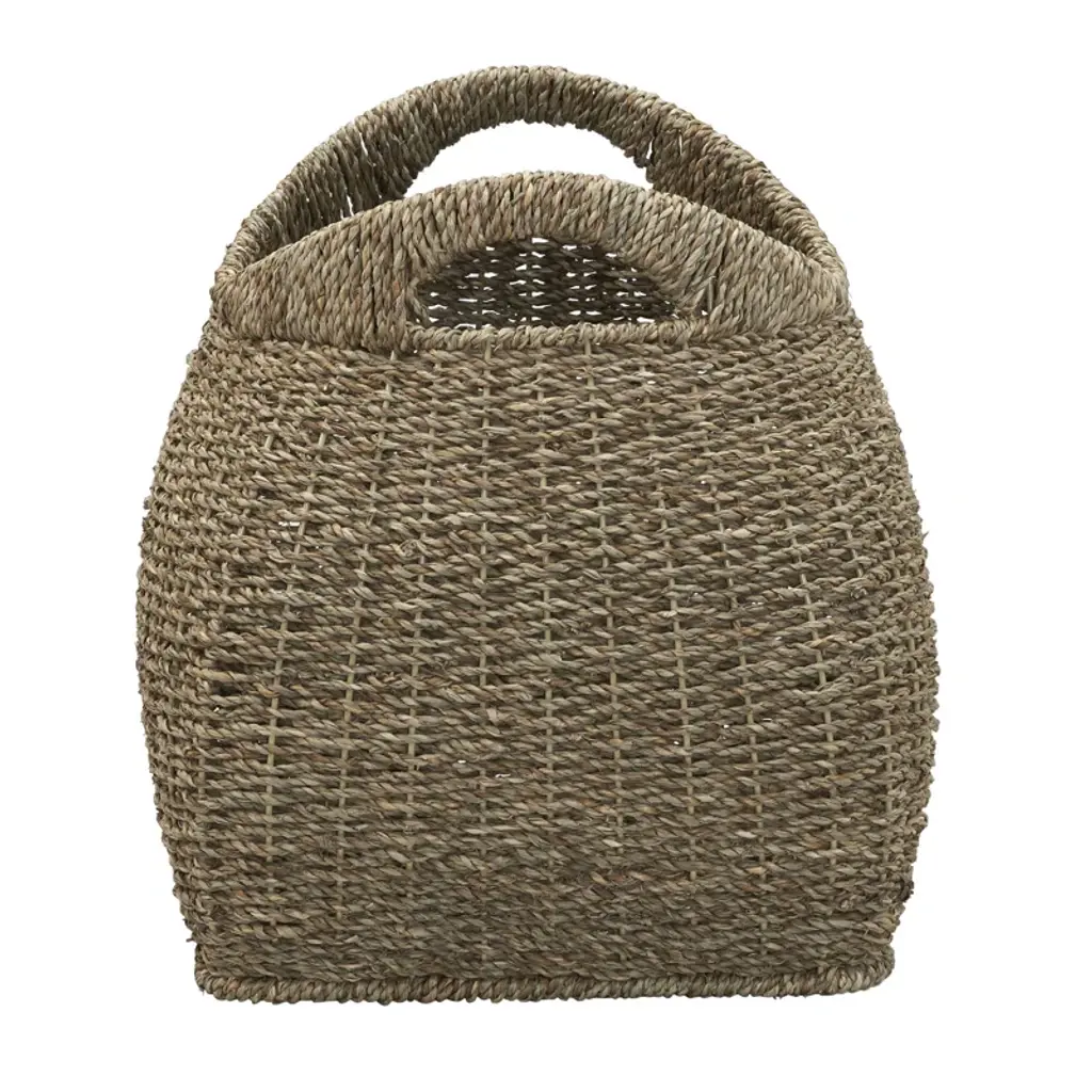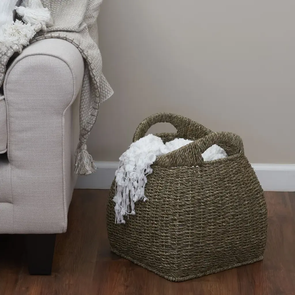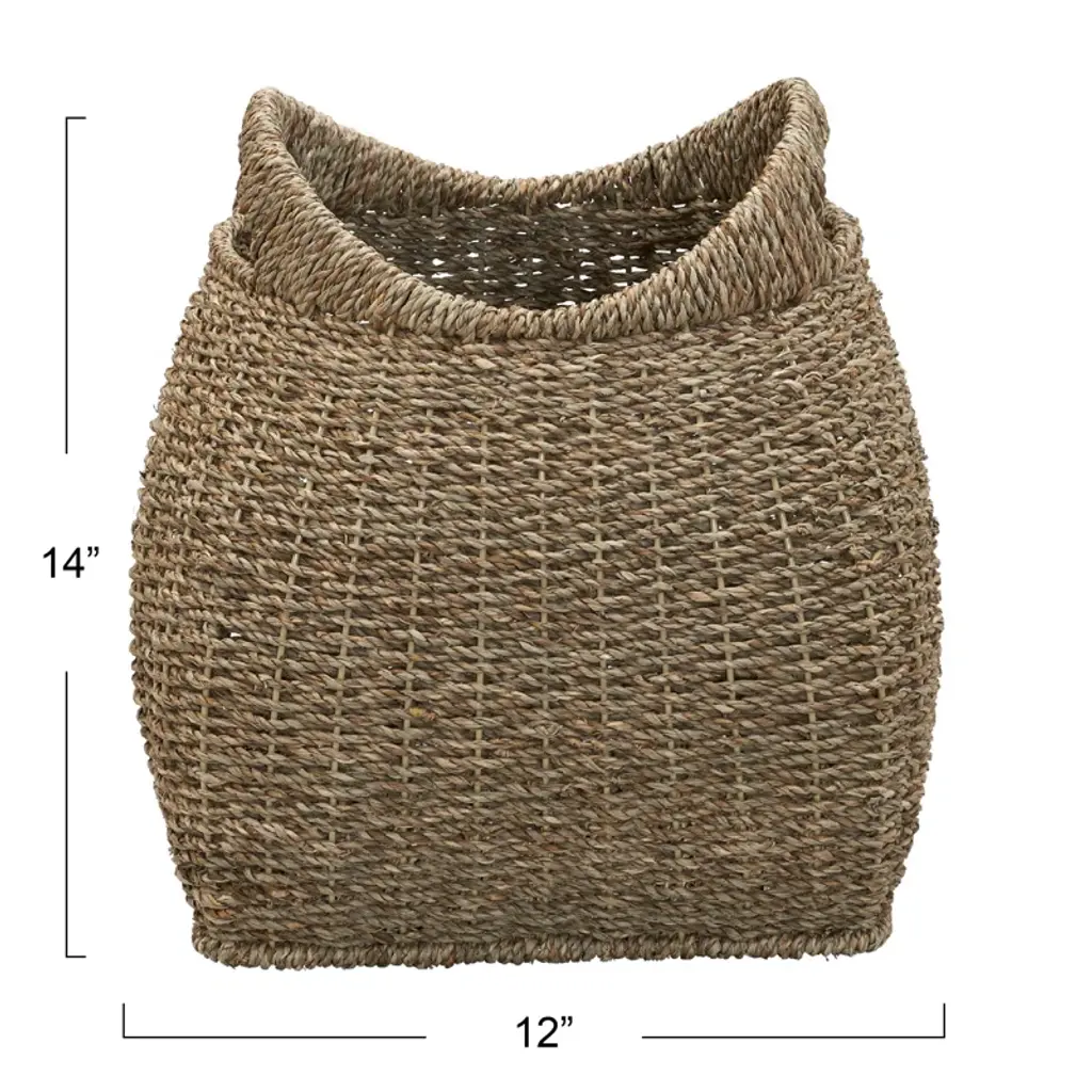 This stunning, organically woven storage basket will transform any bedroom or living space by stylishly stowing away sweaters, textiles, or bits and baubles. Neatly corral any bulky, rarely used, or unsightly household items in the ample storage space, and utilize the sleek, integrated handles for easy mobility. Timeless detailing and natural appeal will carry this sophisticated storage piece through every home refresh. The storage basket is made from natural seagrass and metal and measures 12" W x 12" D x 14" H. Structured metal frame ensures the strength and longevity of the piece.