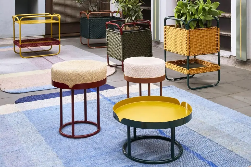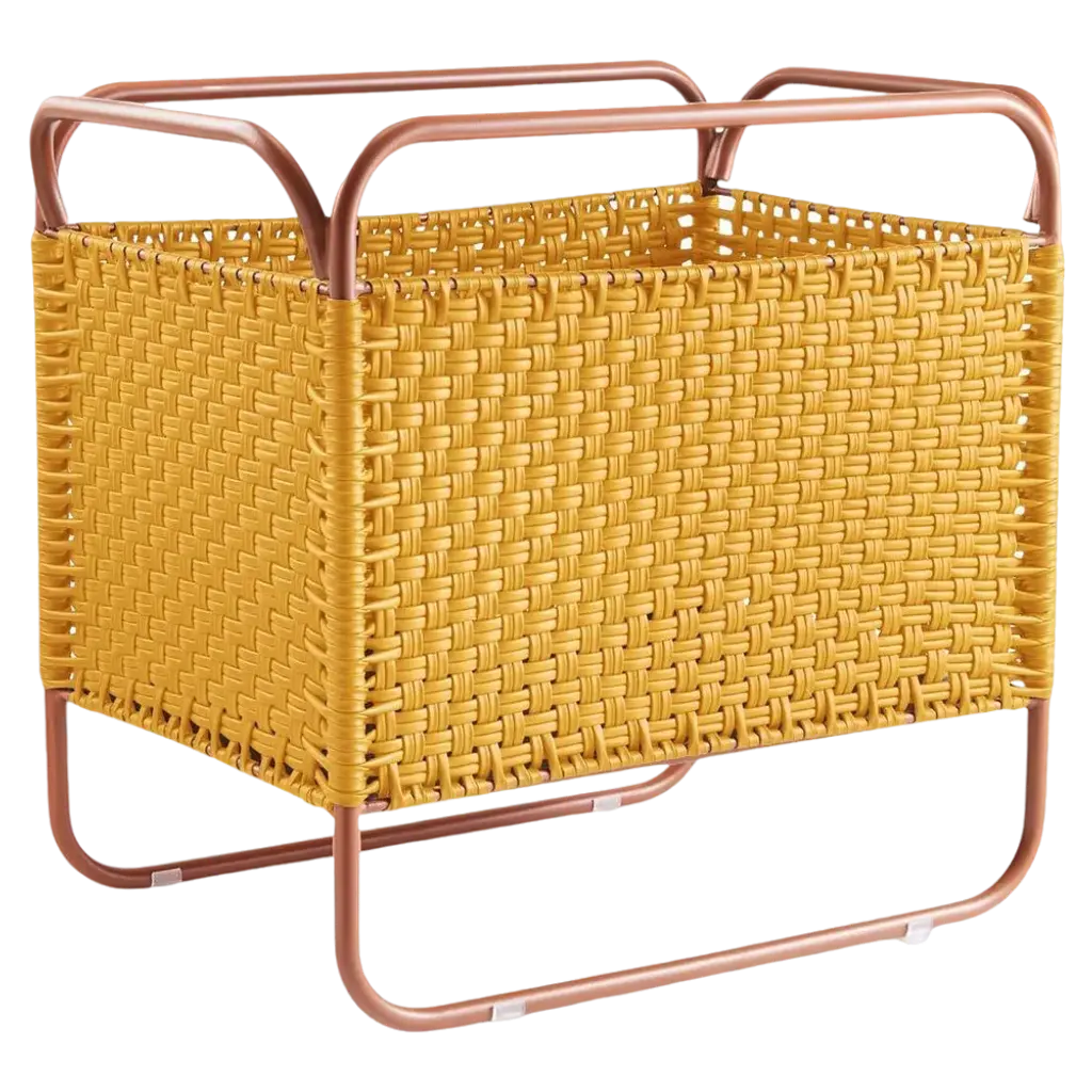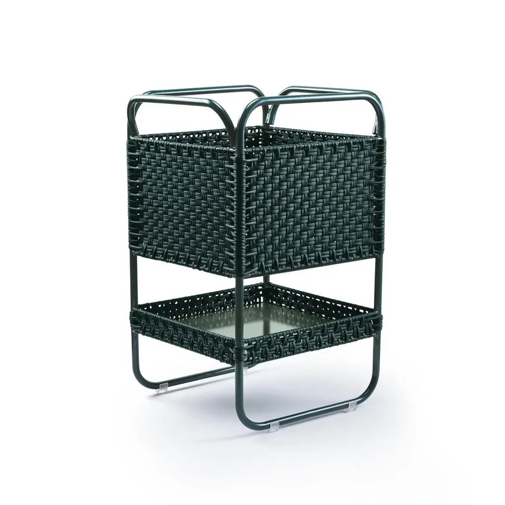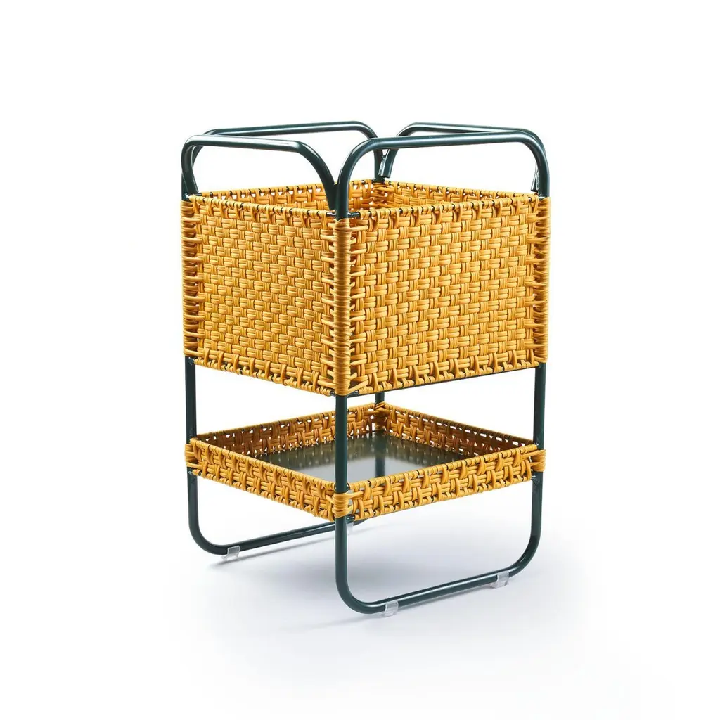 Dichas basket III by Cristina Celestino. Materials: PVC strings made from recycled plastic, steelDimensions: D 38 x W 38 x H 65 cm Available in colors: moss green/black red, moss green/honey yellow, moss green/moss green. Available in other sizes.The Dichas Baskets, designed by Cristina Celestino, add a joyful pop of colour to any room. Their design combines a simple steel frame with ornaments hand-woven with PVC strings made from recycled plastic. These compact units can be used as handy side tables, smart planters or elegant storage for cushions, glasses or towels. “With Dichas, I wanted to create a collection of versatile storage pieces that can travel through different rooms of the house – and they can even find a place outdoors”, says the Italian designer about the series.Cristina Celestino is one of the most prolific contemporary Italian designers. Her products and interiors share a softness, often defined by curved lines, a love for pastel hues, and subtle links to Italy's rich design heritage. She graduated from the school of architecture at IUAV University of Venice in 2005 and started working as an interior and furniture designer.